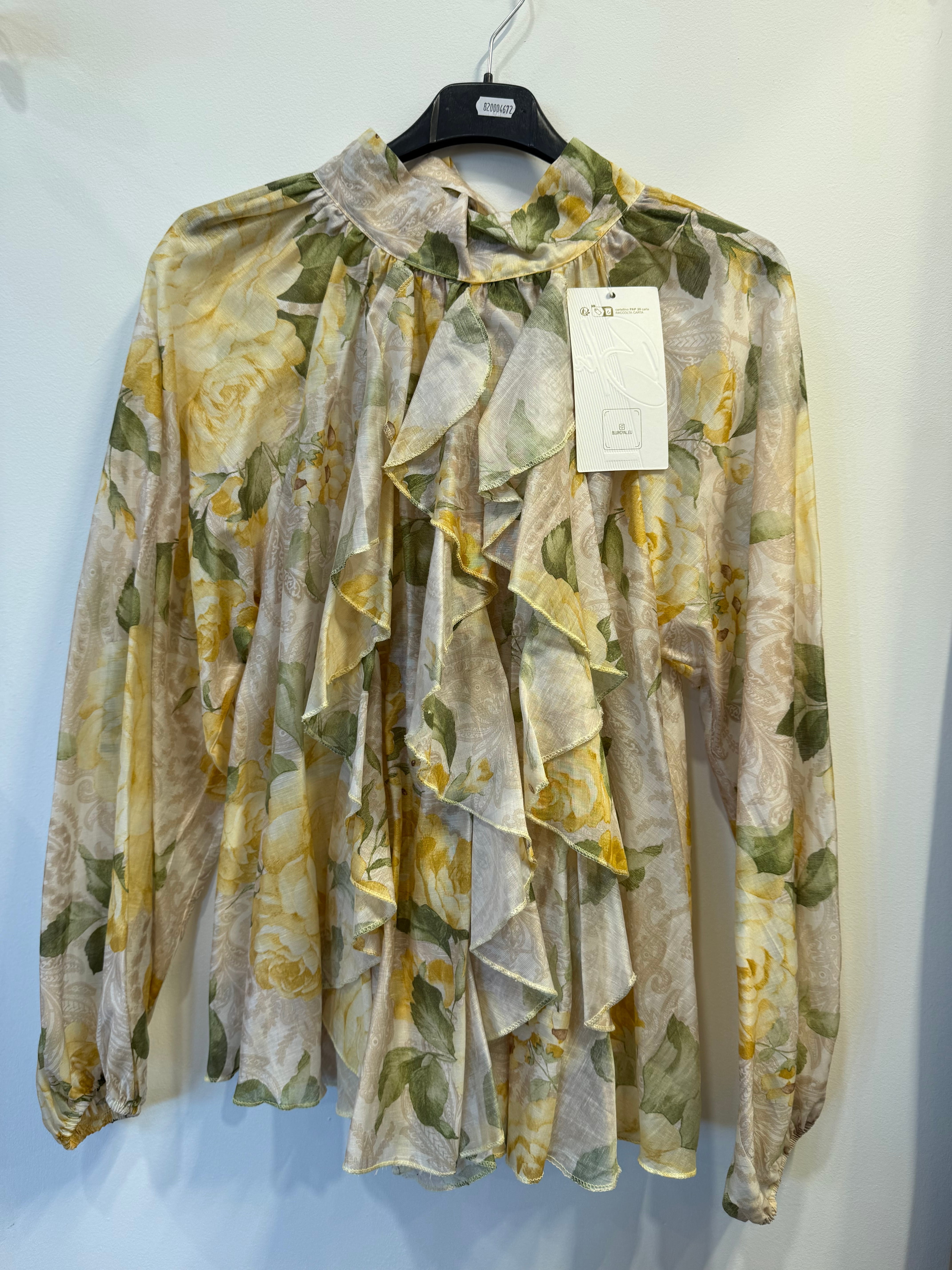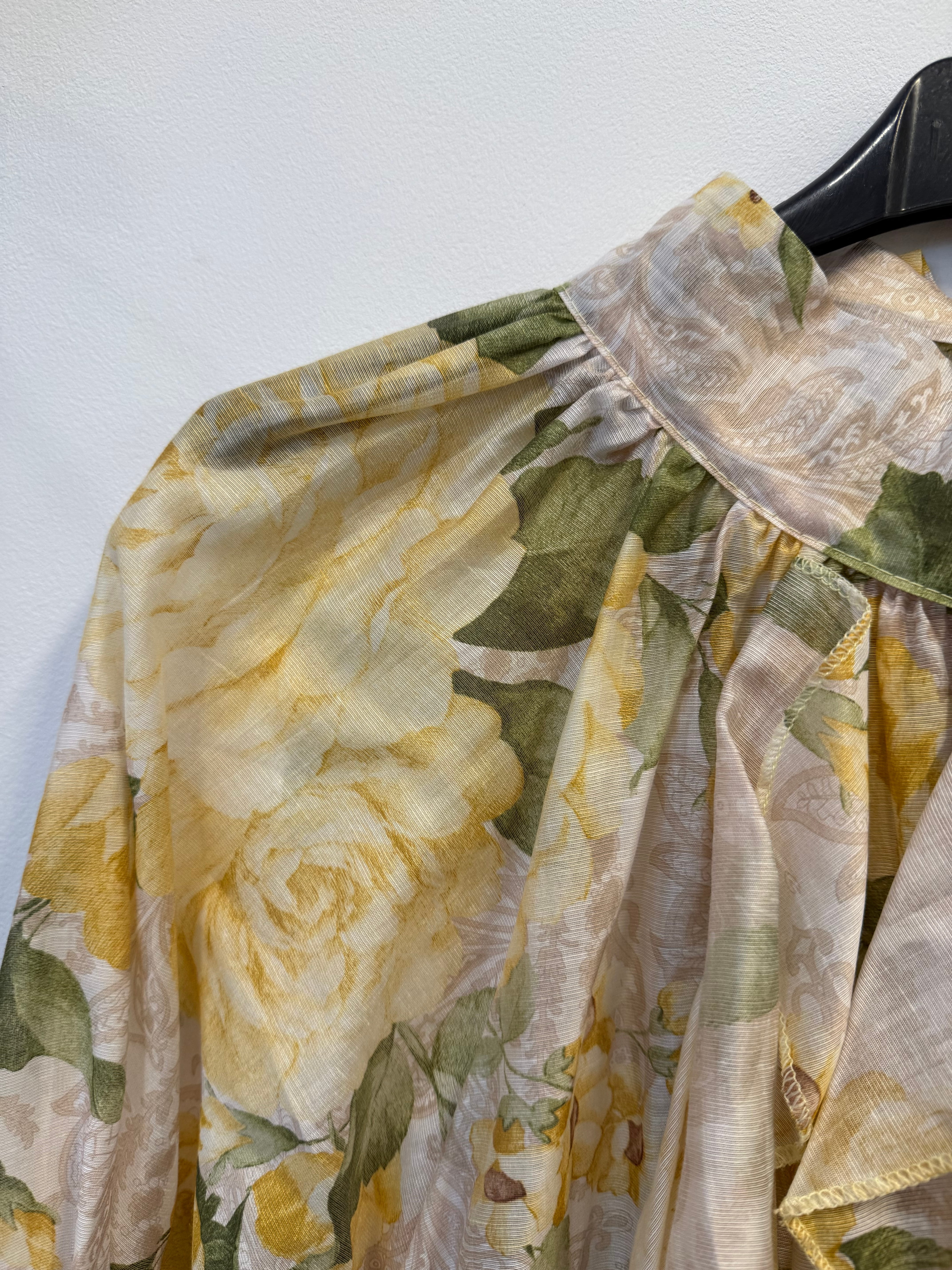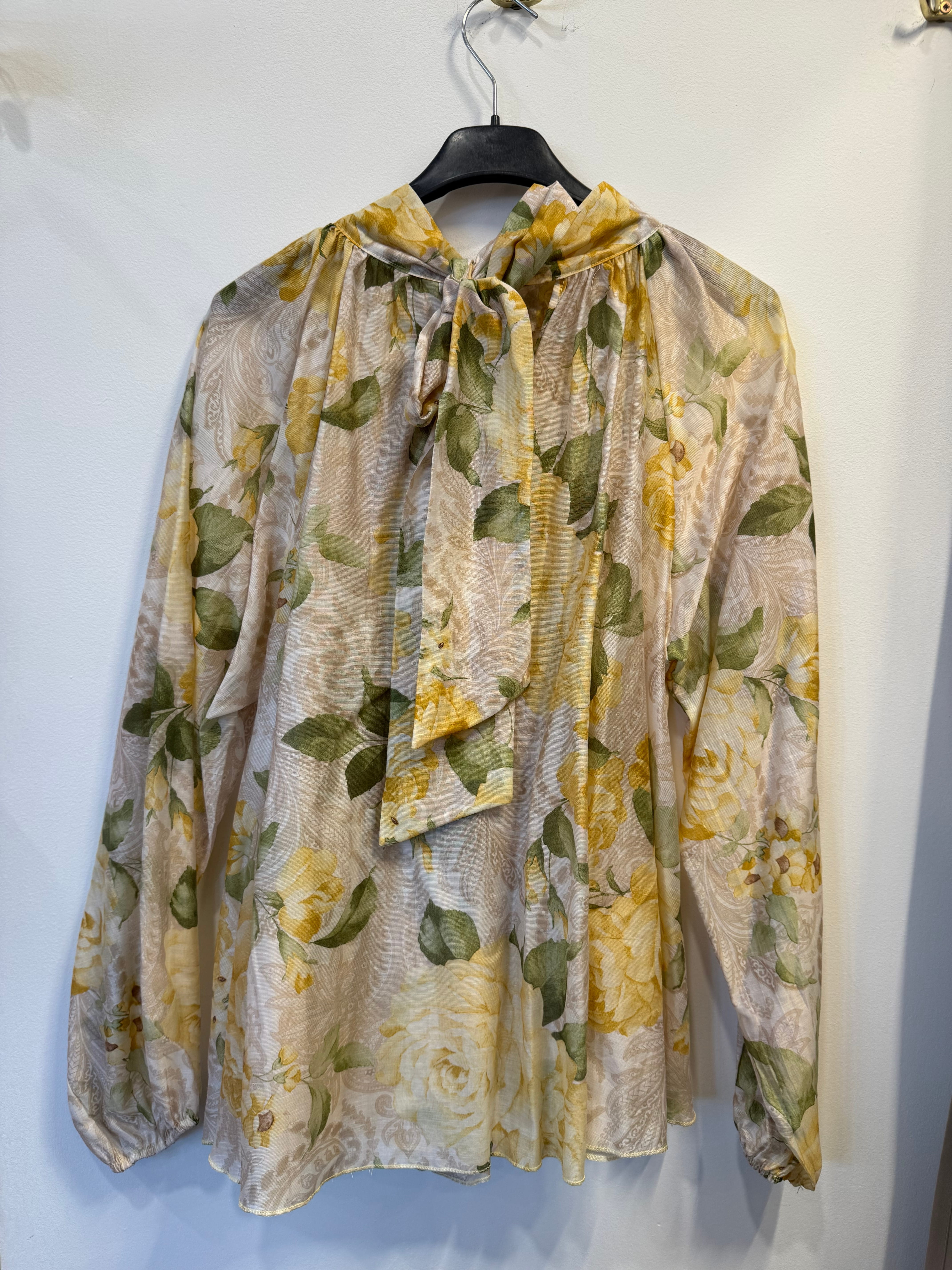 Bluzka Provence tencel, len, szyfonowa beżowo-żółta w kwiaty, ze stójką, falbanami na dekolcie/żabotem, wiązaniem z tyłu