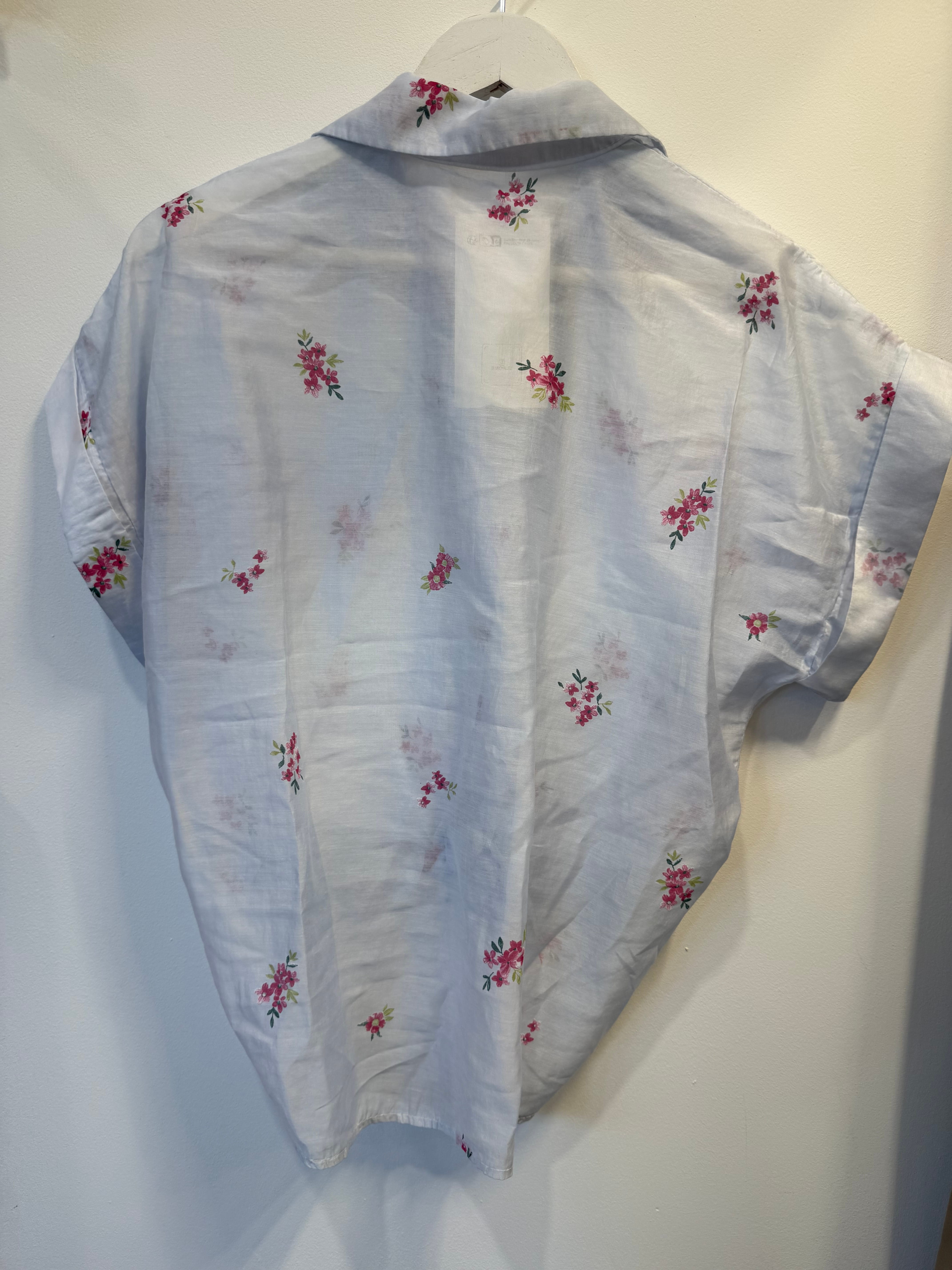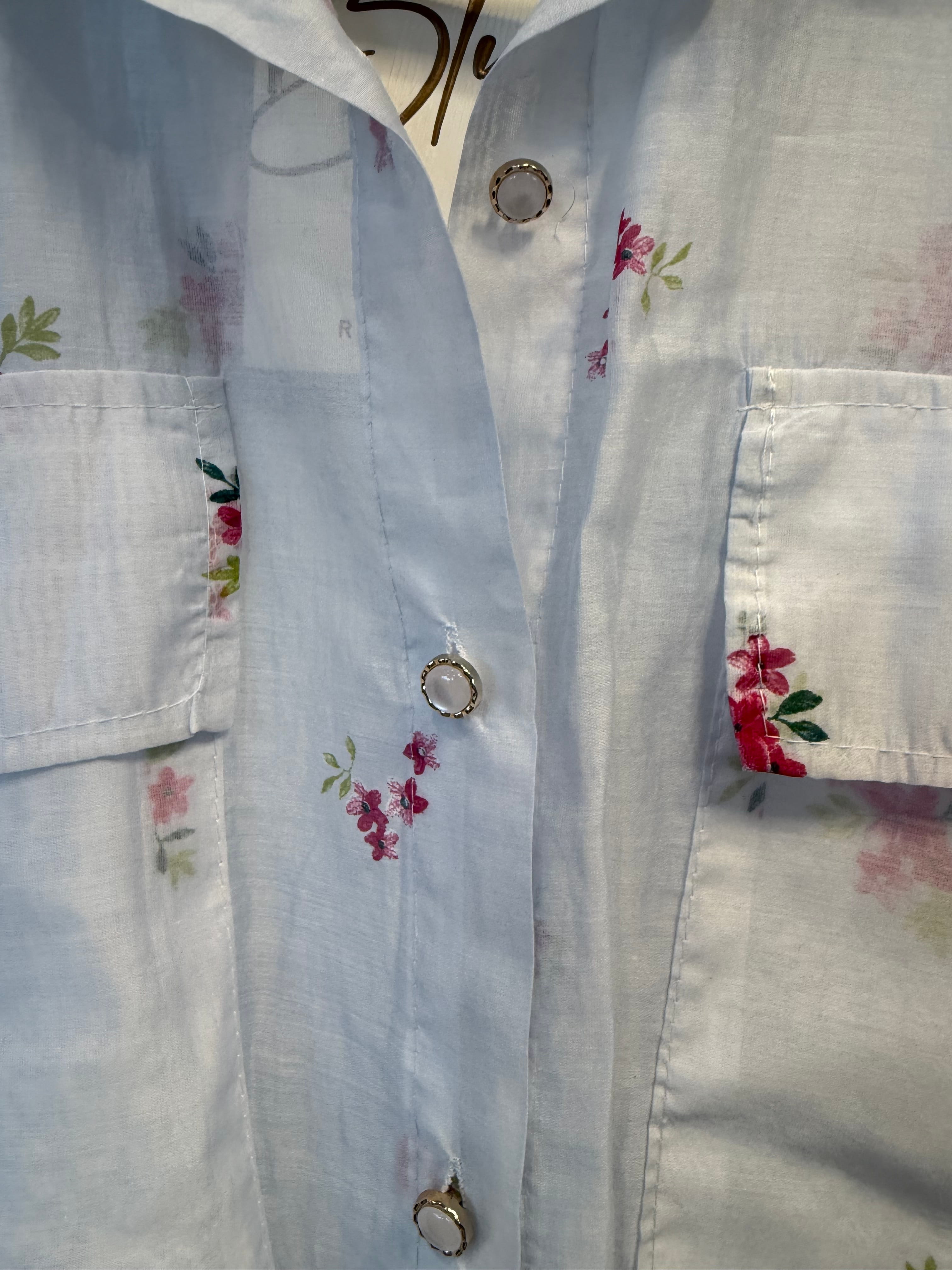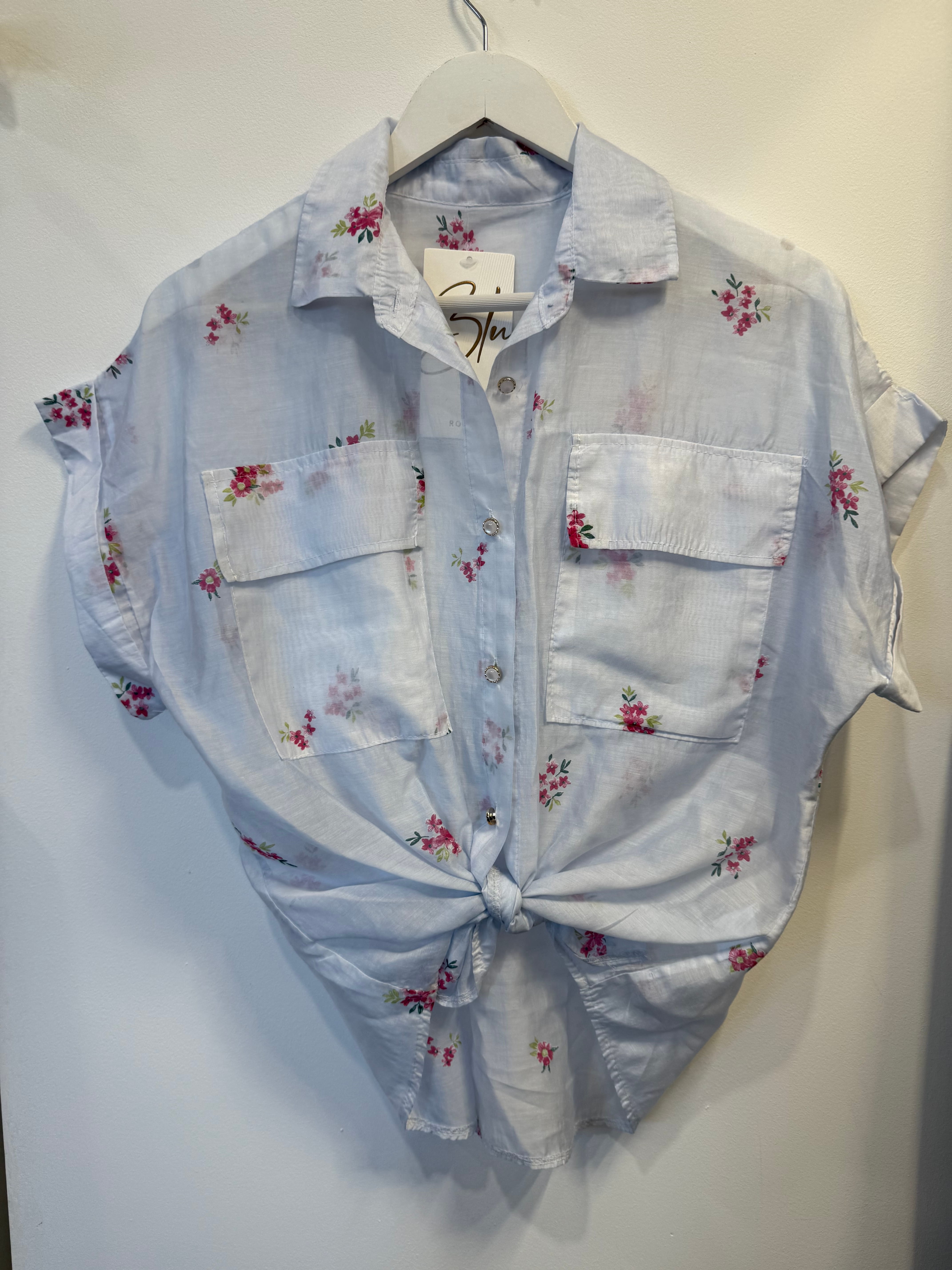Bluzka koszulowa Cherry Blossom błękitna w różowe kwiatki, tencel