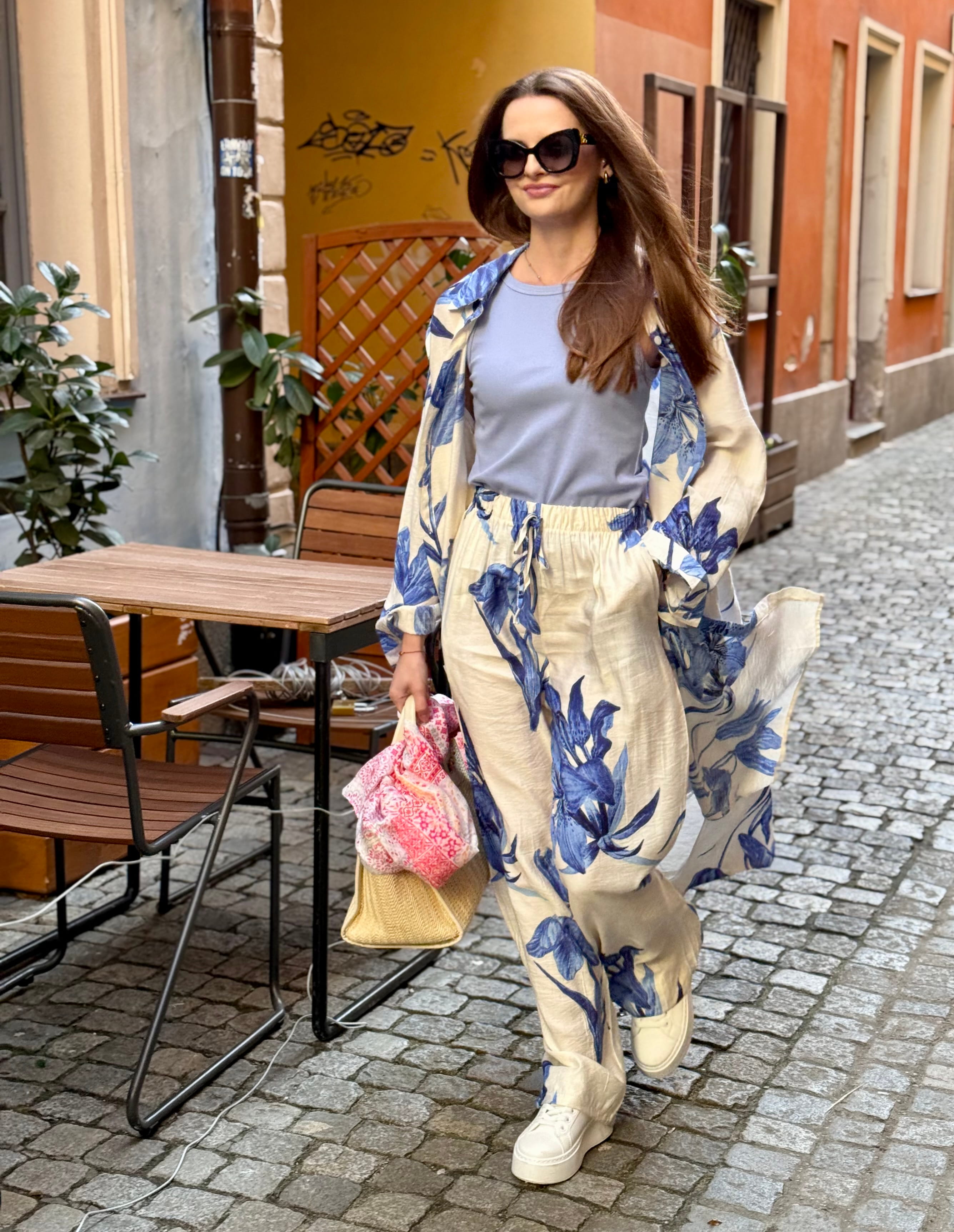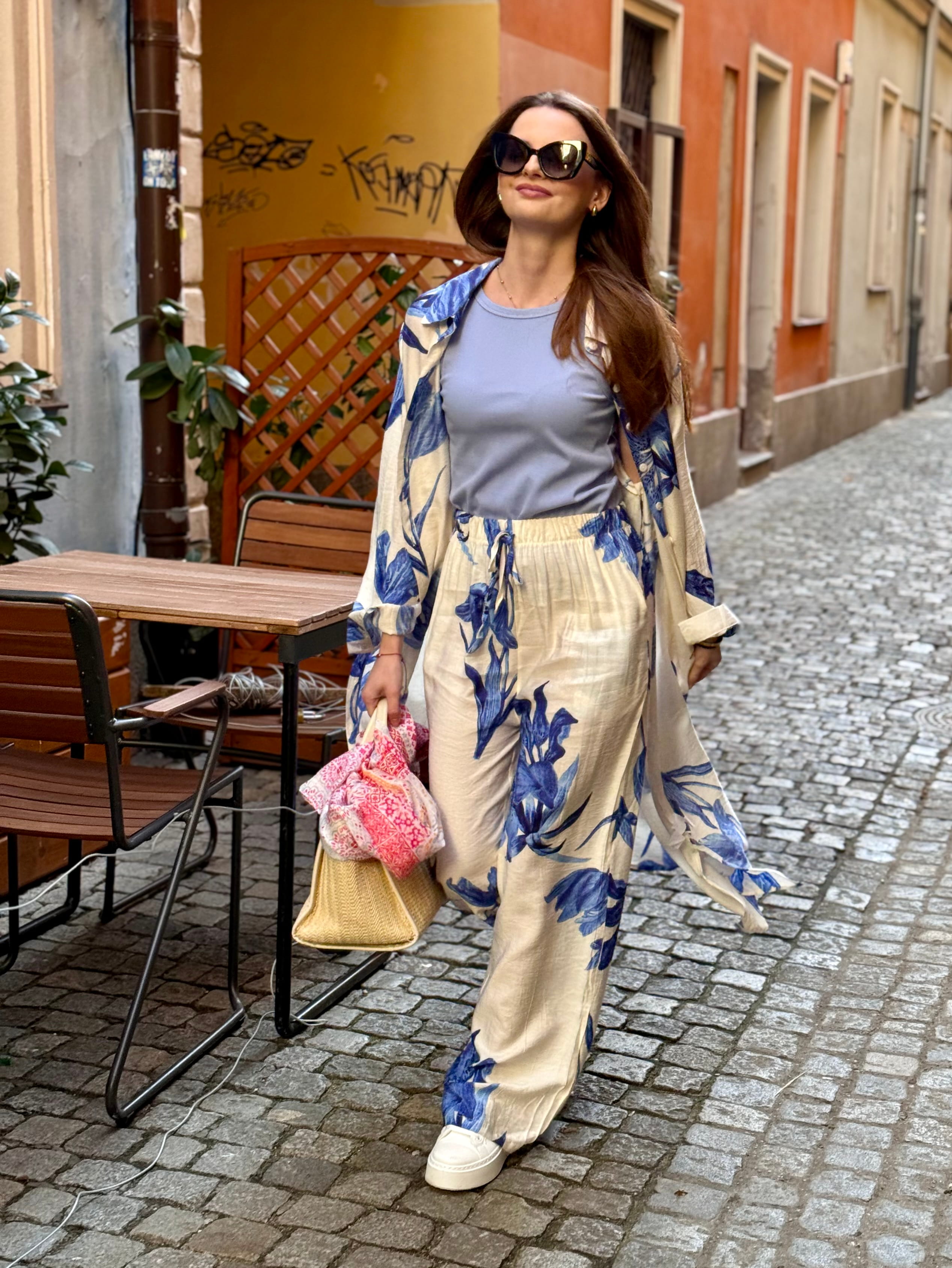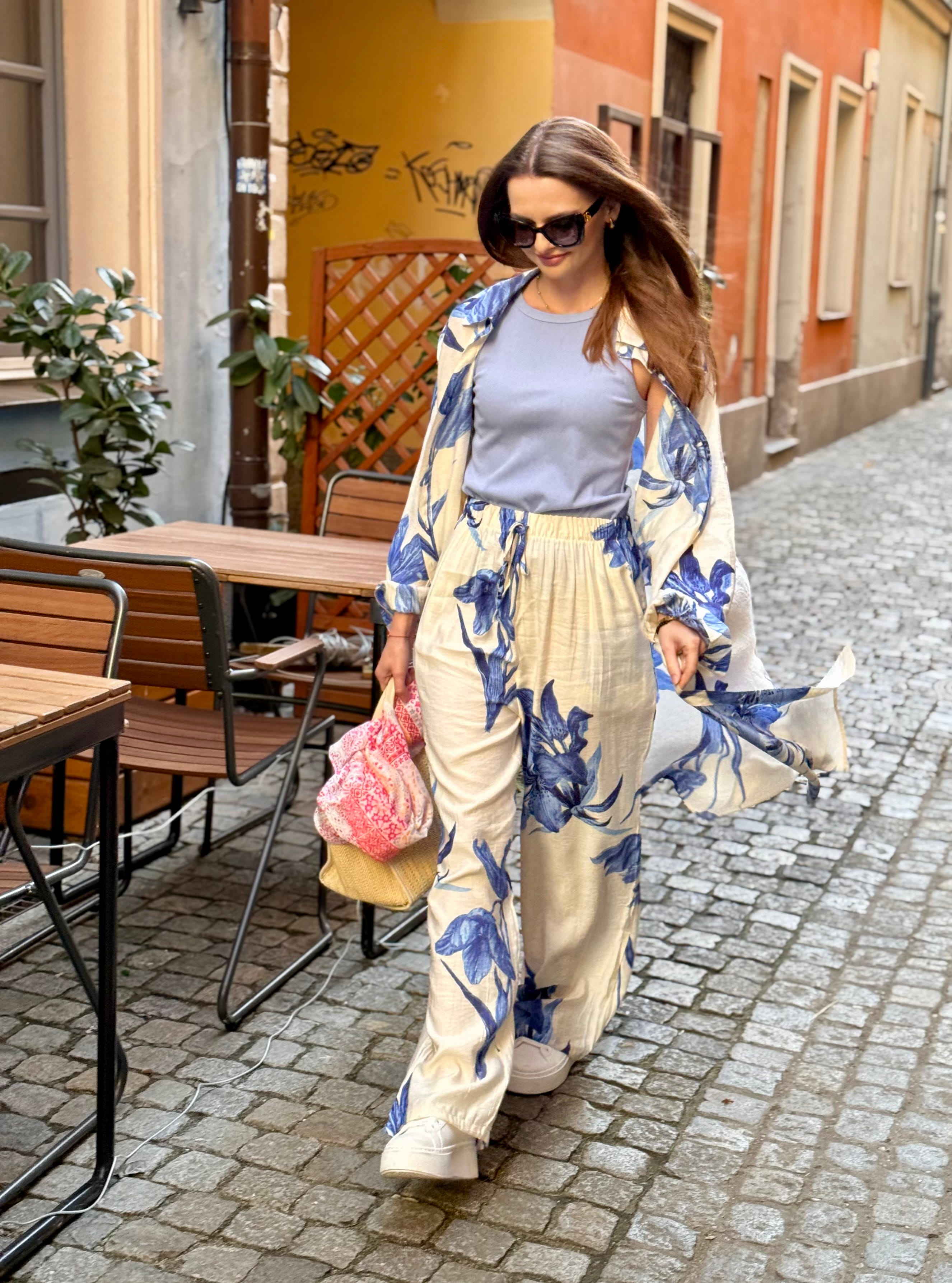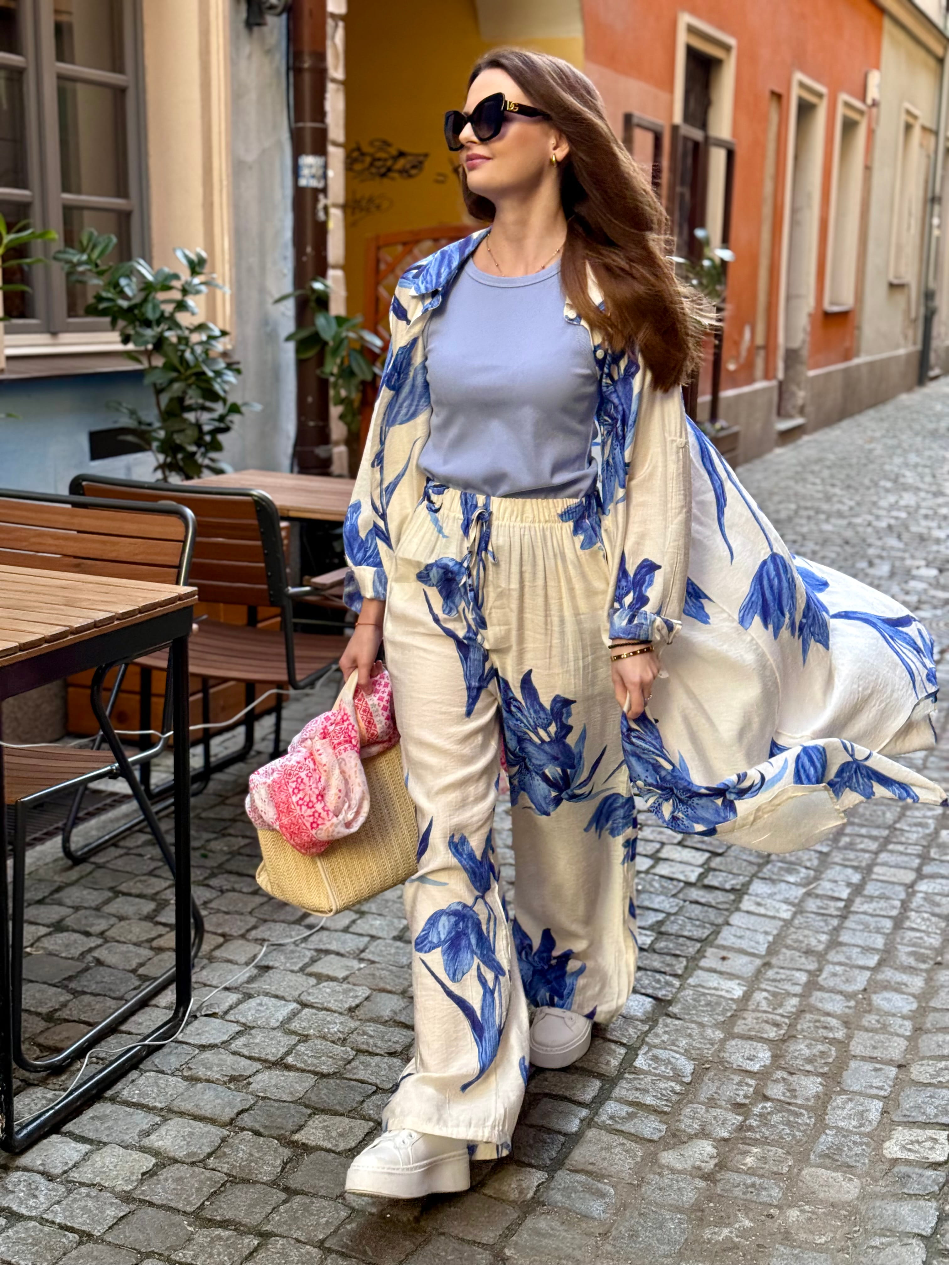 Komplet Costa Brava bawełniany narzutka rozpinana długa / sukienka + spodnie szersze kremowe w niebieskie kwiaty
