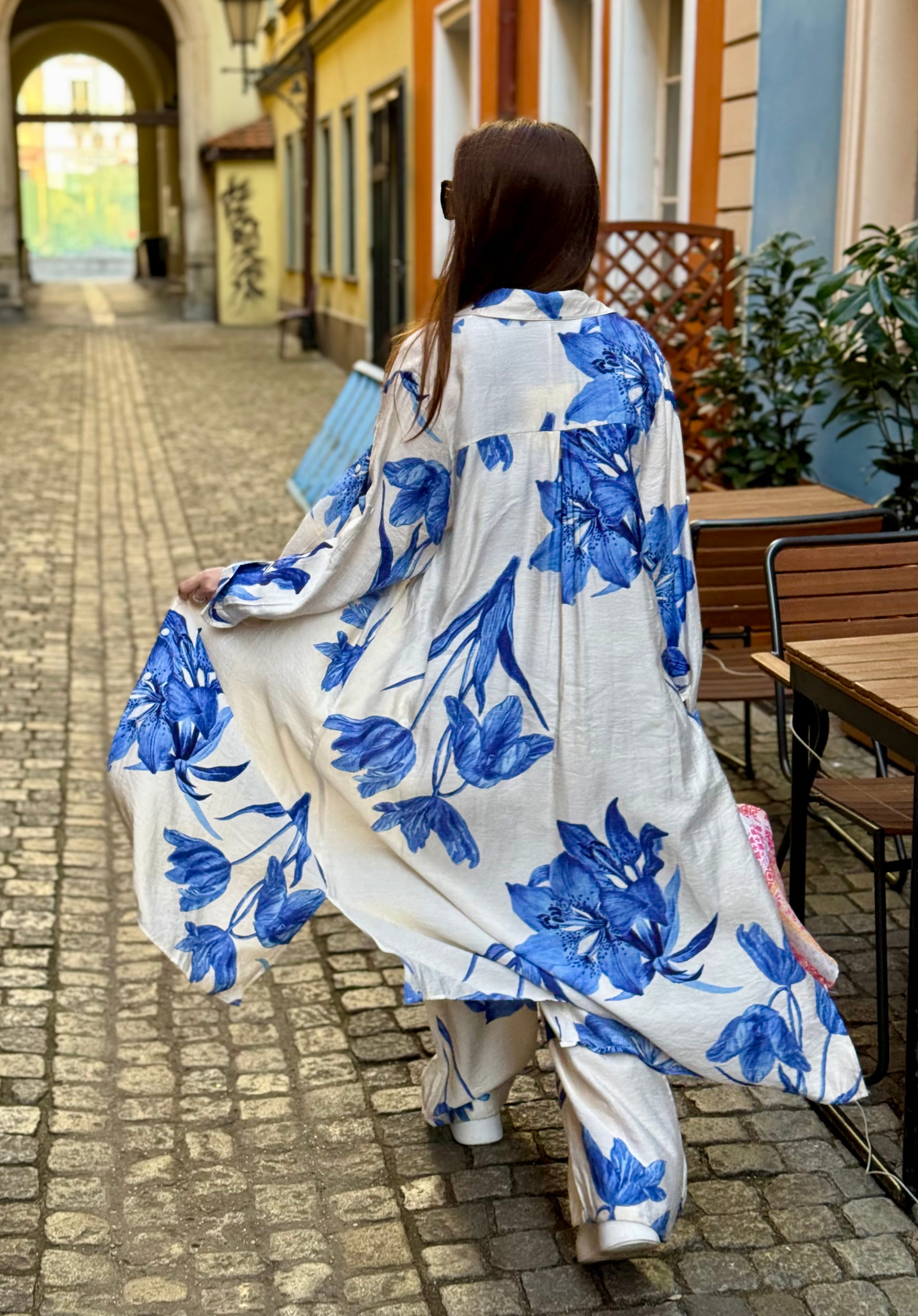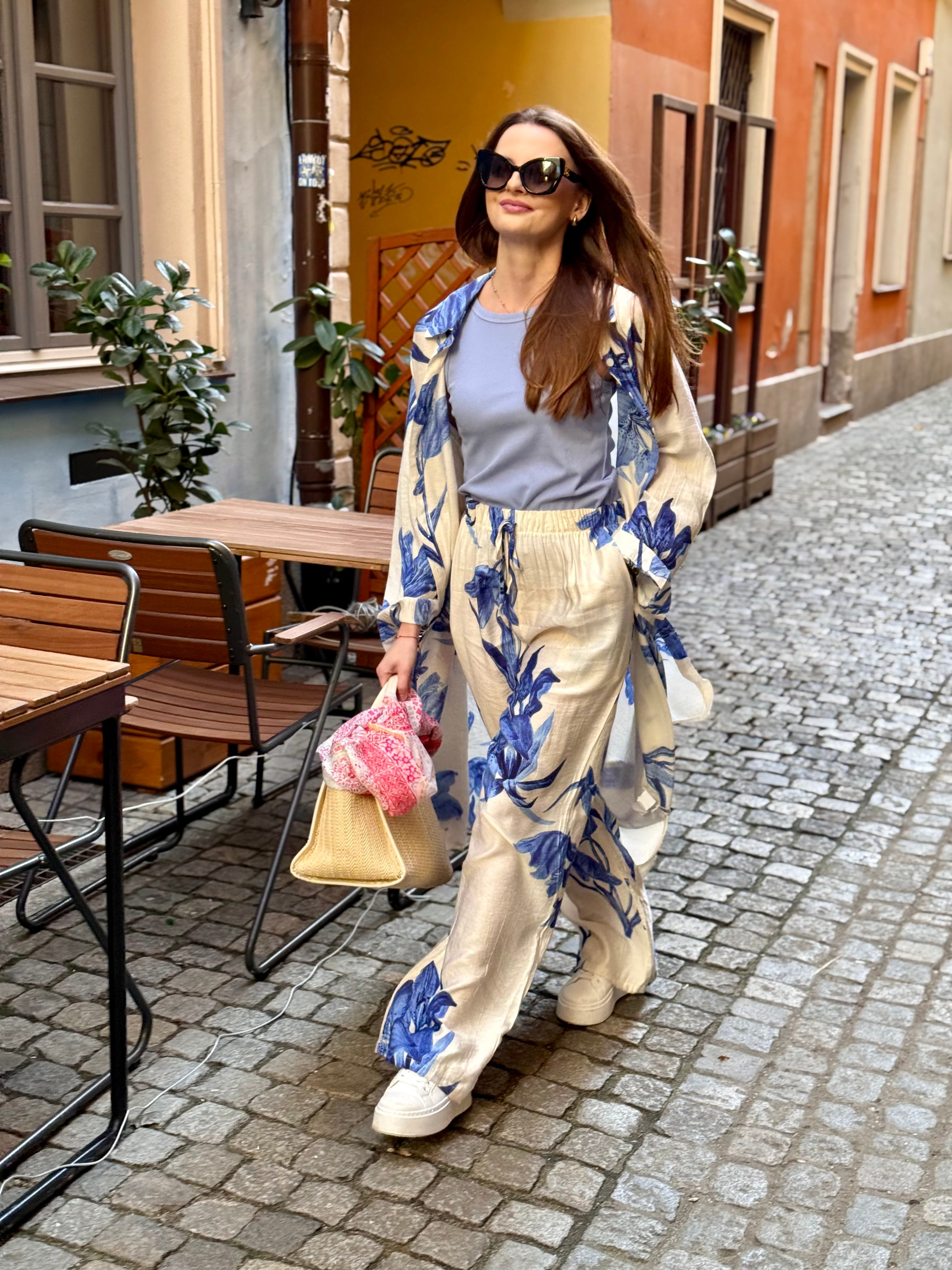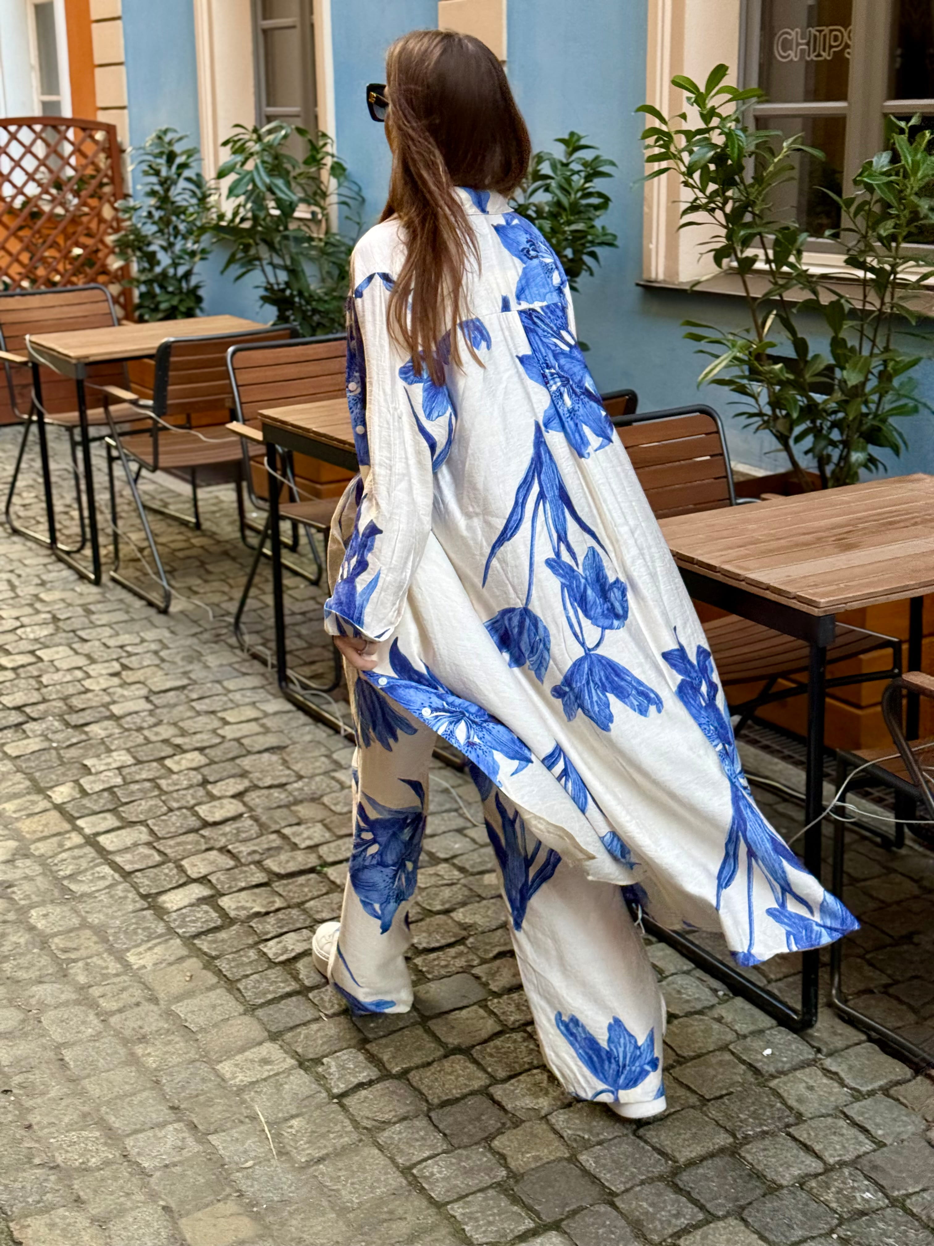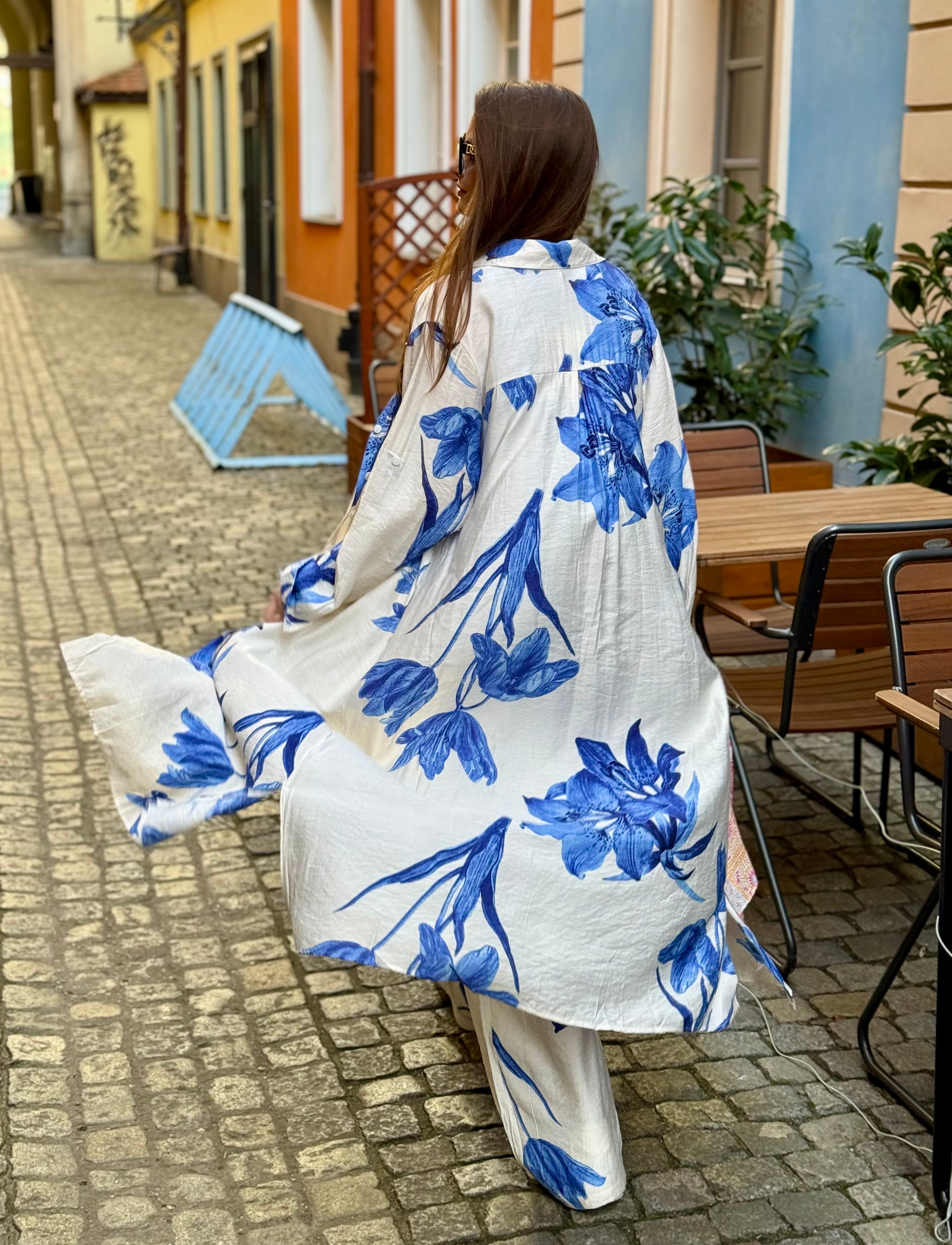 Komplet Costa Brava bawełniany narzutka rozpinana długa / sukienka + spodnie szersze kremowe w niebieskie kwiaty