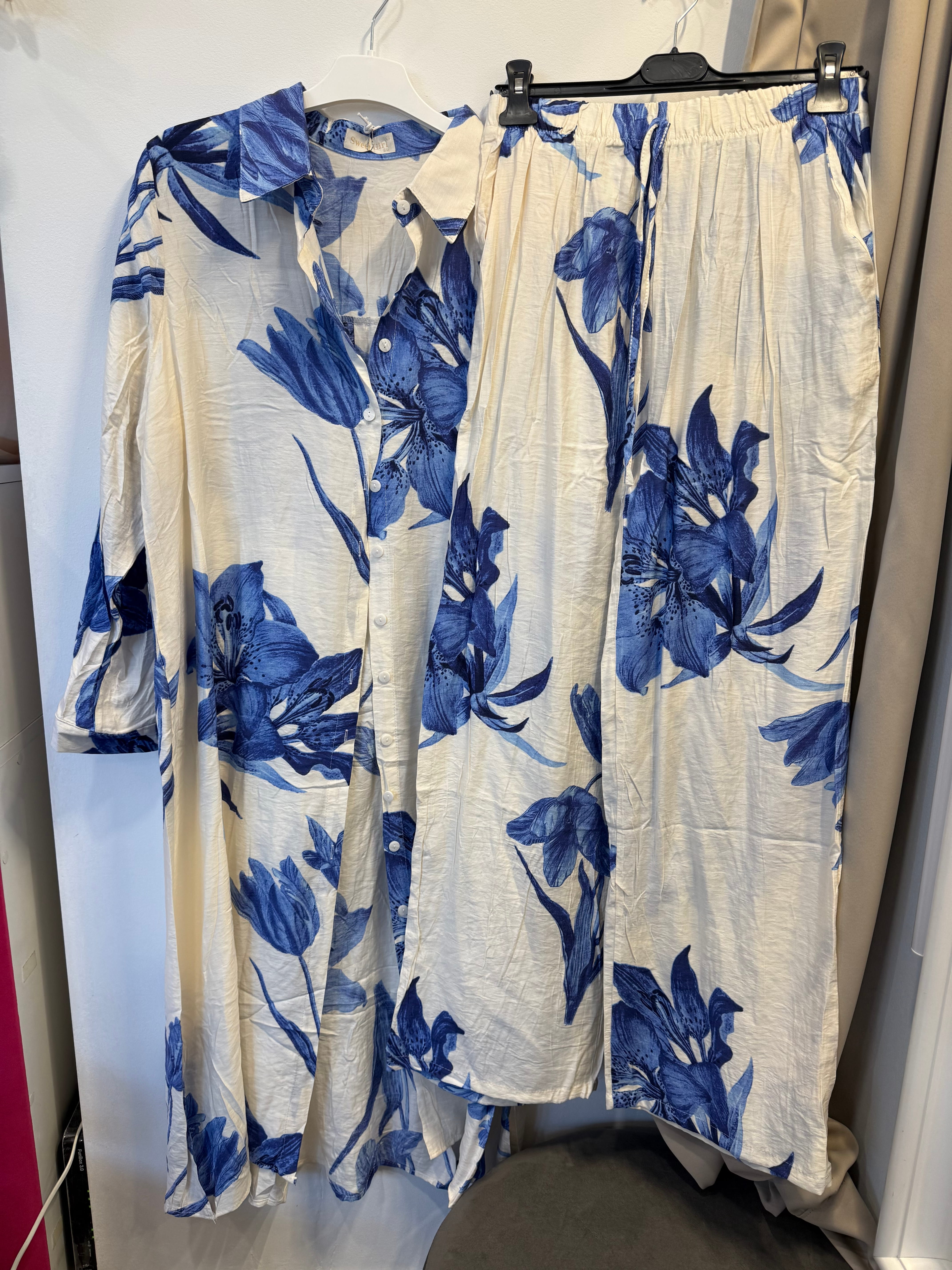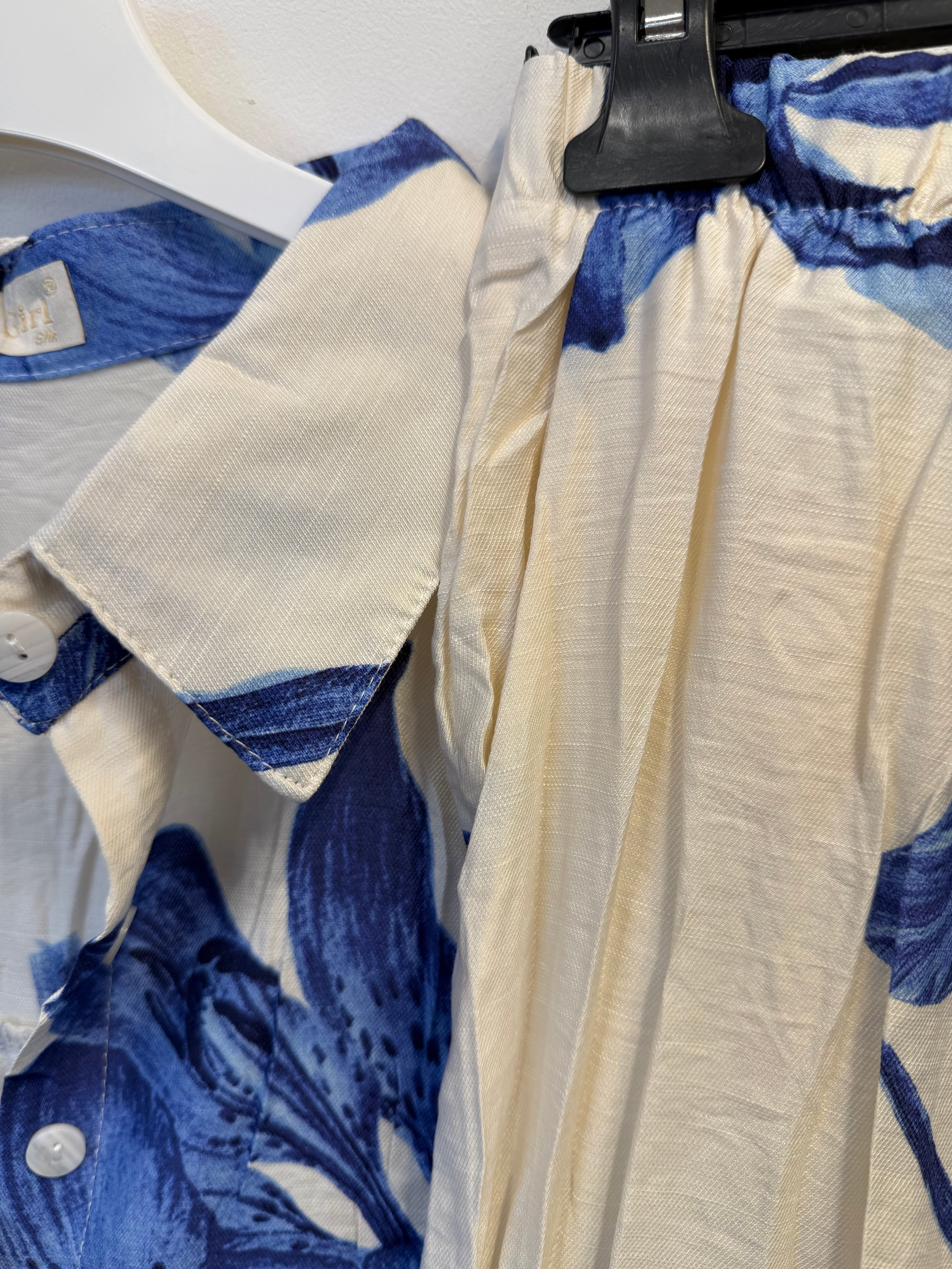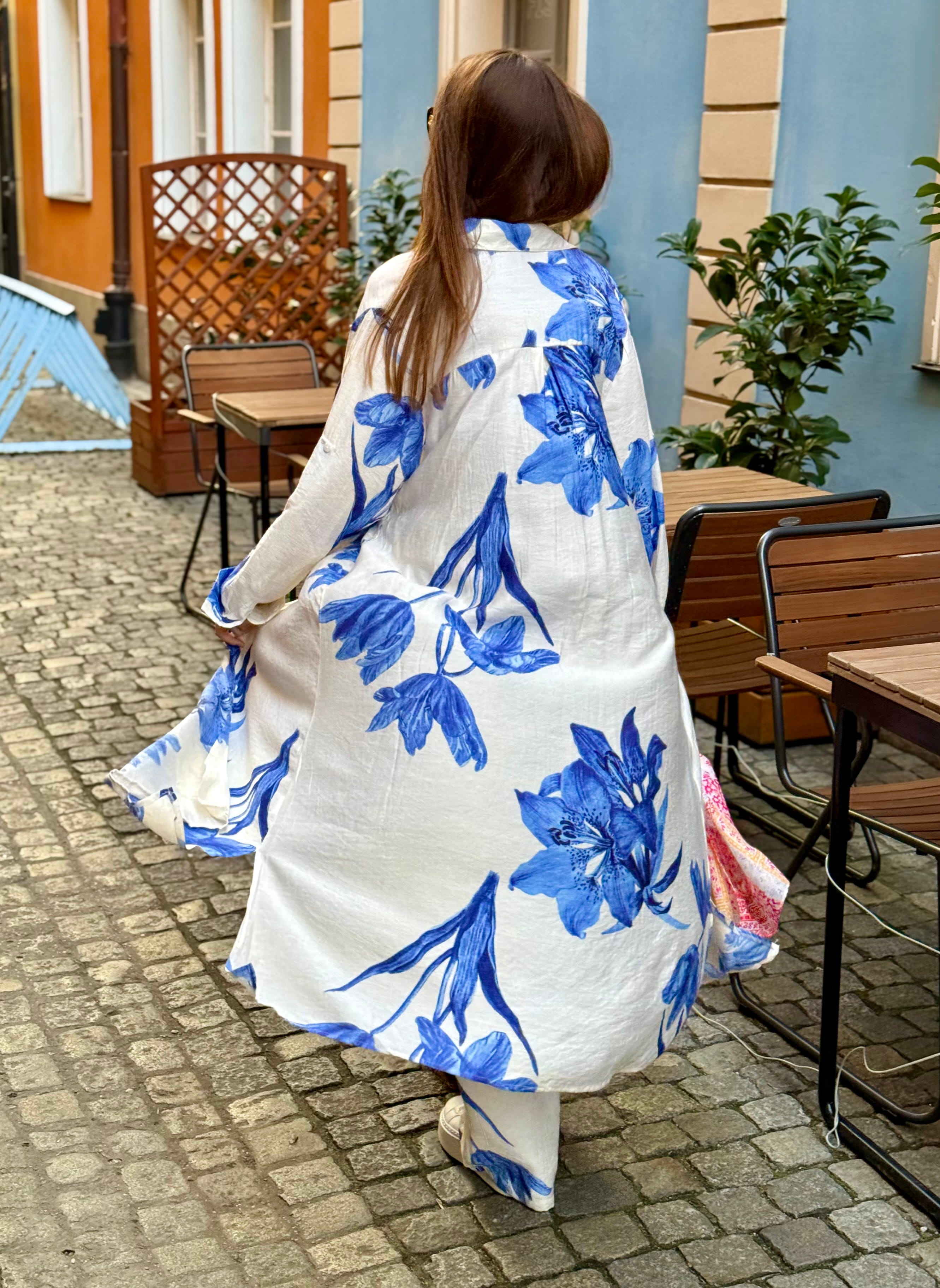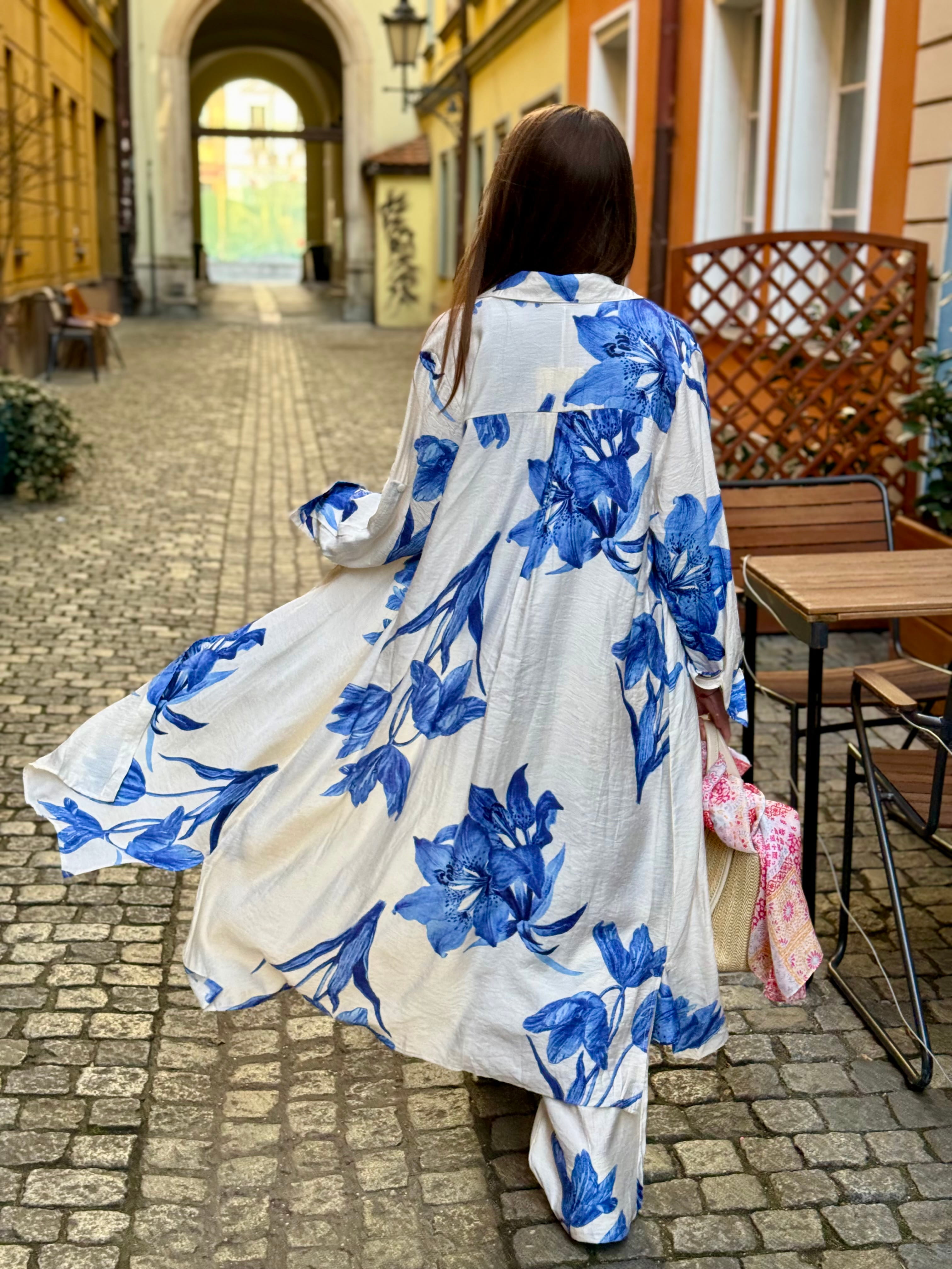Komplet Costa Brava bawełniany narzutka rozpinana długa / sukienka + spodnie szersze kremowe w niebieskie kwiaty