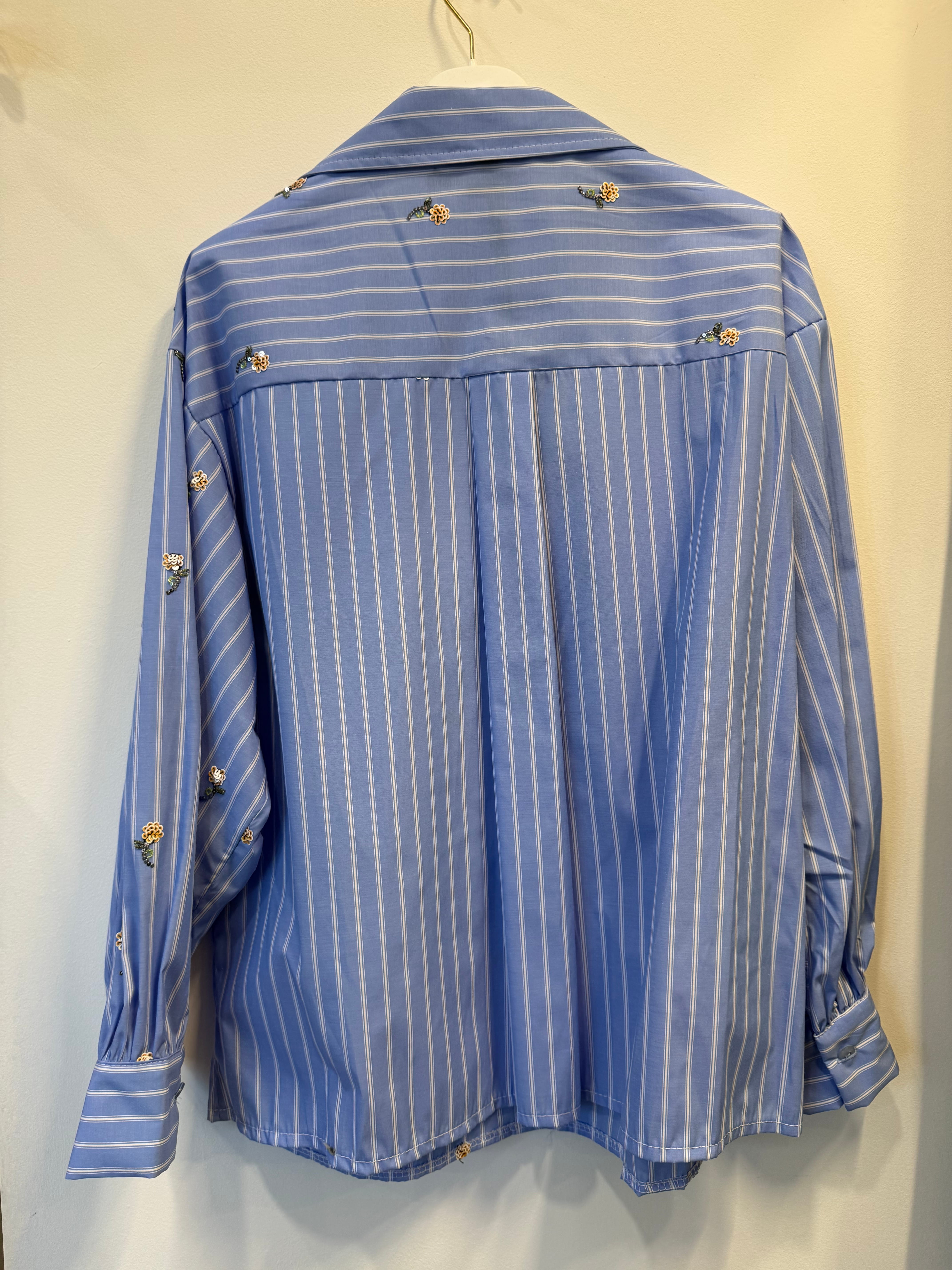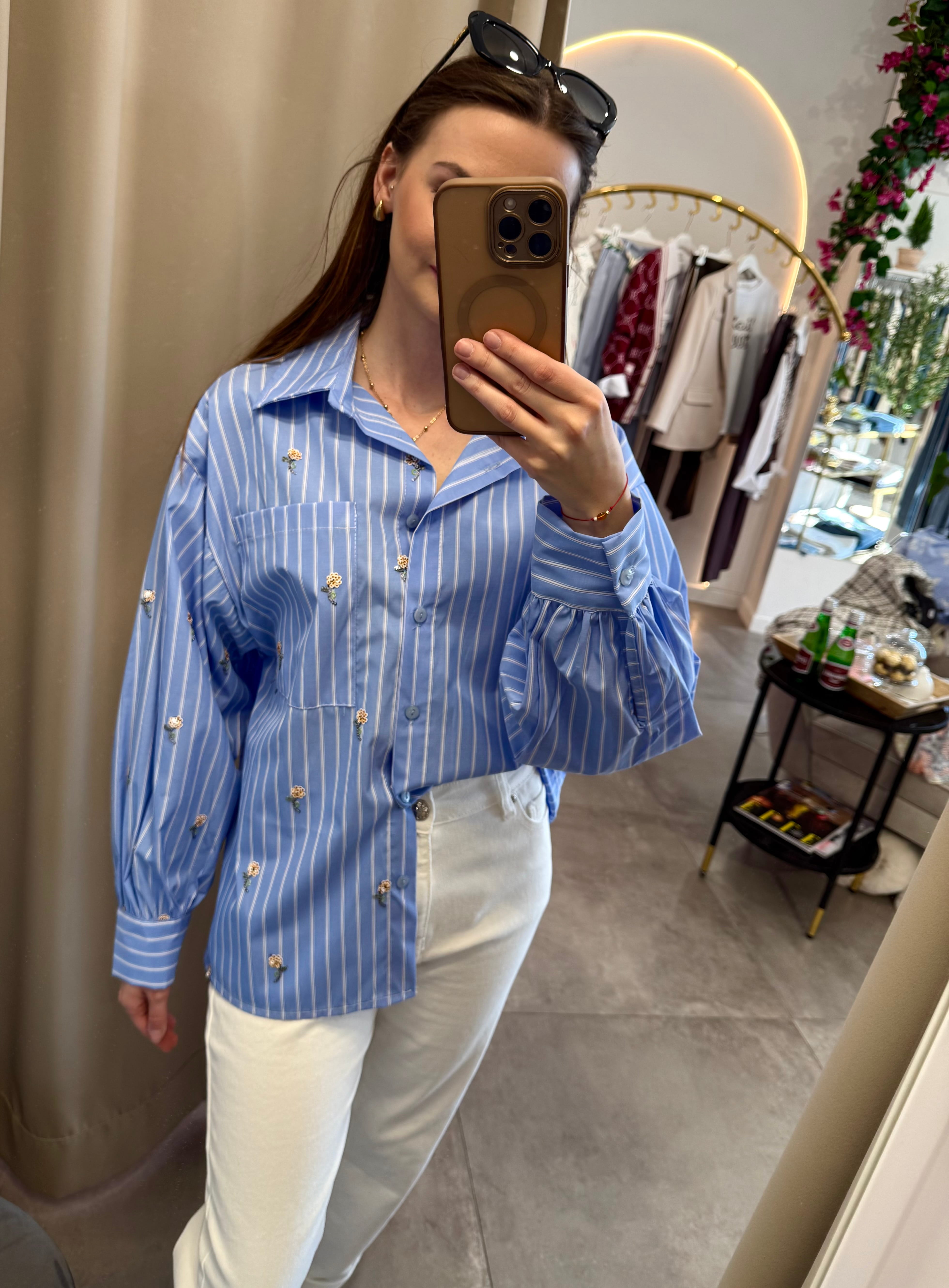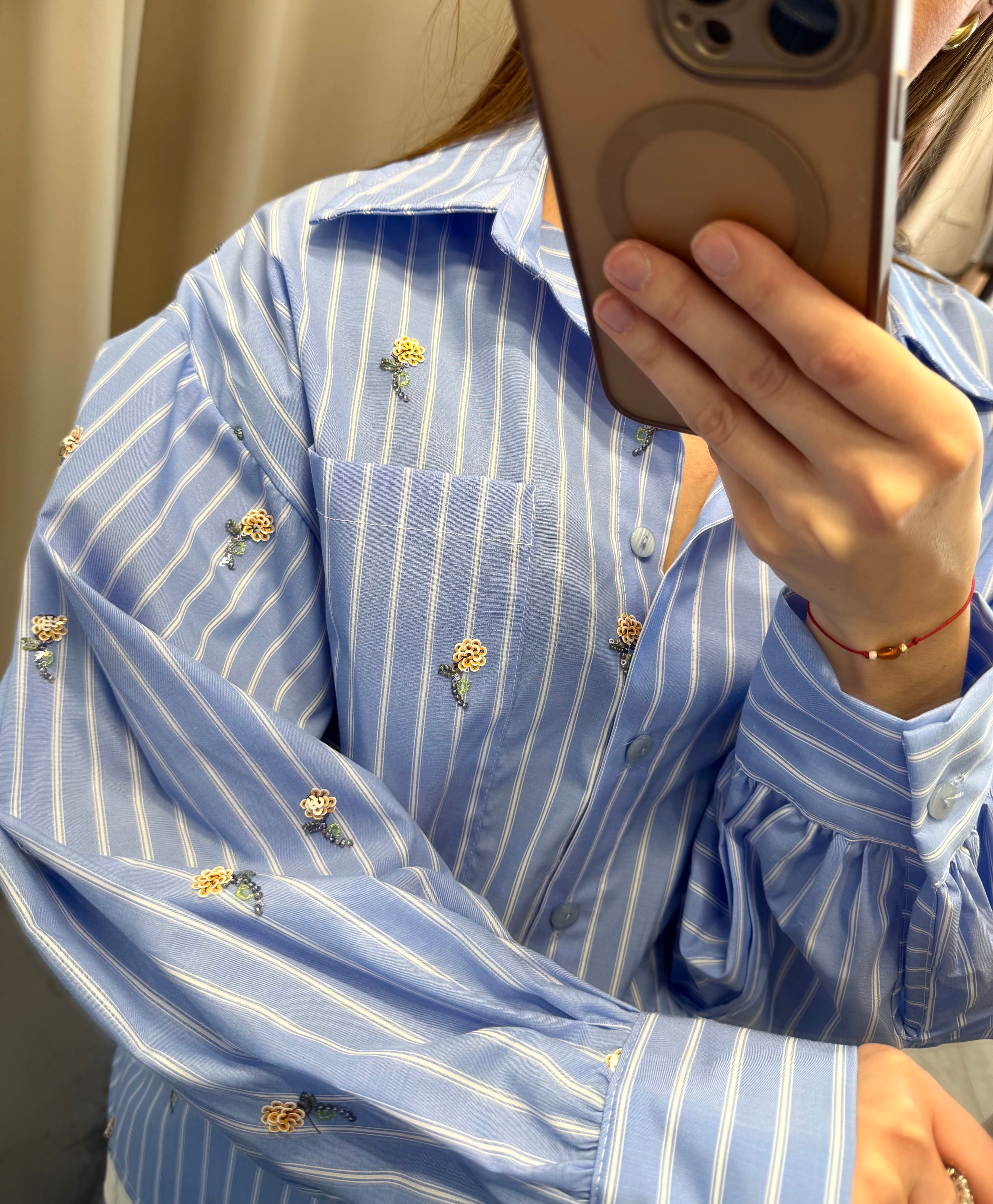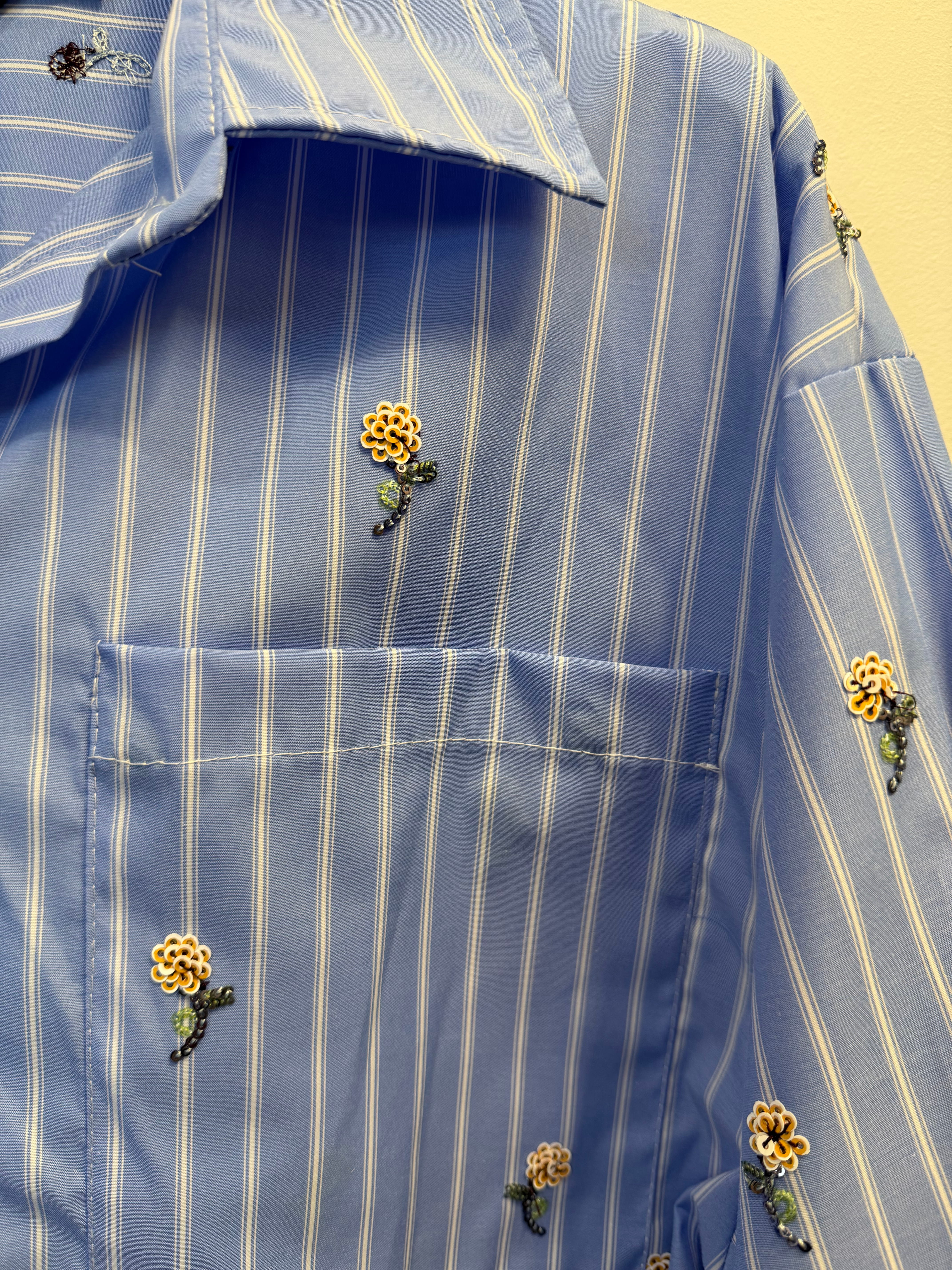Koszula Dolce niebieska w paski wyszywana cekinami w kwiatki, swobodna