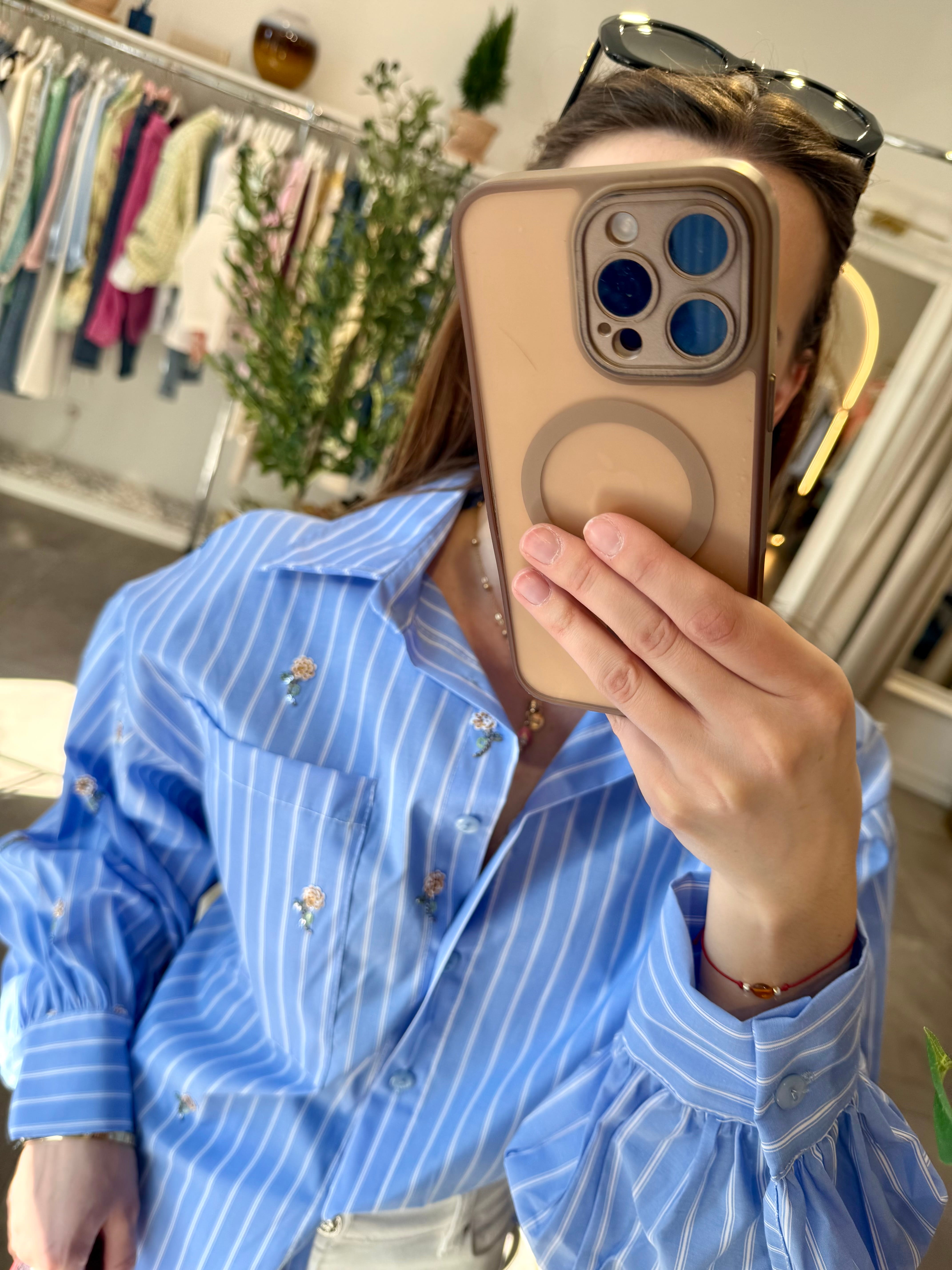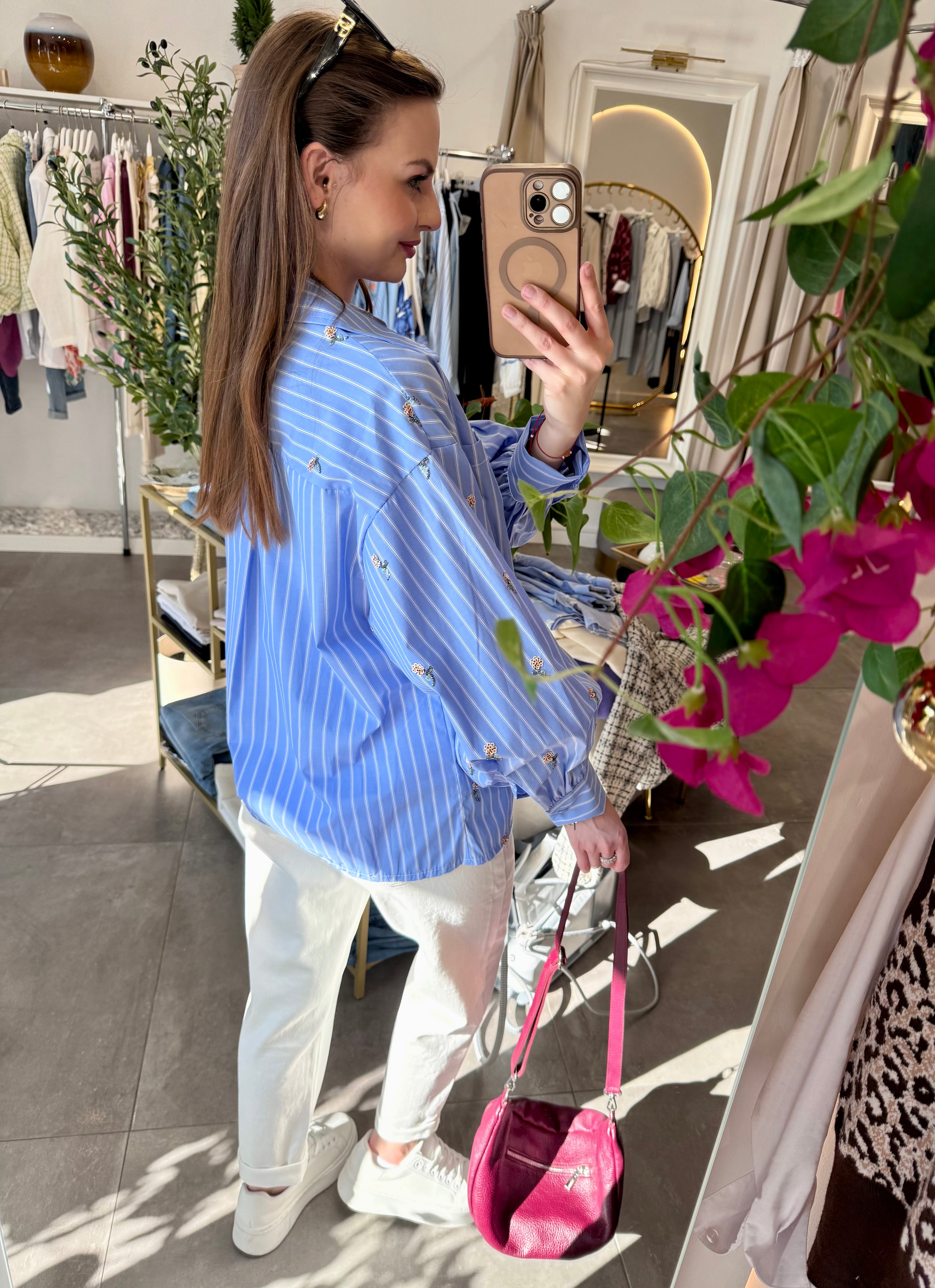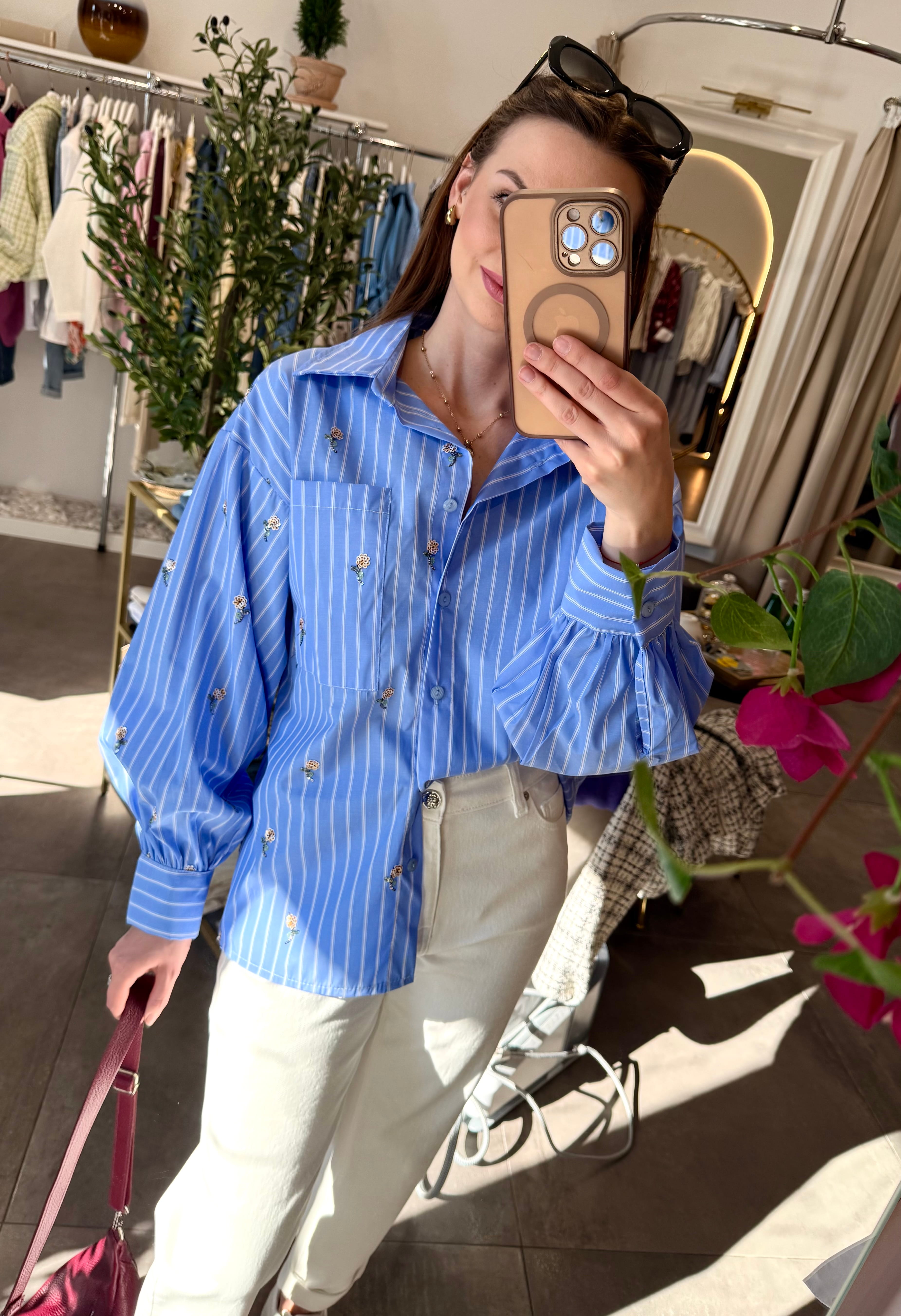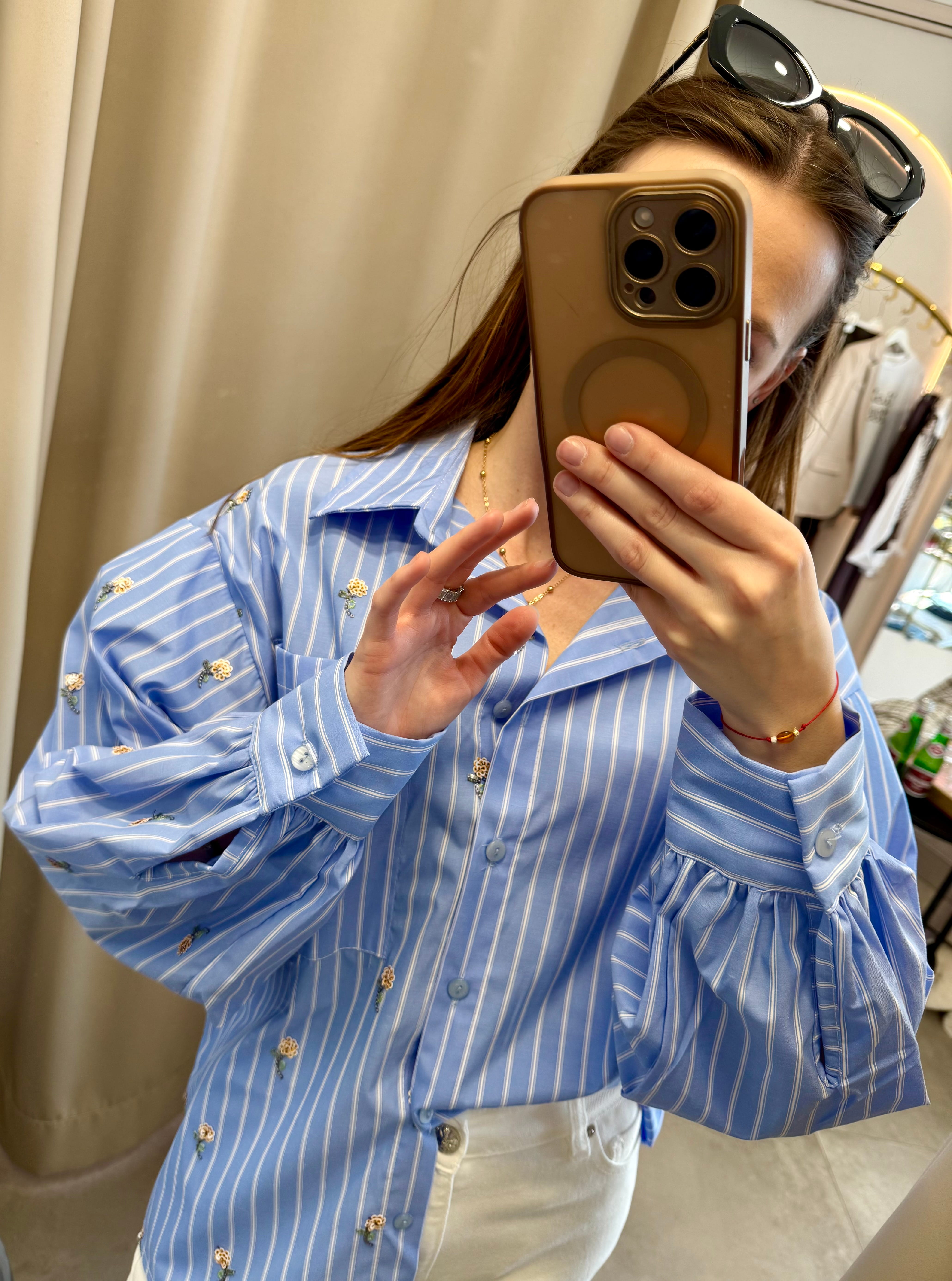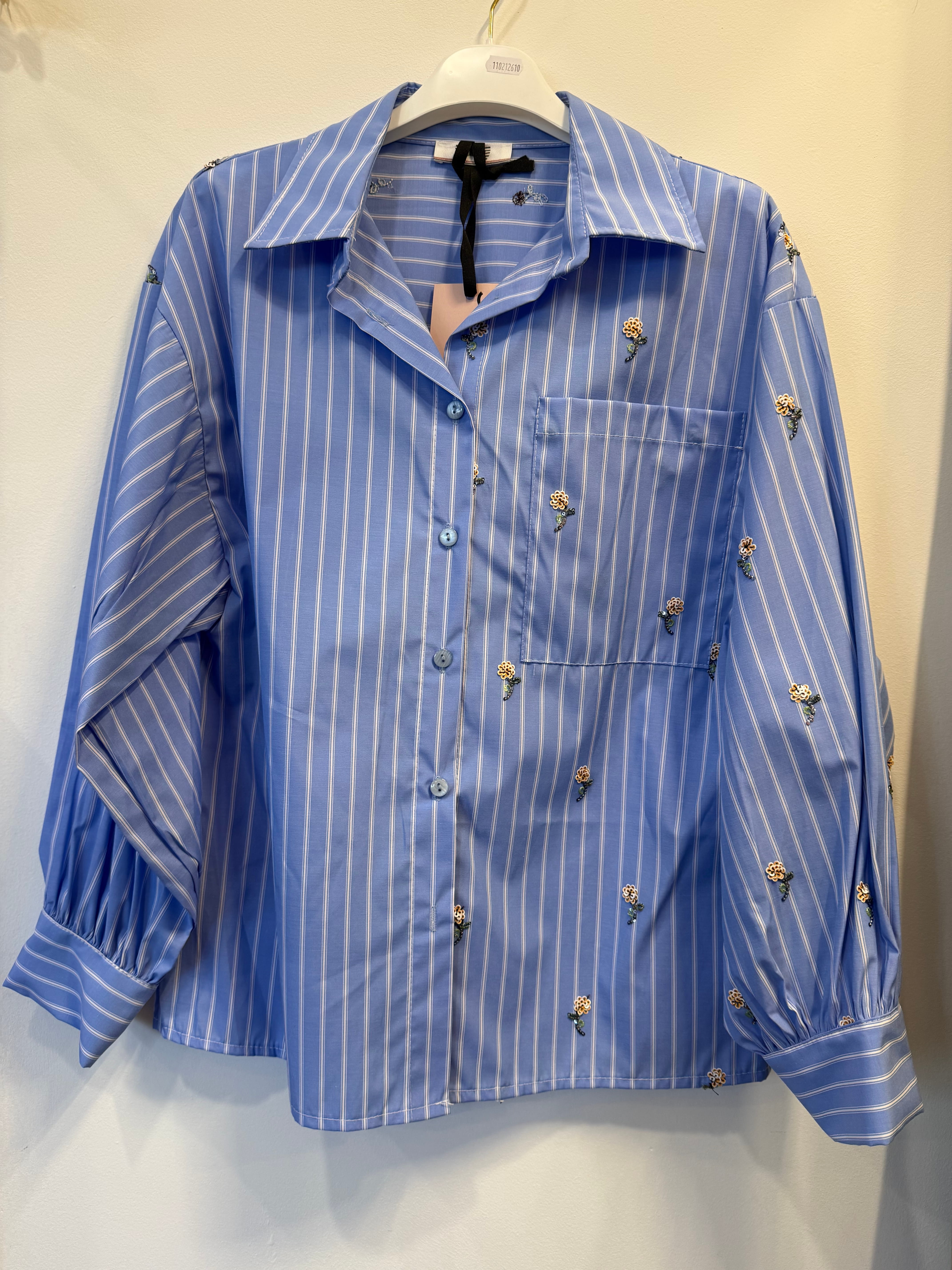 Koszula Dolce niebieska w paski wyszywana cekinami w kwiatki, swobodna