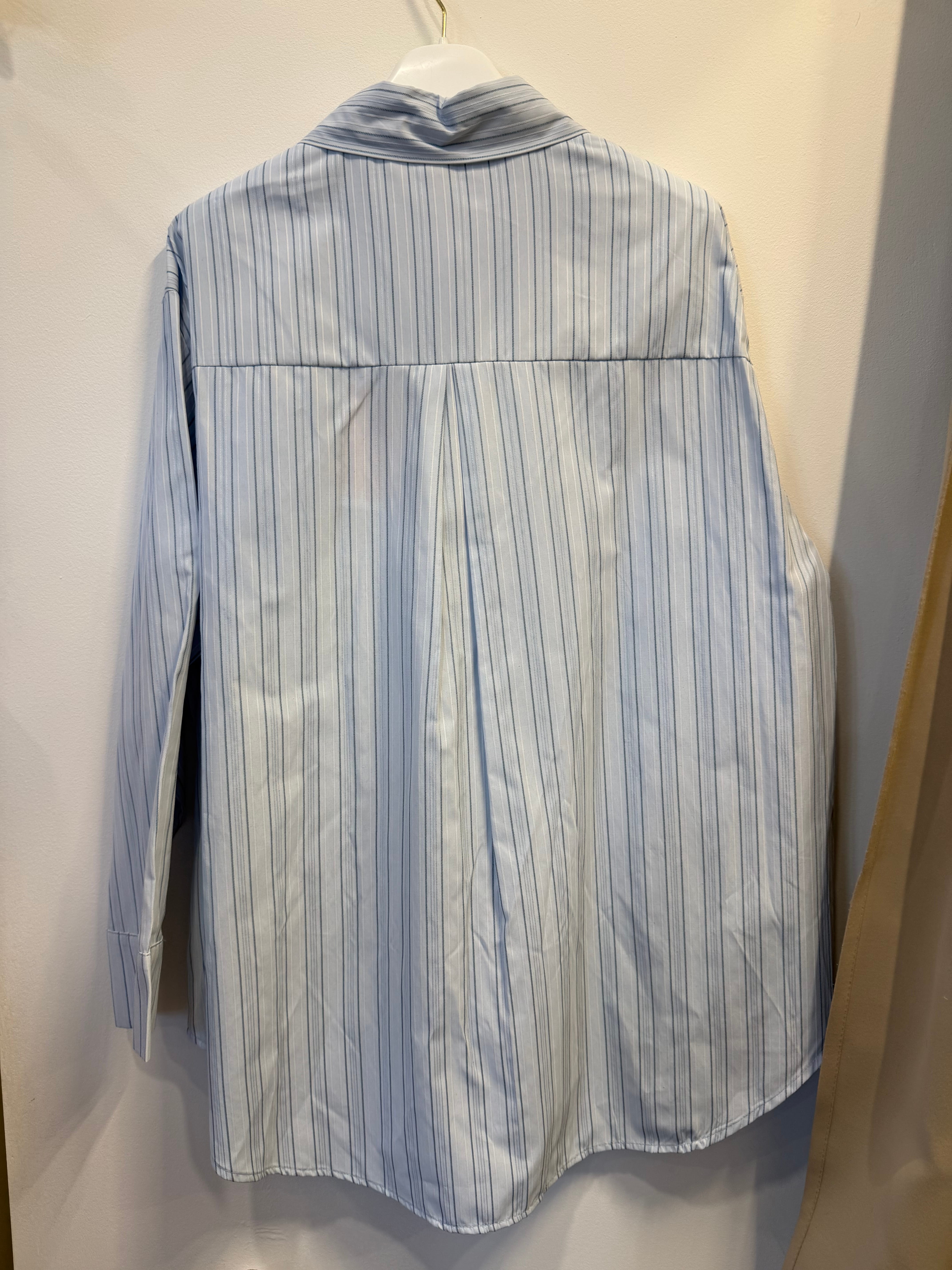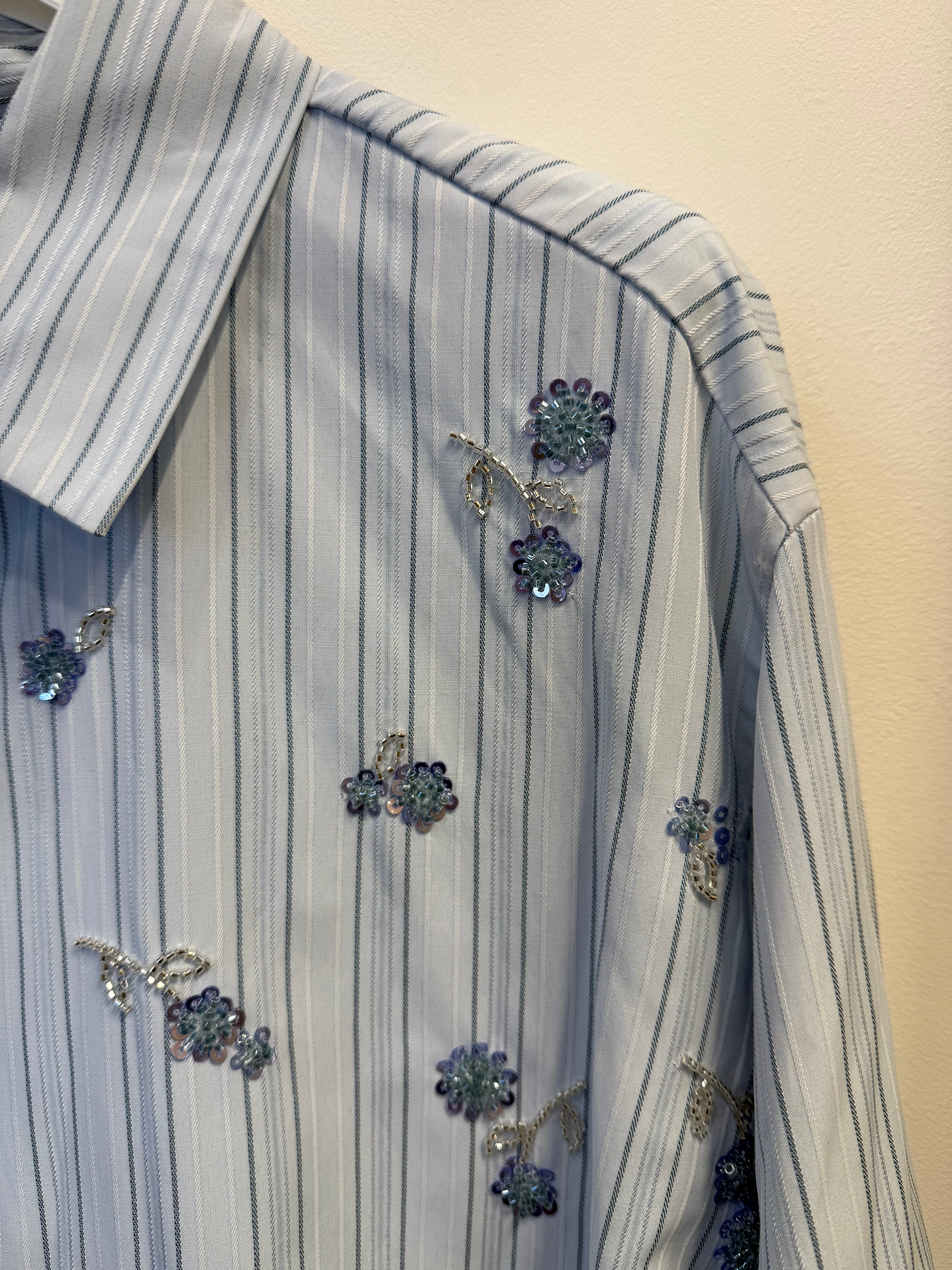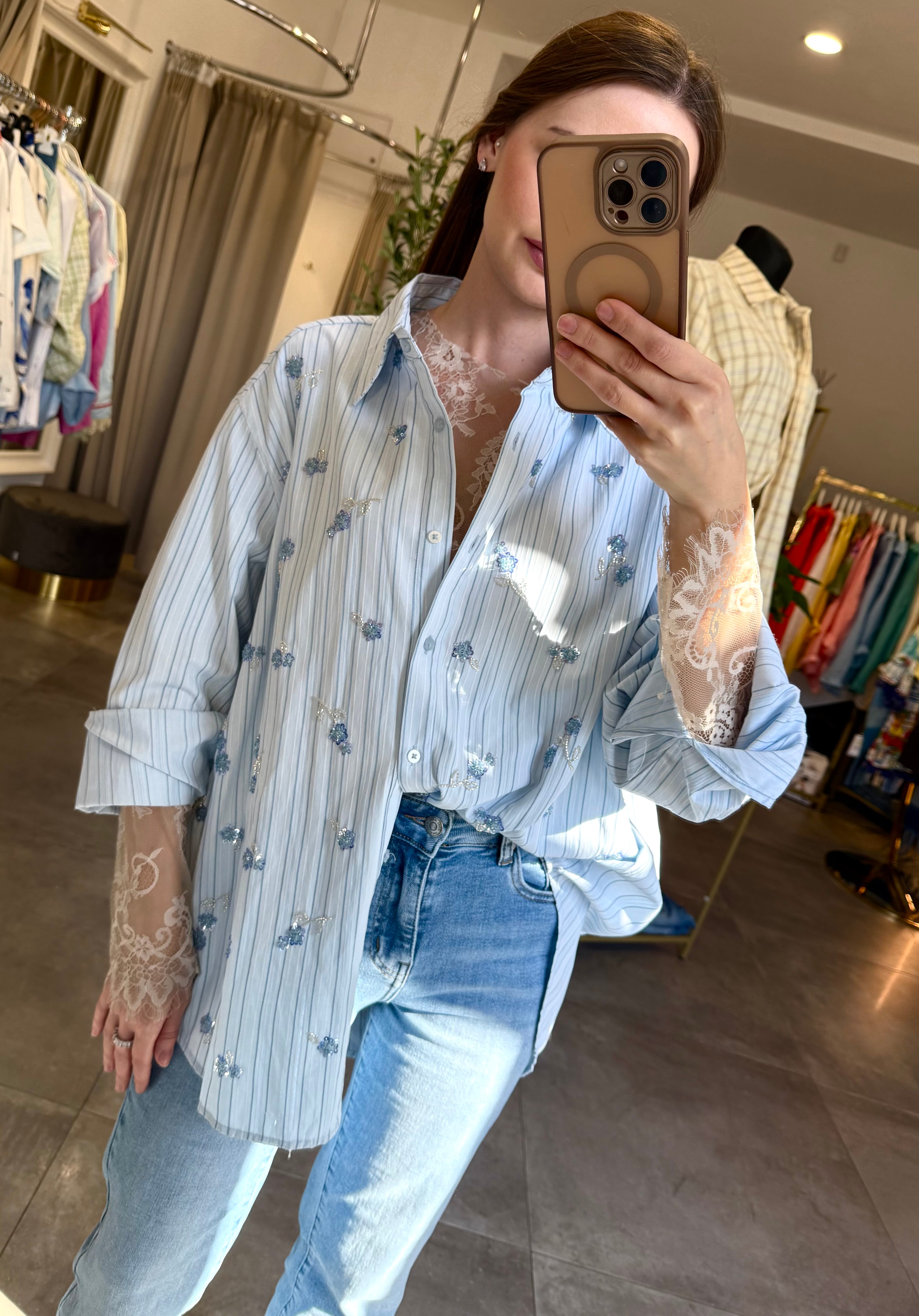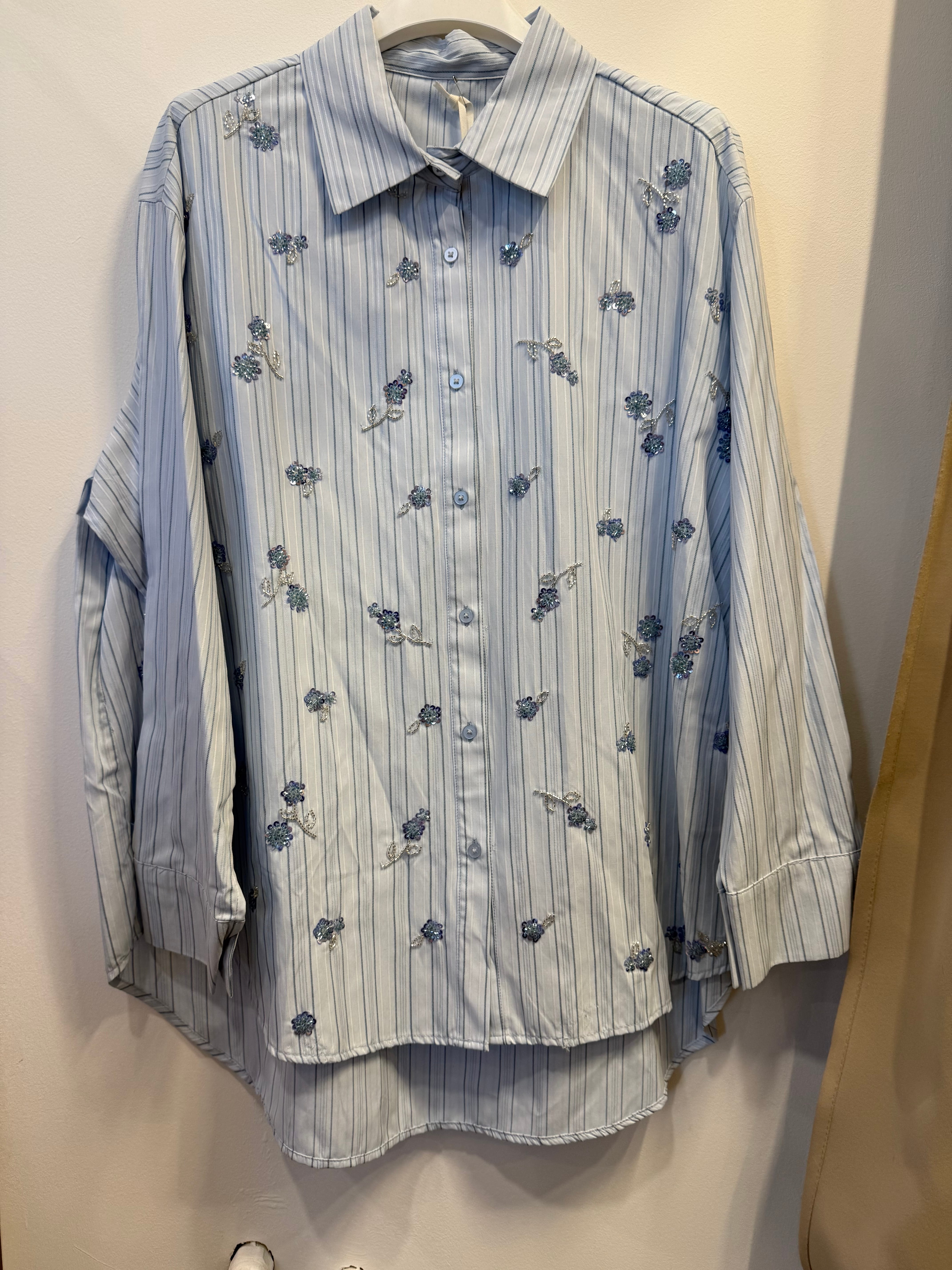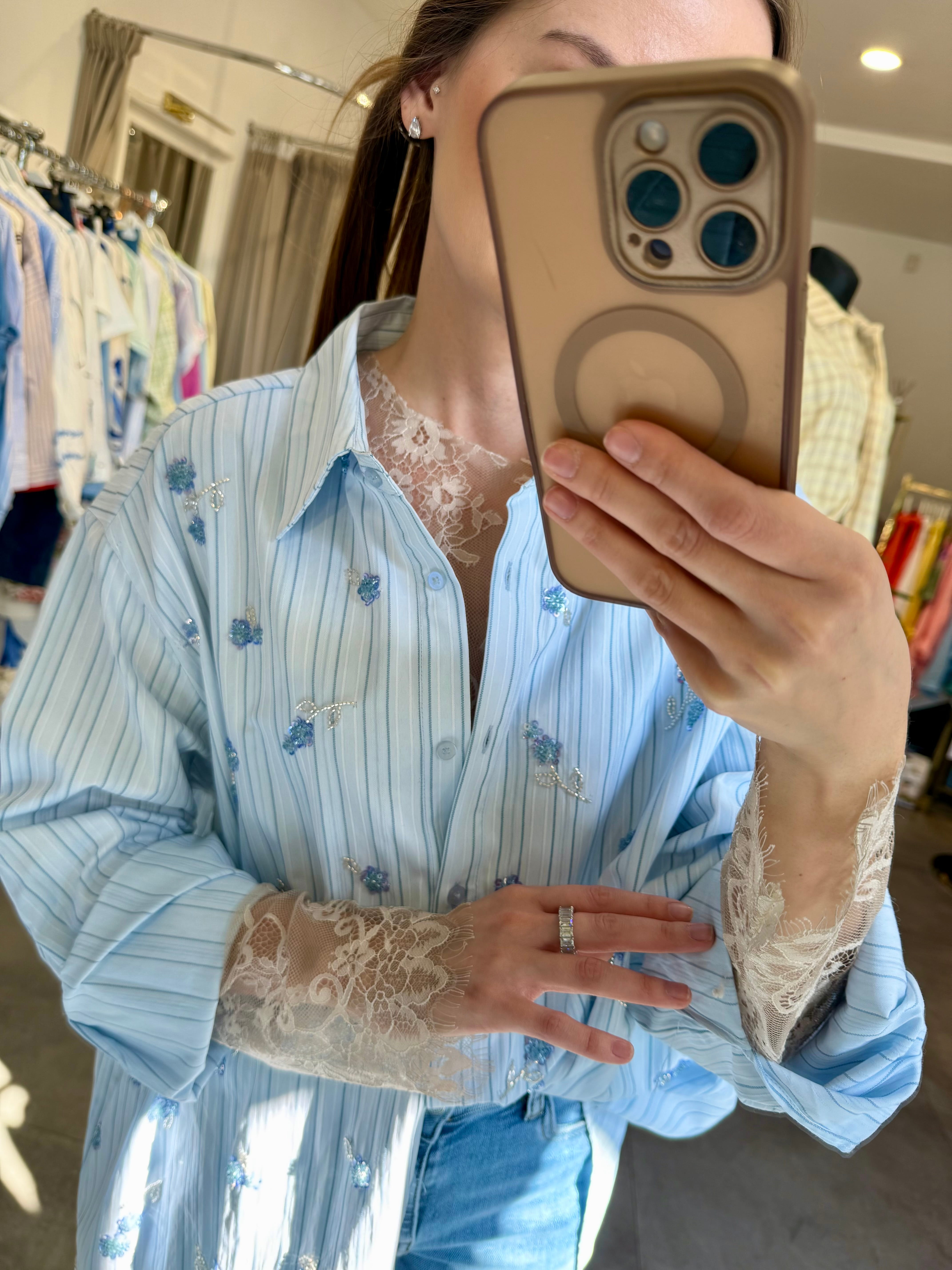 Koszula Loredana błękitna w paski wyszywana koralikami, cekinami, swobodna