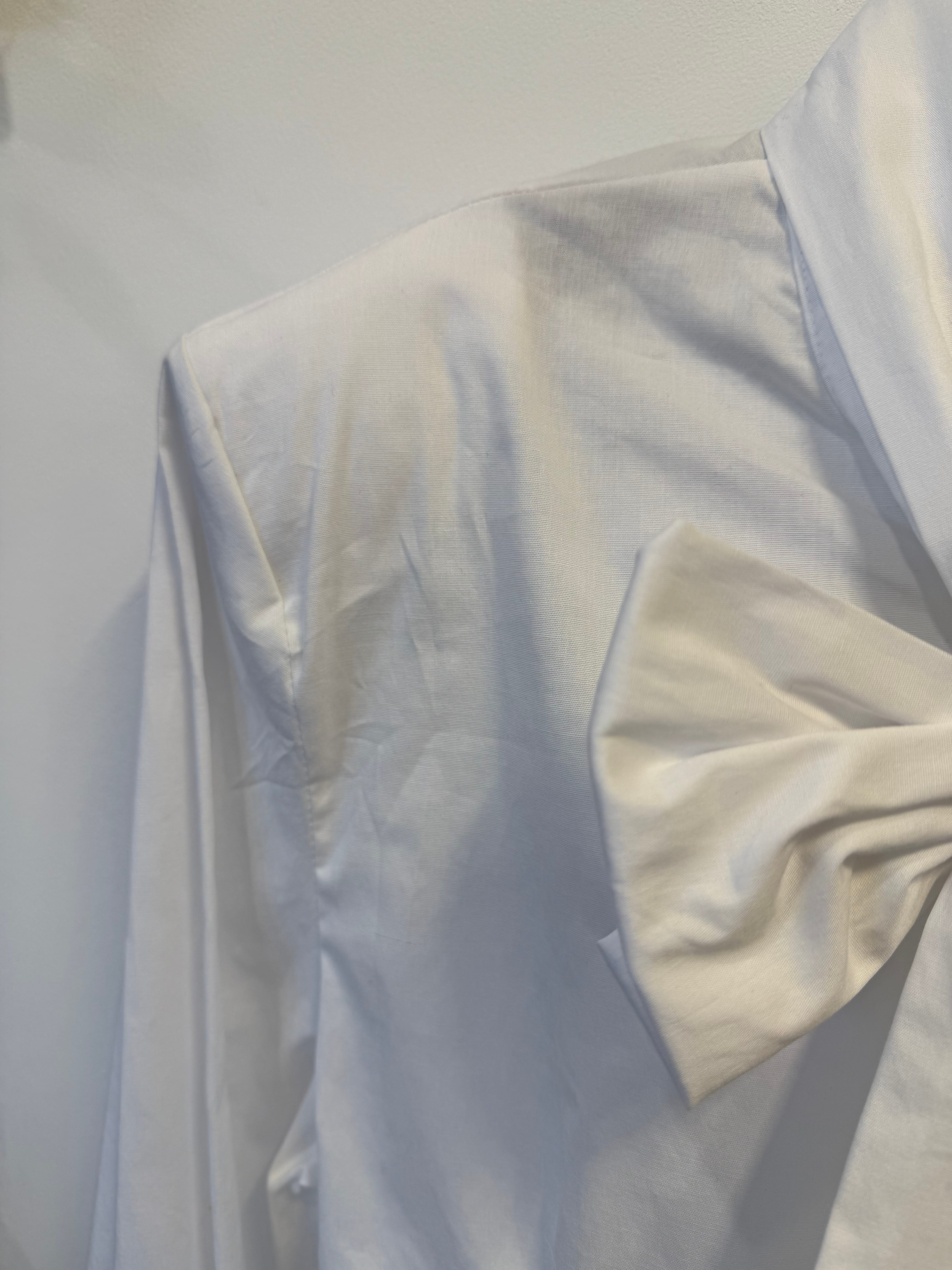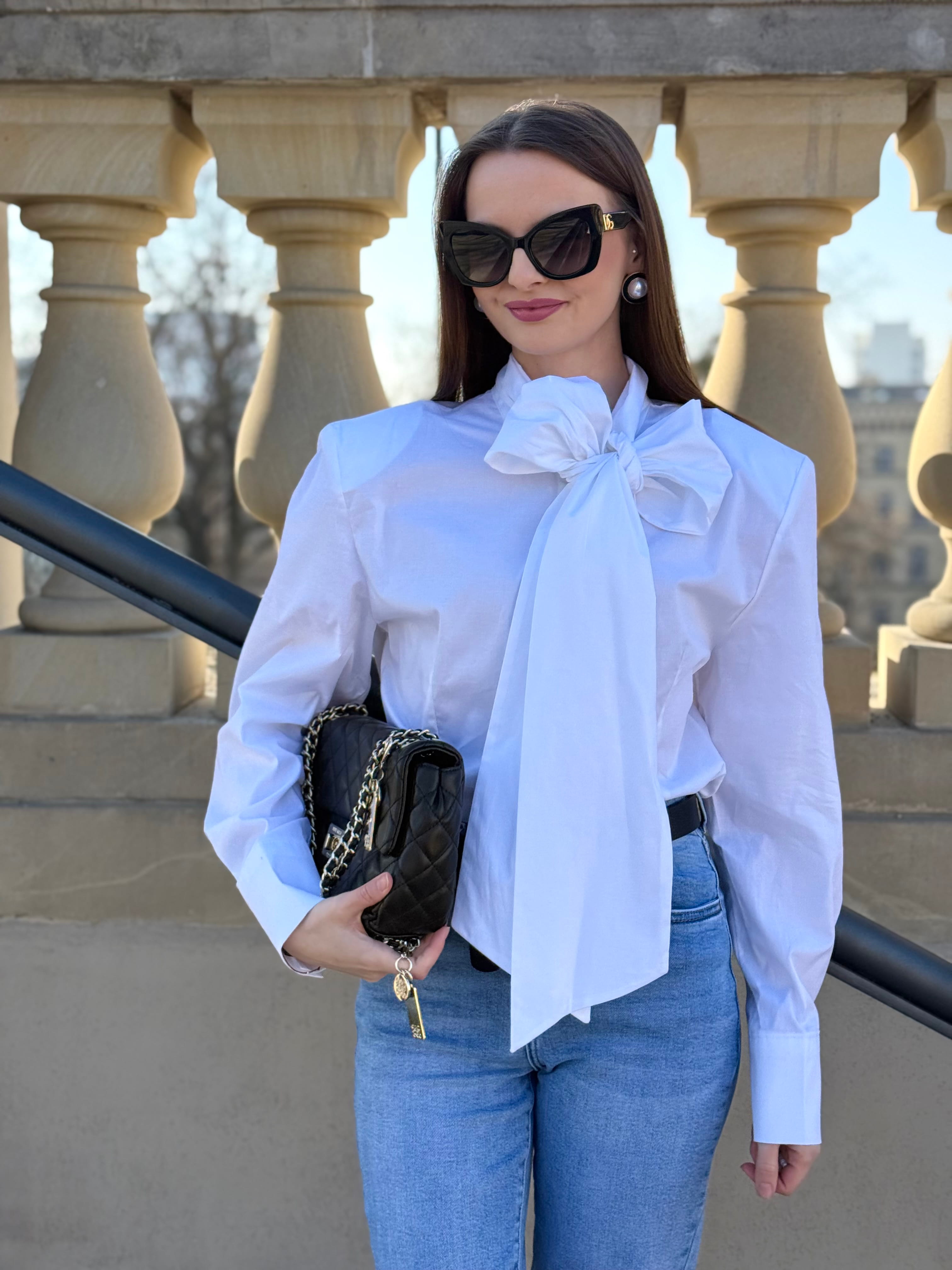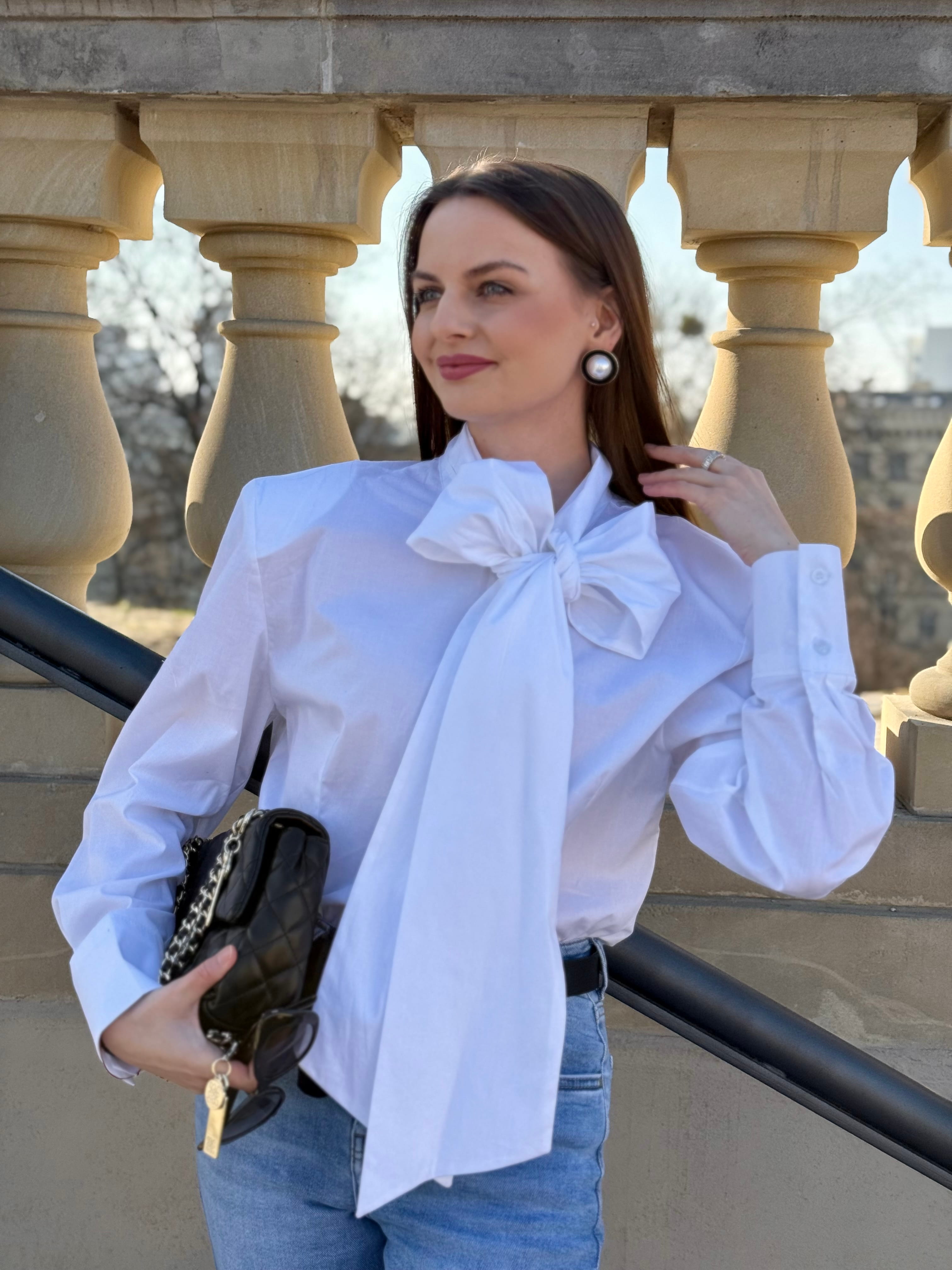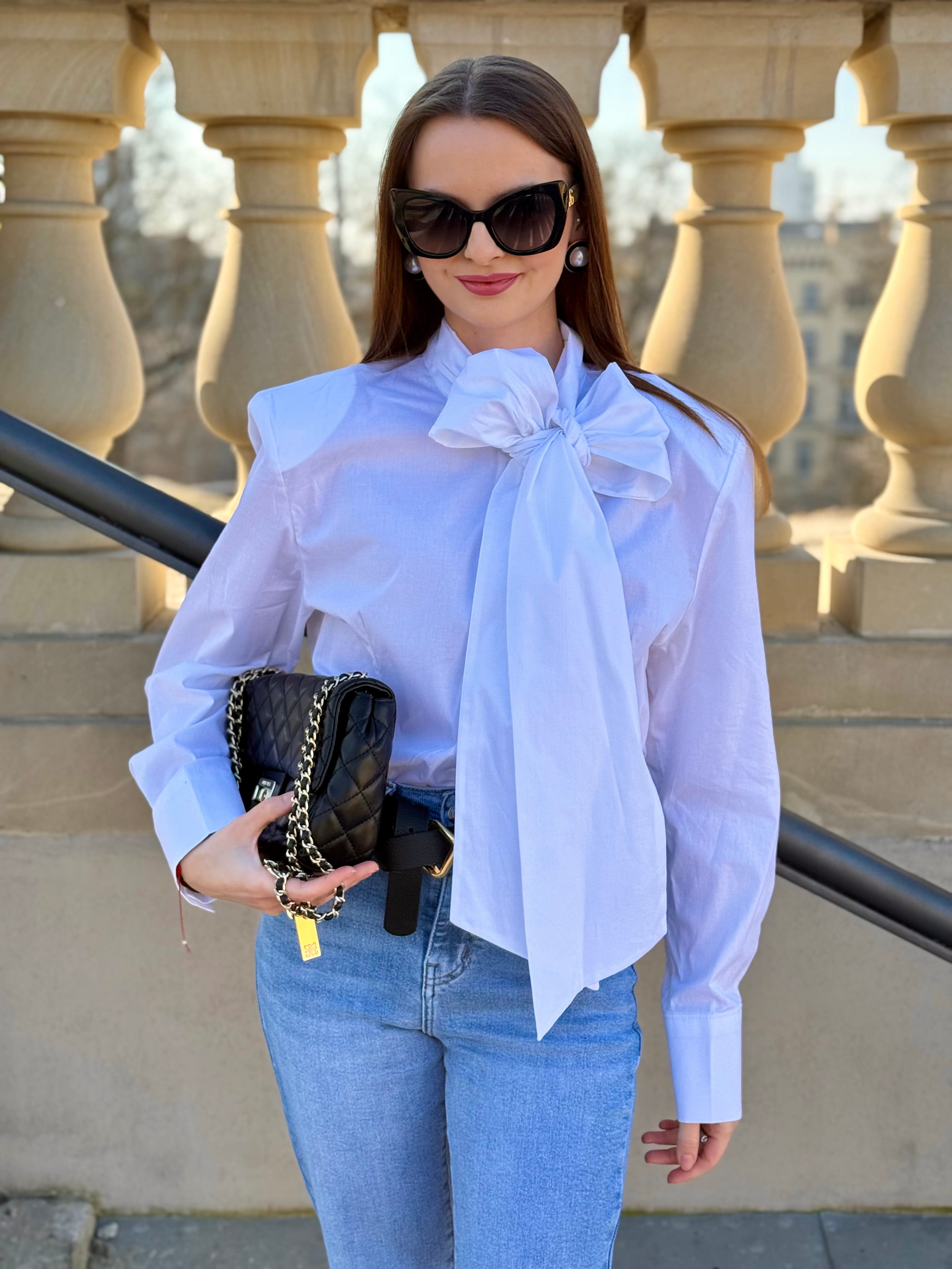 Koszula Yvessa biała, bawełniana z wiązaniem kokardą, poduszkami na ramionach, zaszewkami