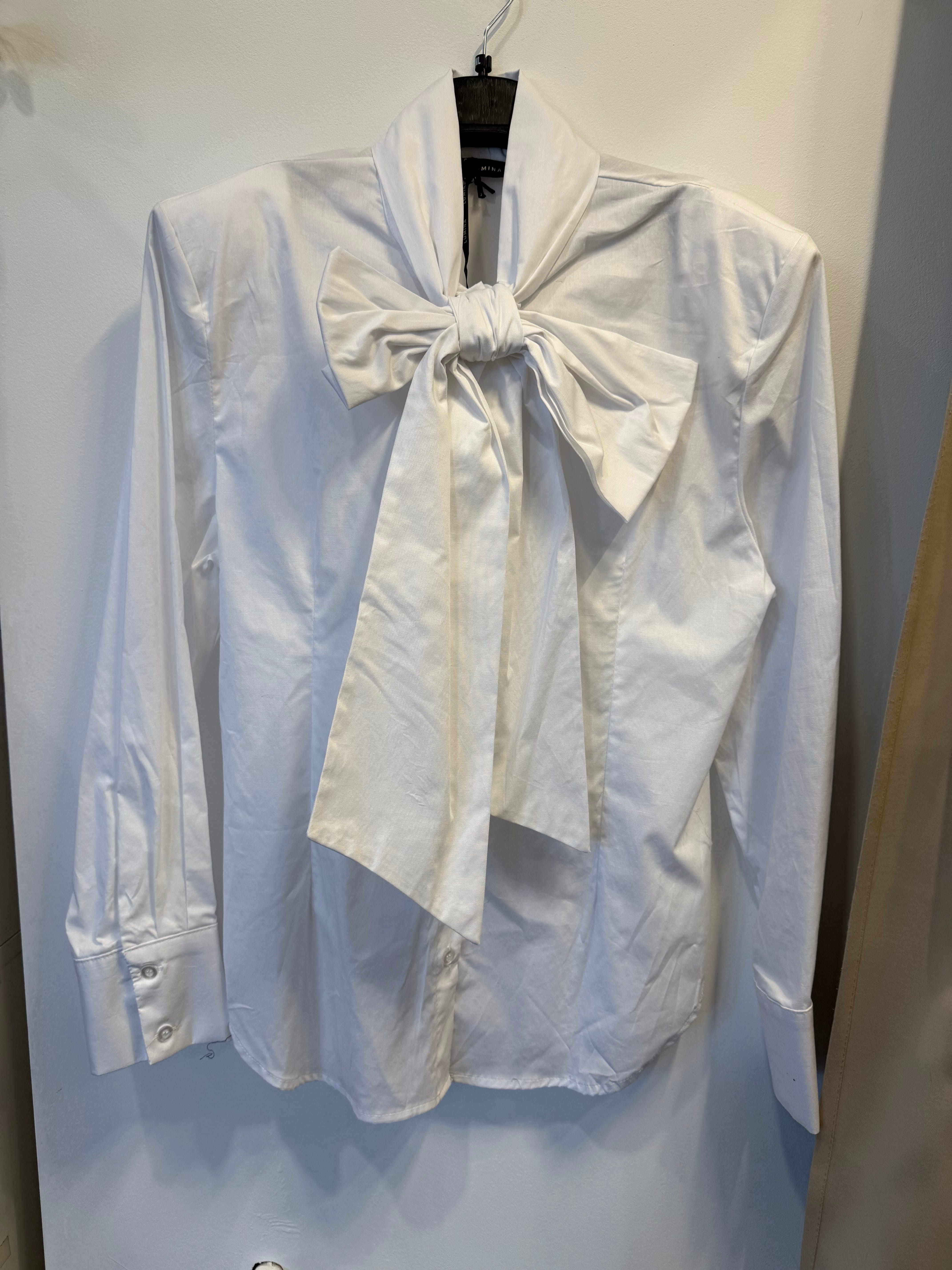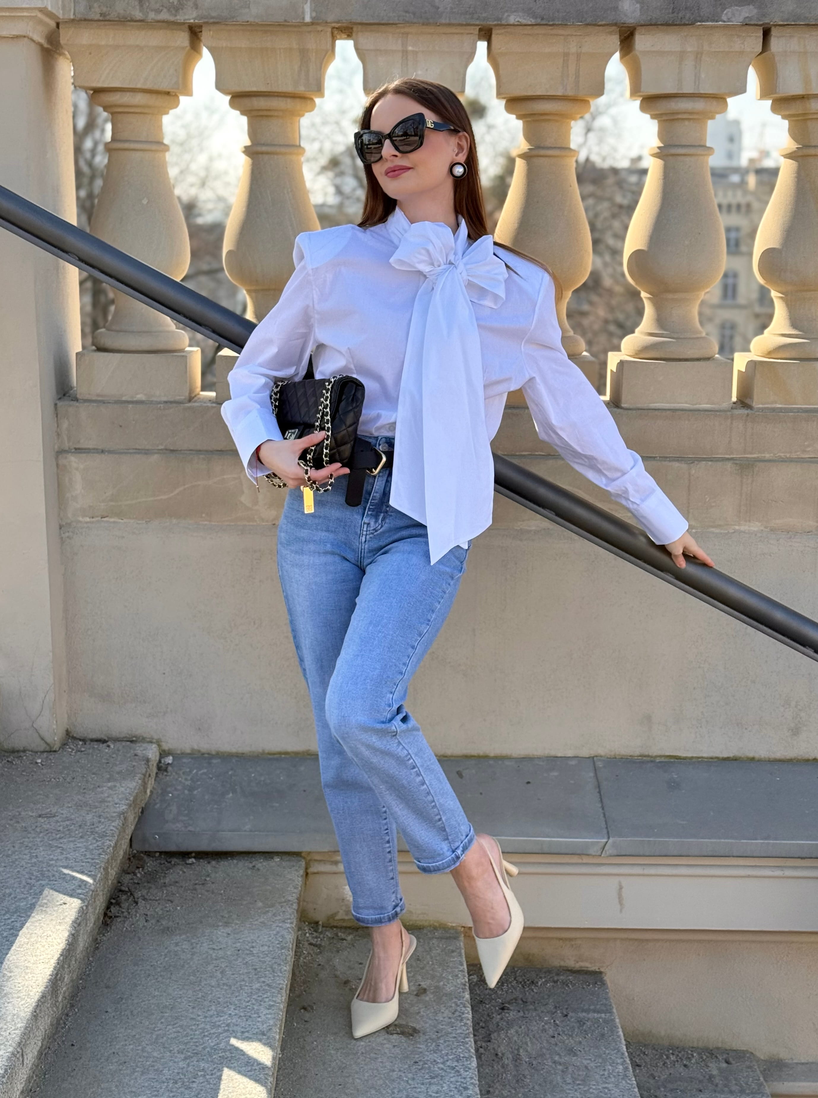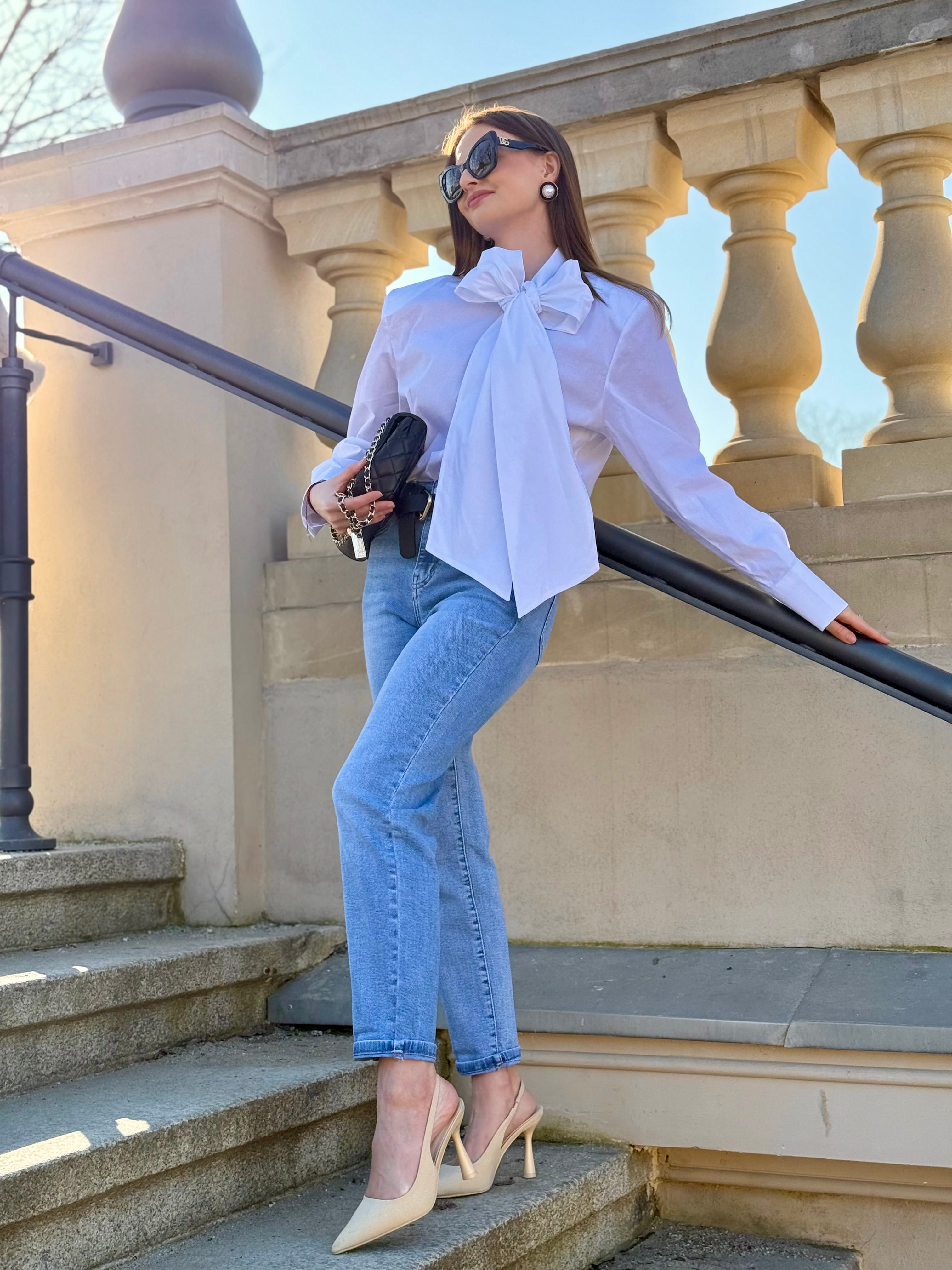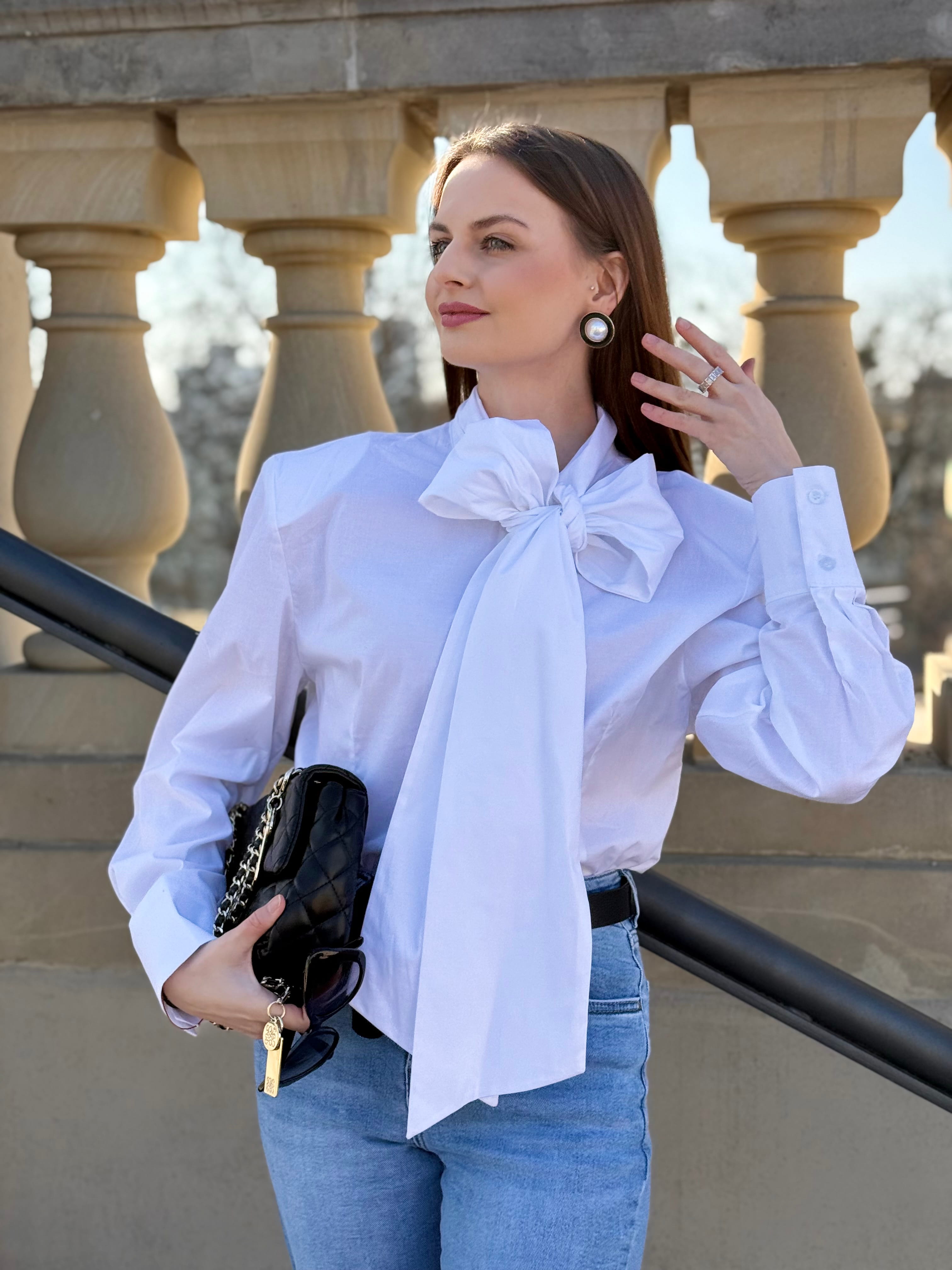 Koszula Yvessa biała, bawełniana z wiązaniem kokardą, poduszkami na ramionach, zaszewkami