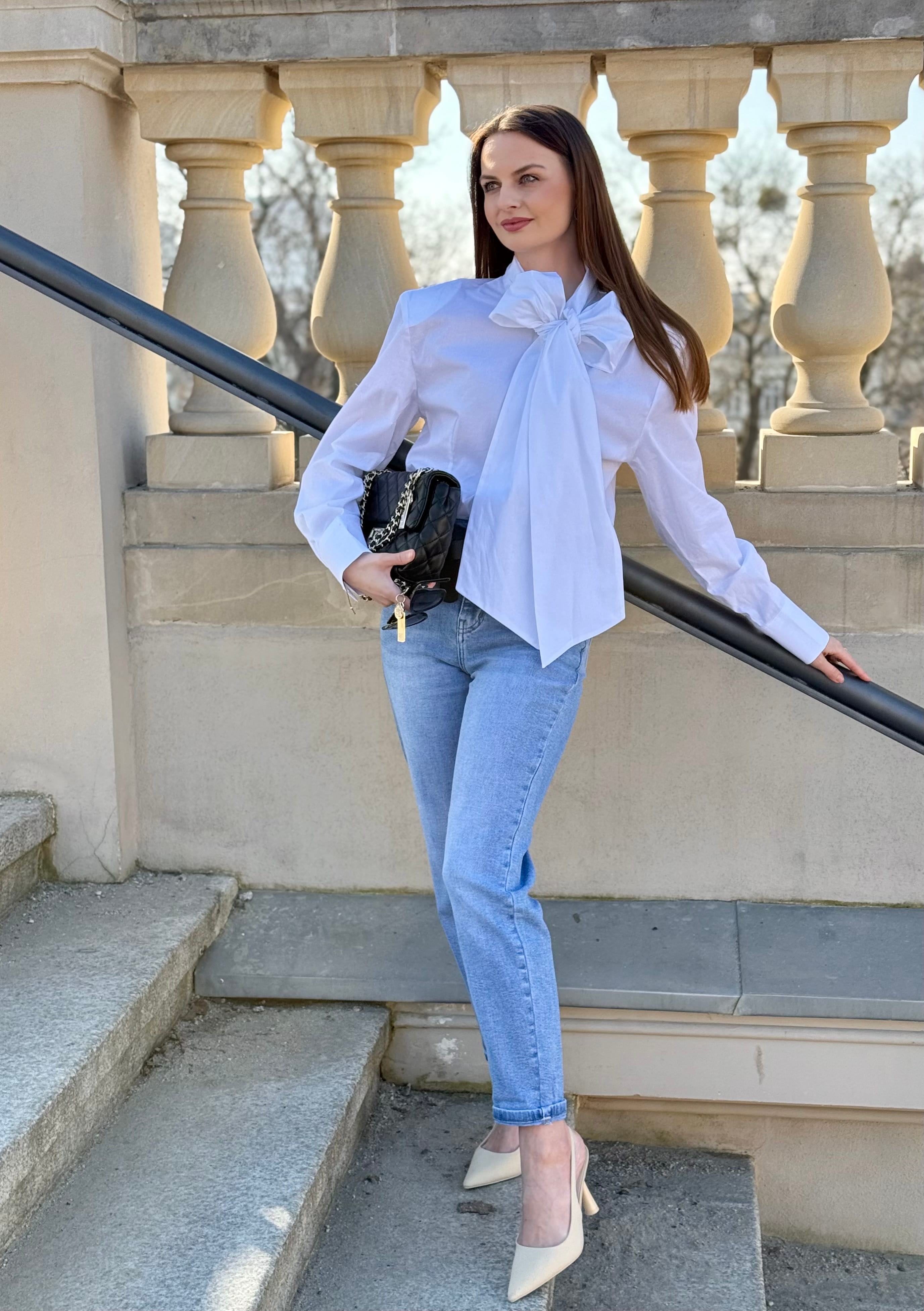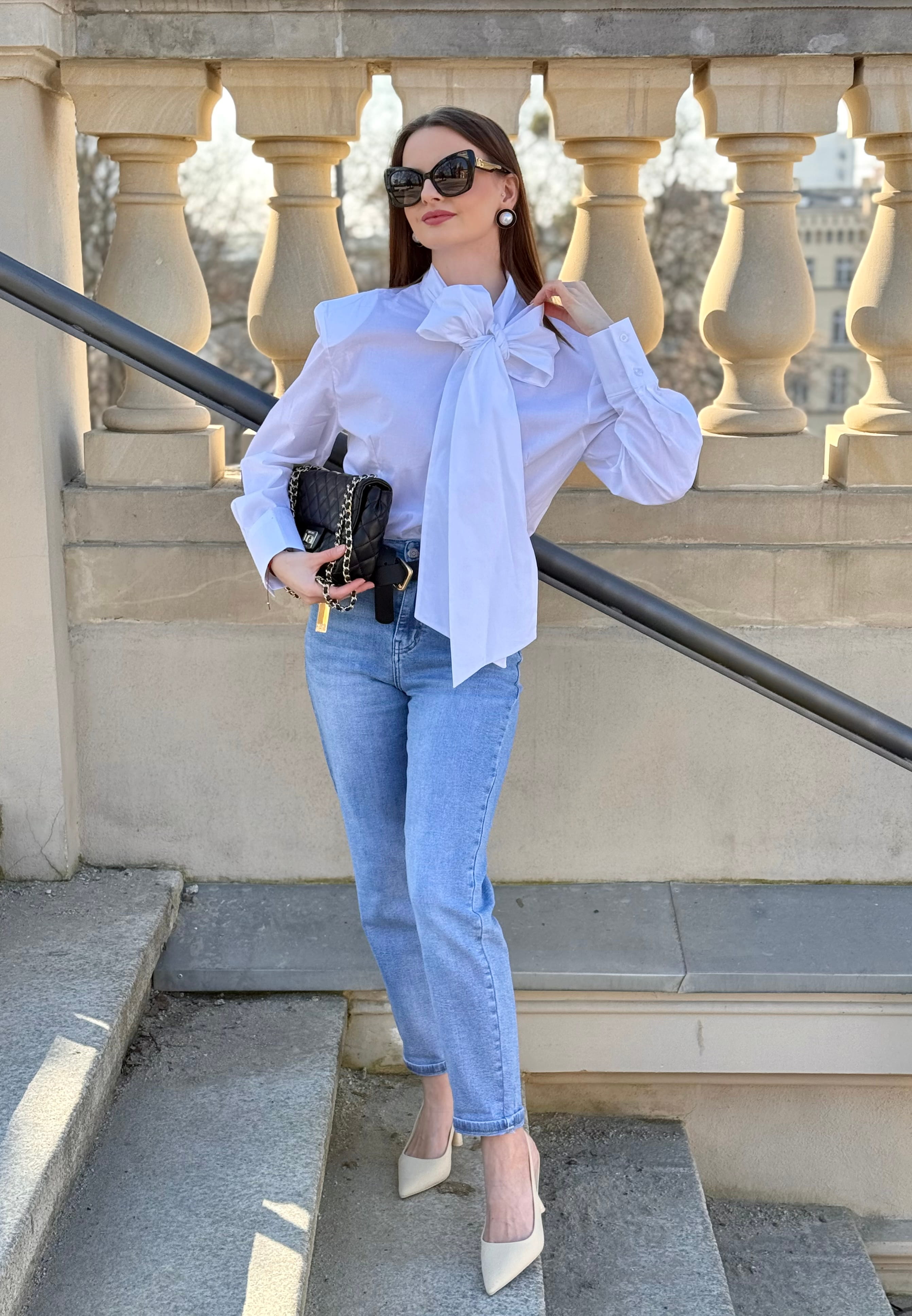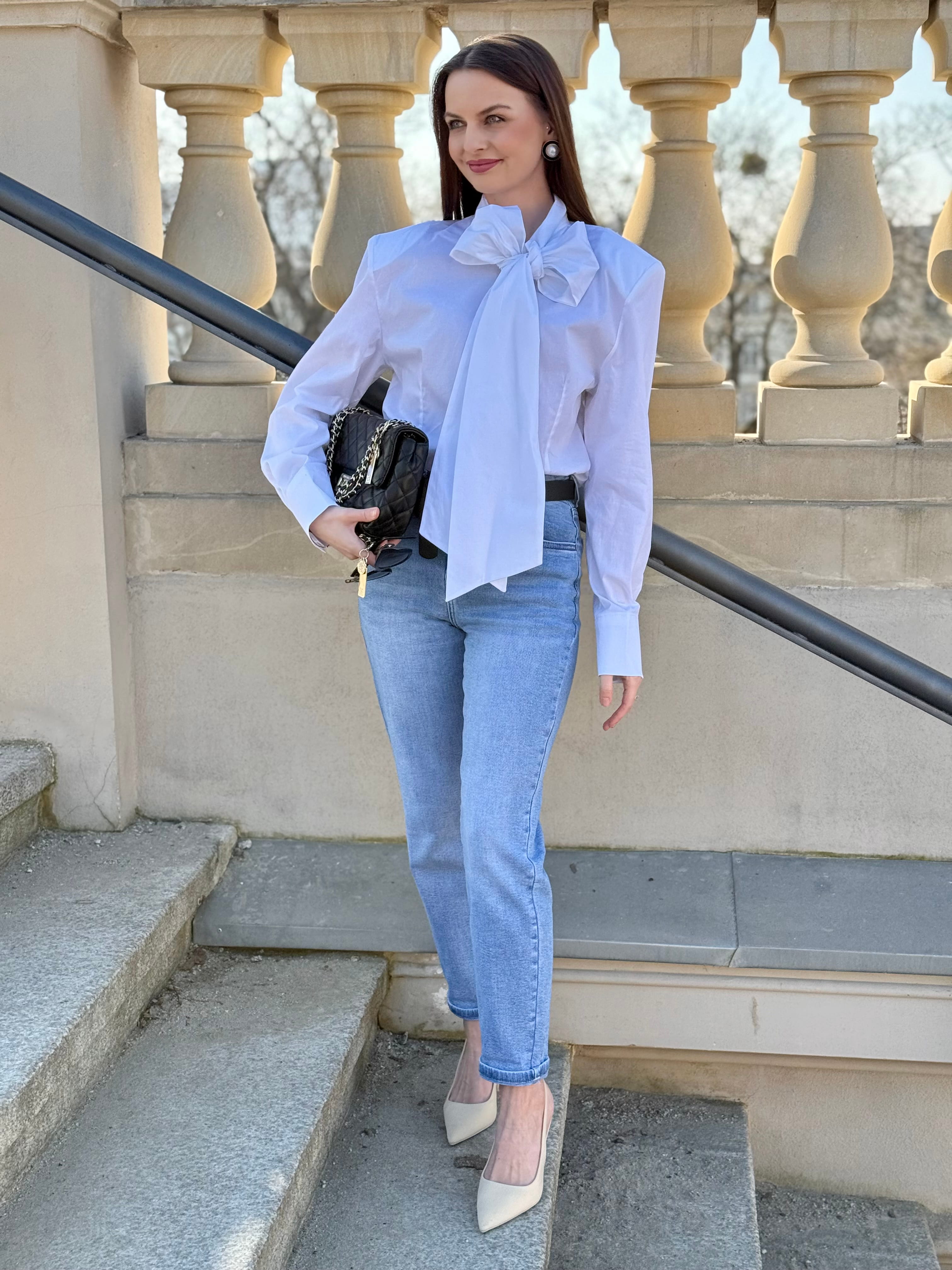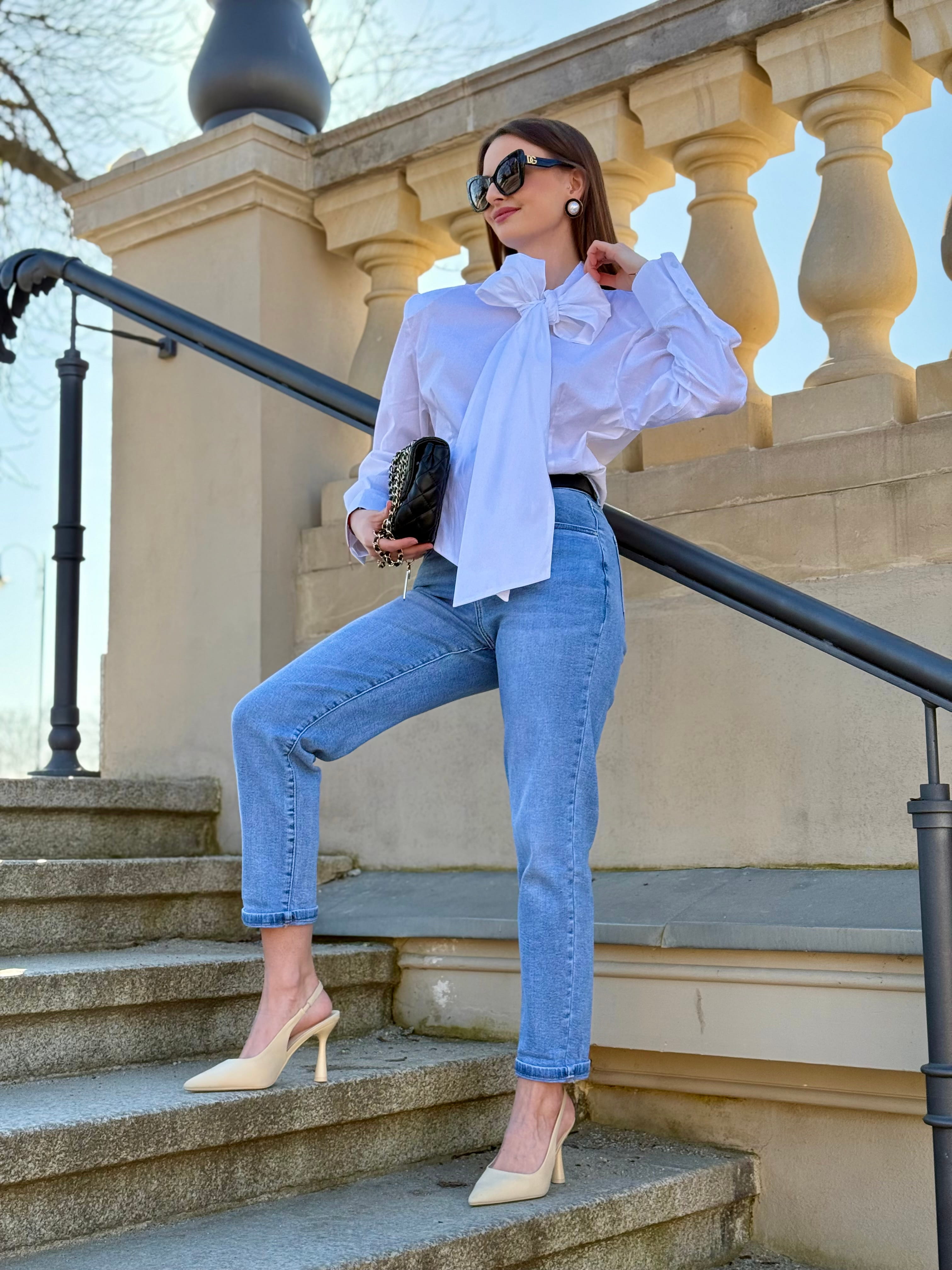 Koszula Yvessa biała, bawełniana z wiązaniem kokardą, poduszkami na ramionach, zaszewkami