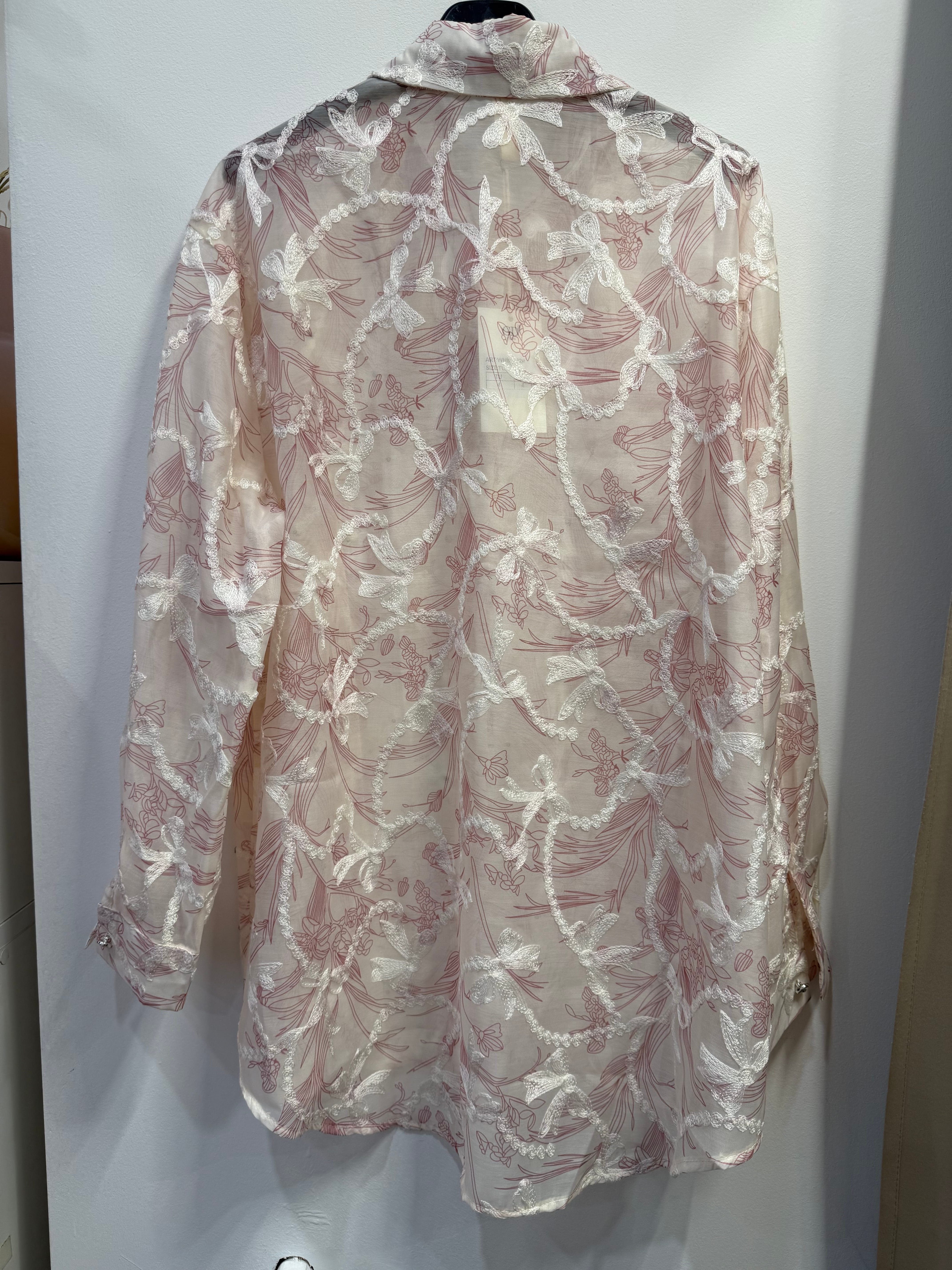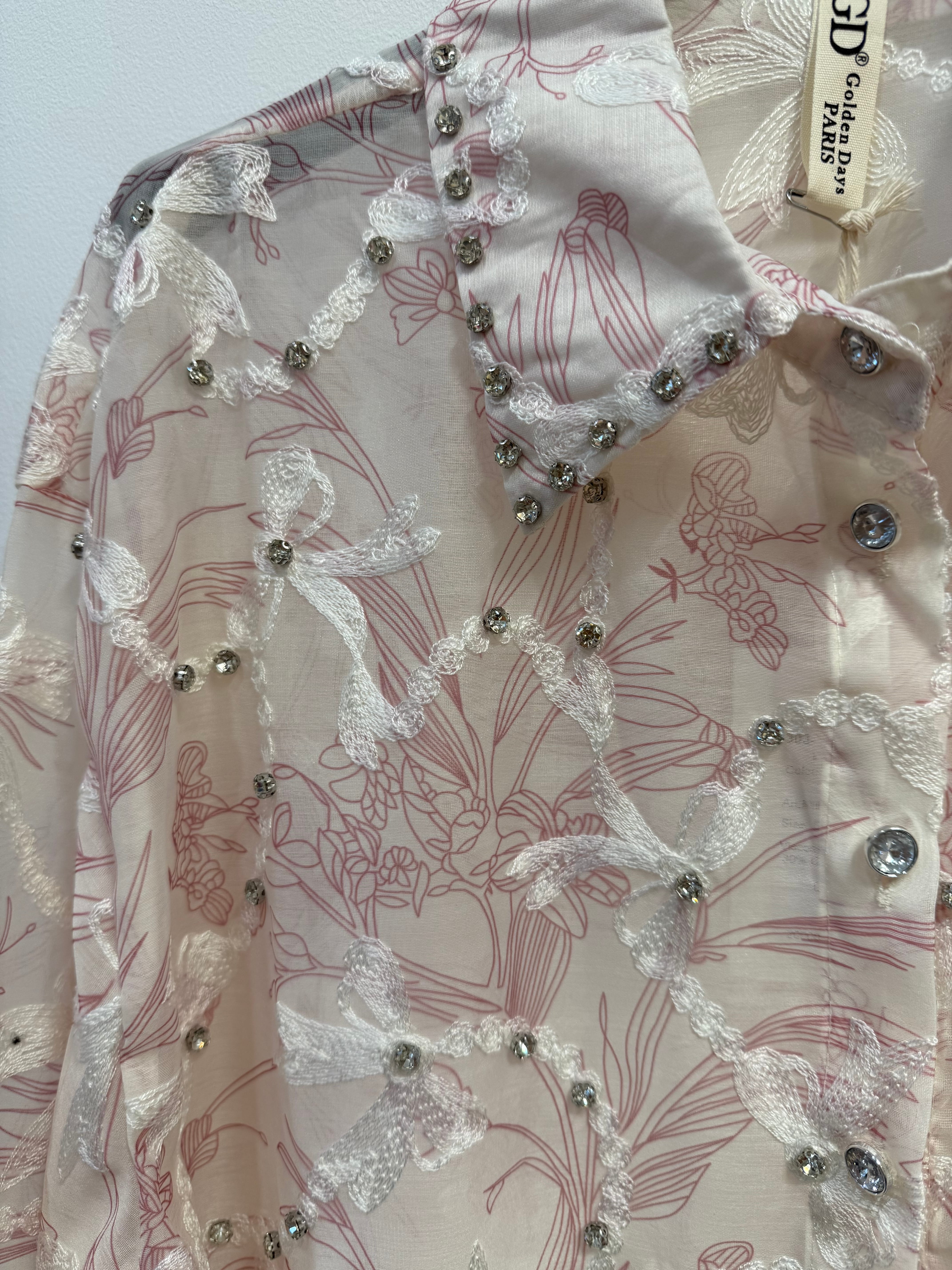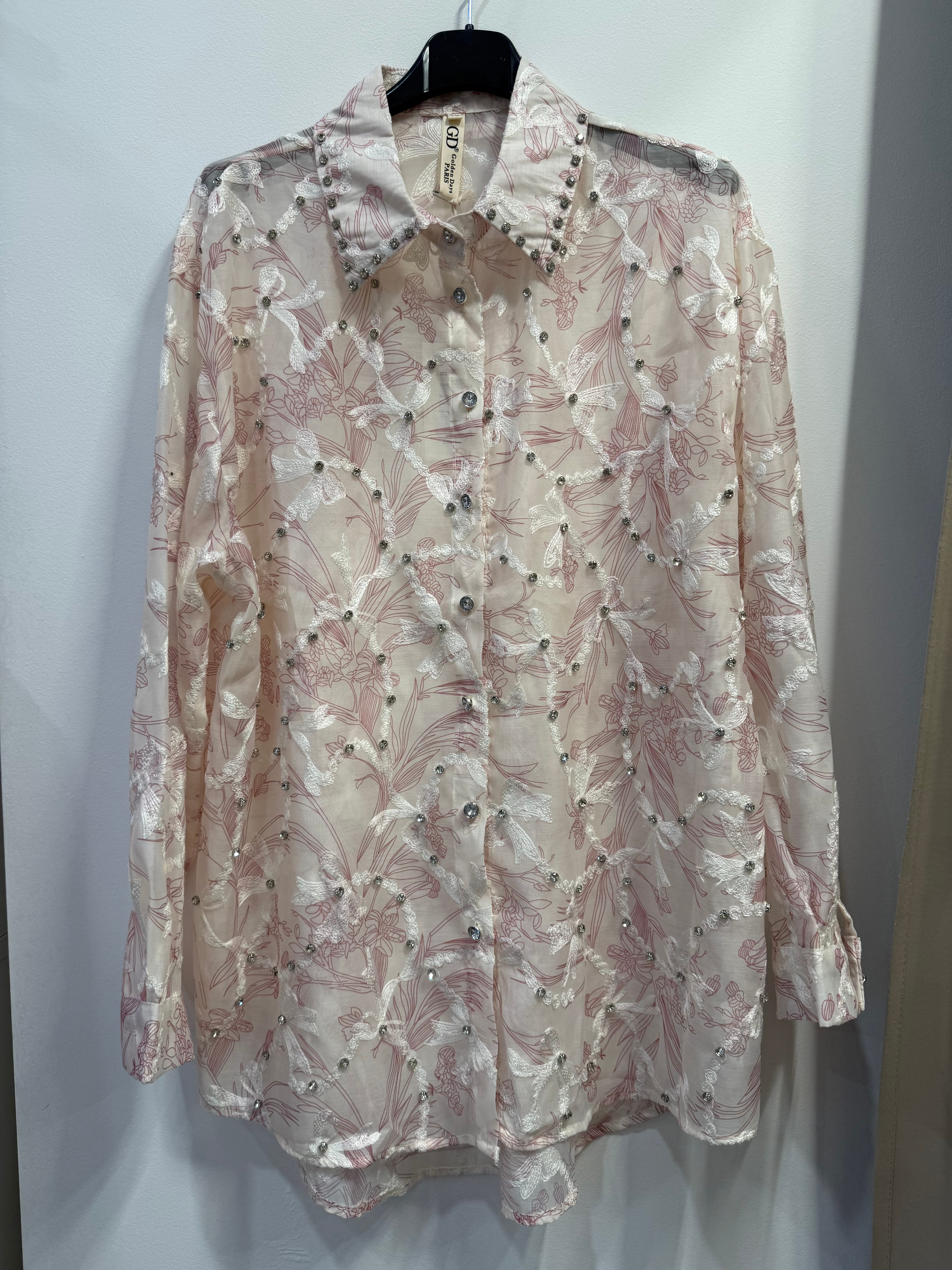 Koszula bawełna, jedwab, wiskoza Rosanna kremowa w różowe wzory z kryształkami, transparentna