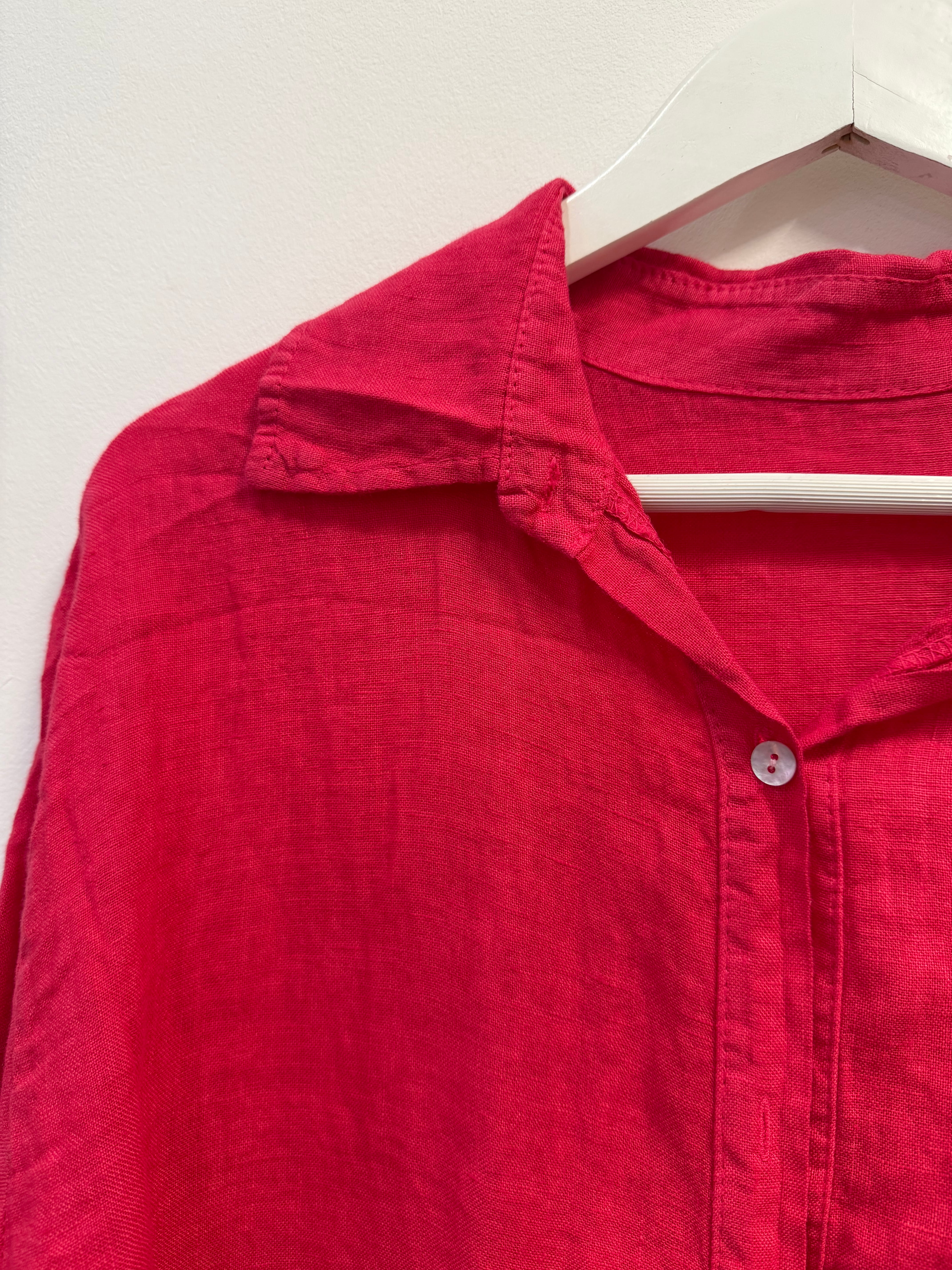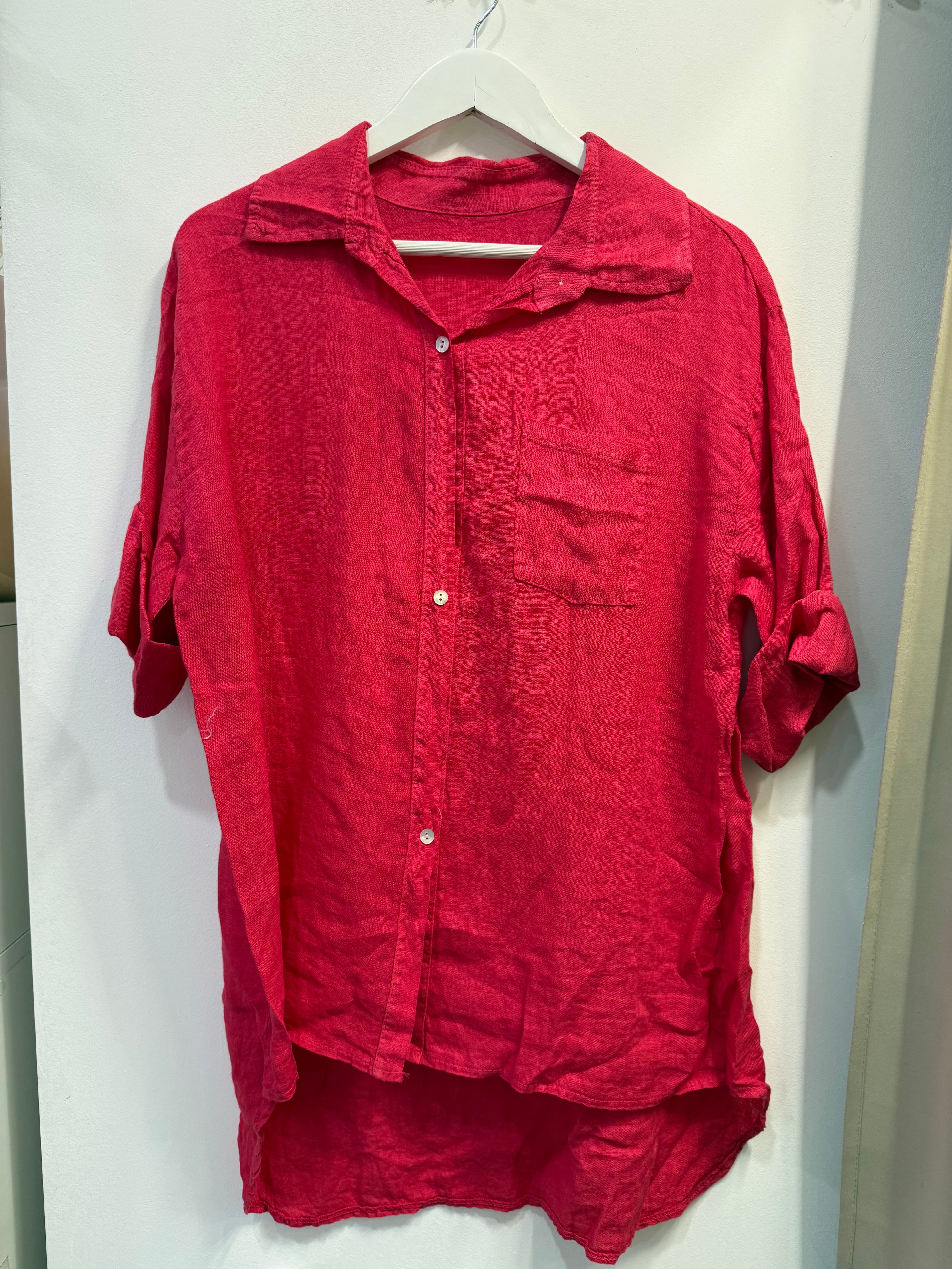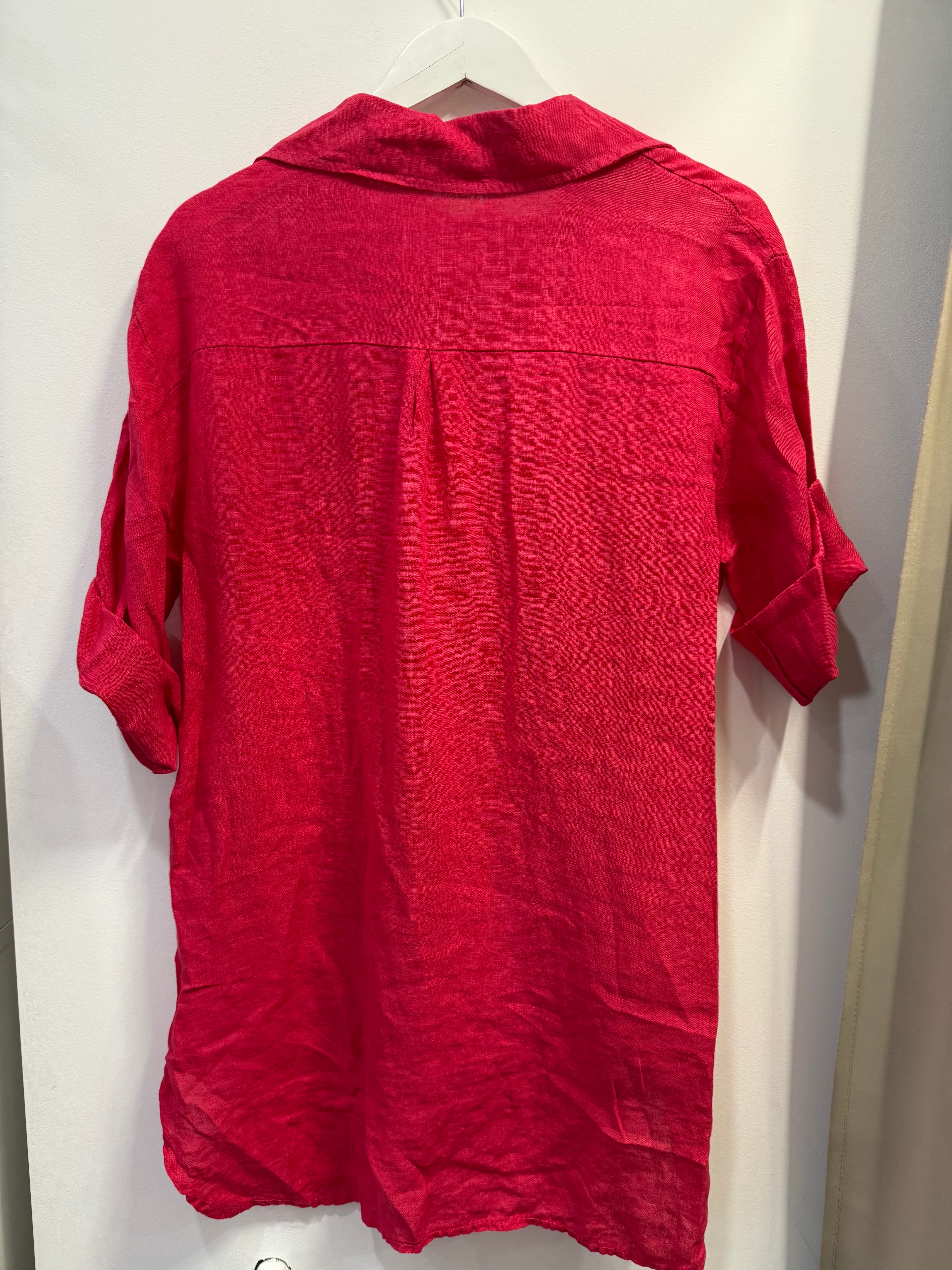 Koszula lniana Luigia koralowa długa, swobodna z kieszonką na dekolcie