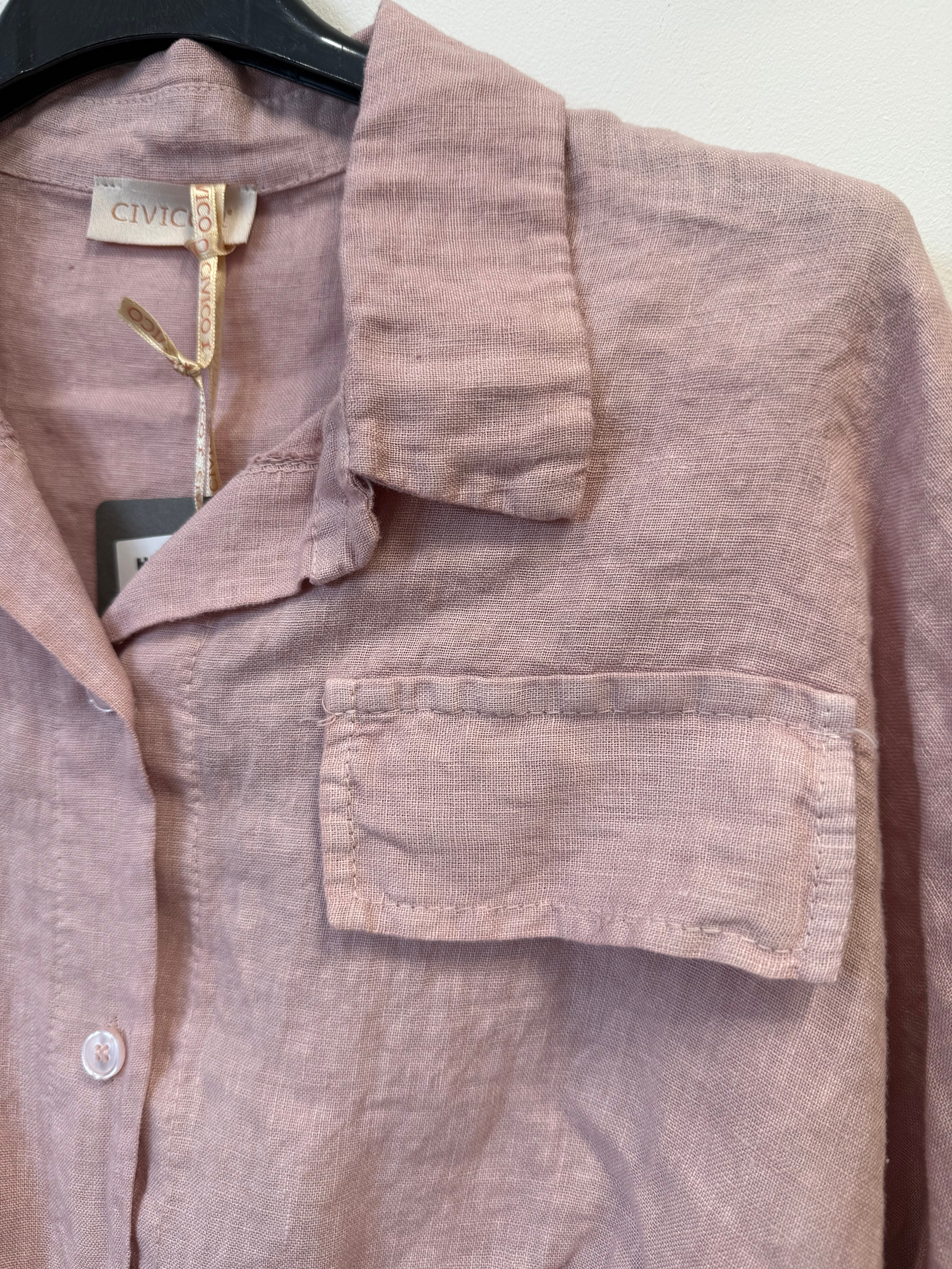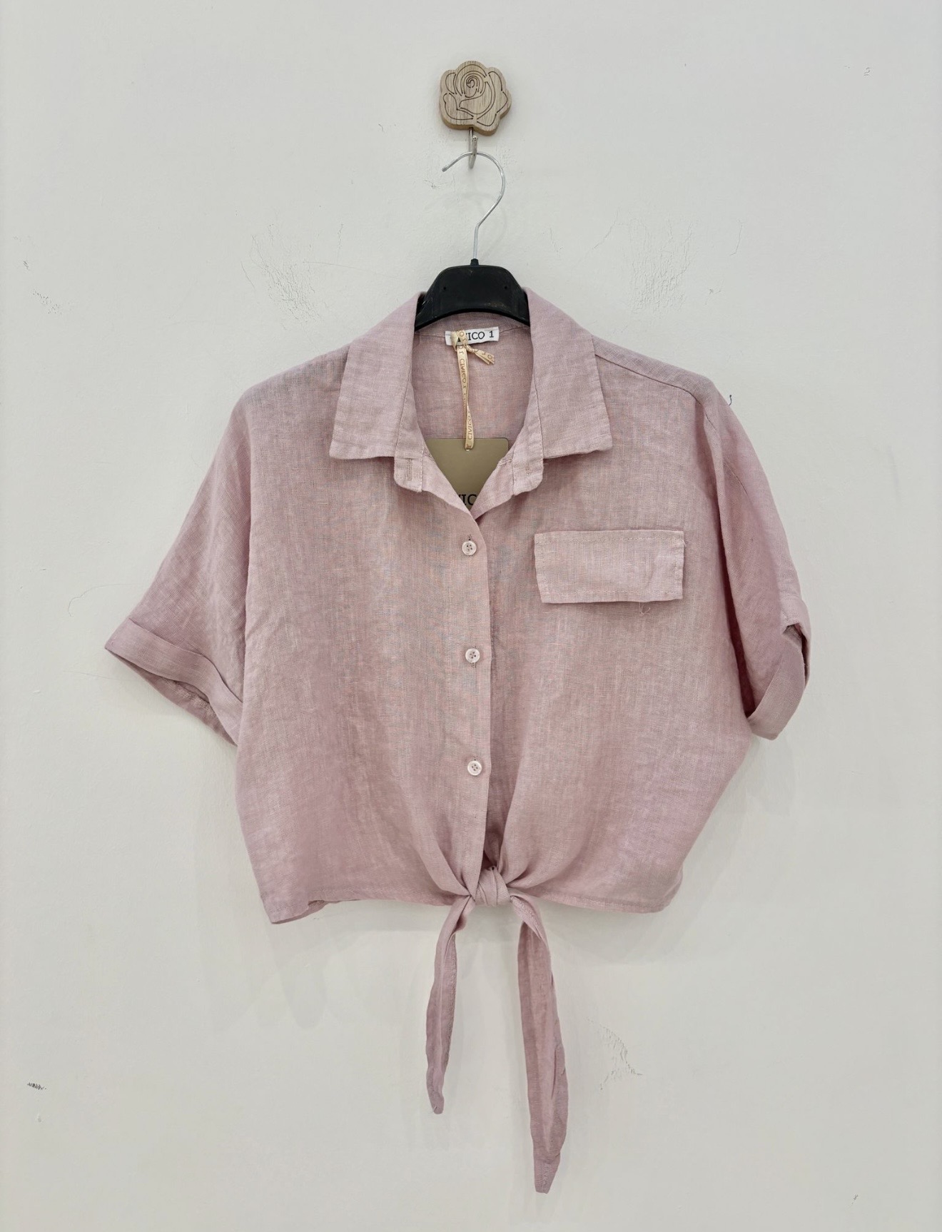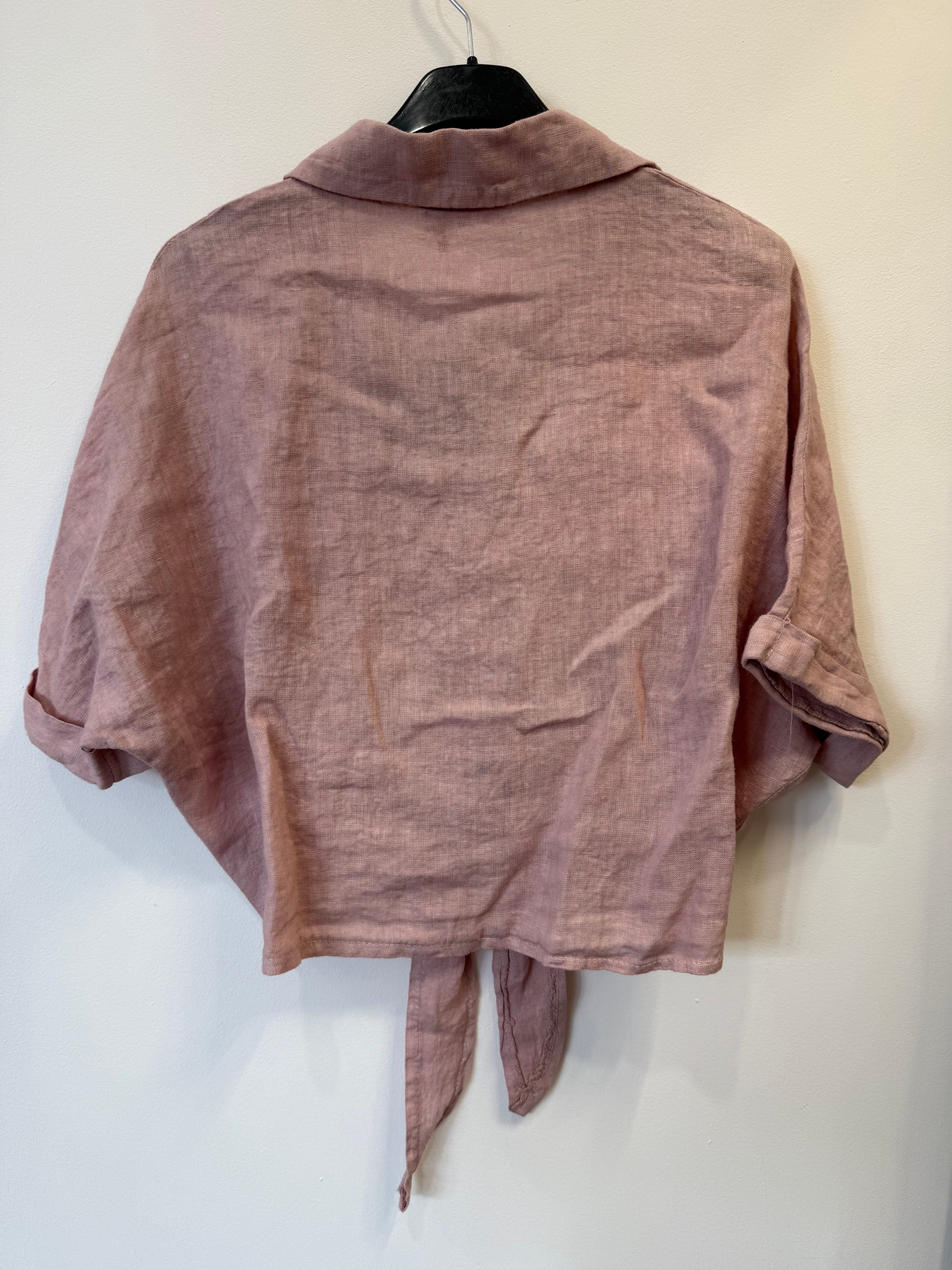 Koszula lniana Marisa pudrowy róż, z wiązaniem, krótka