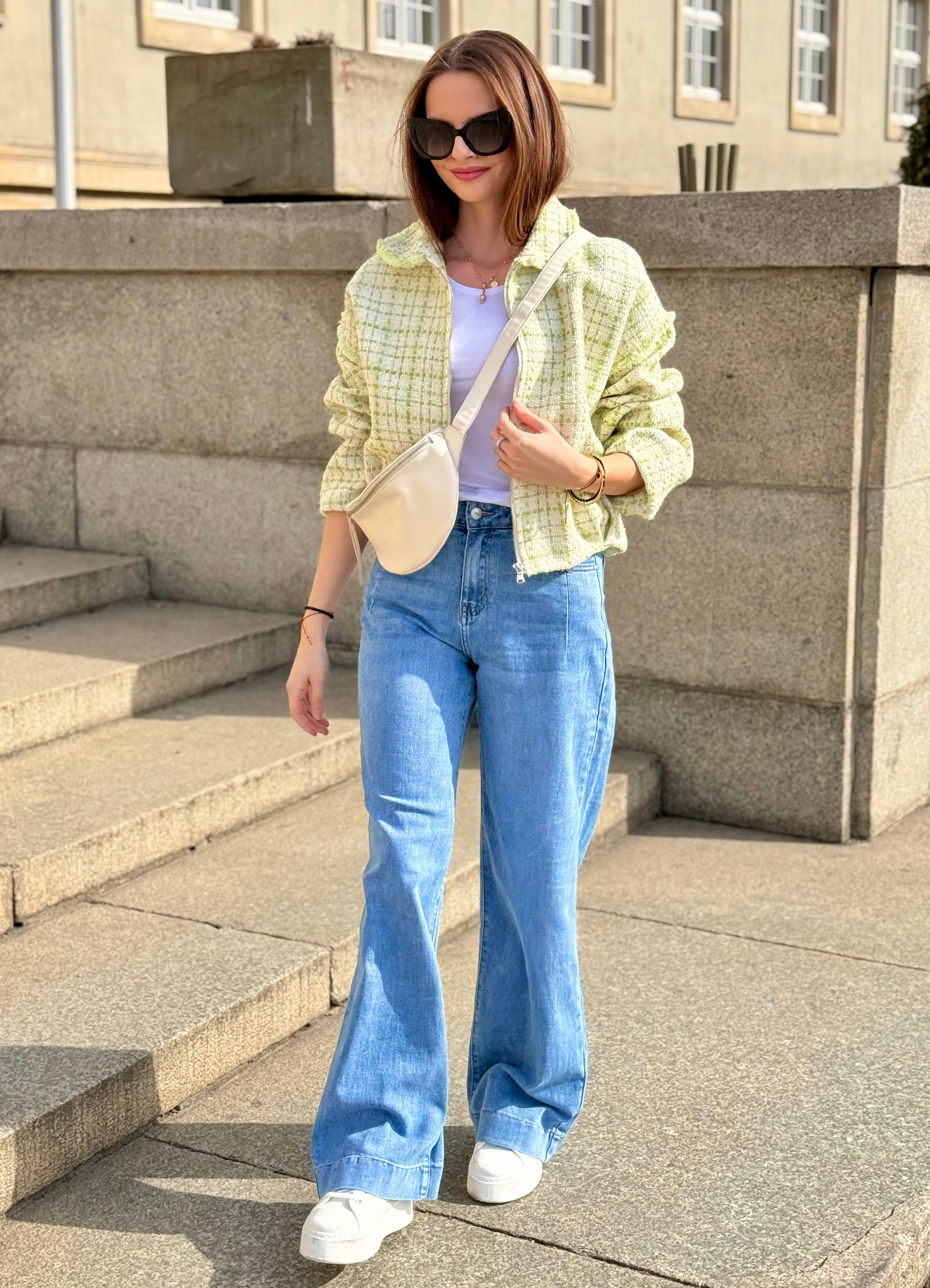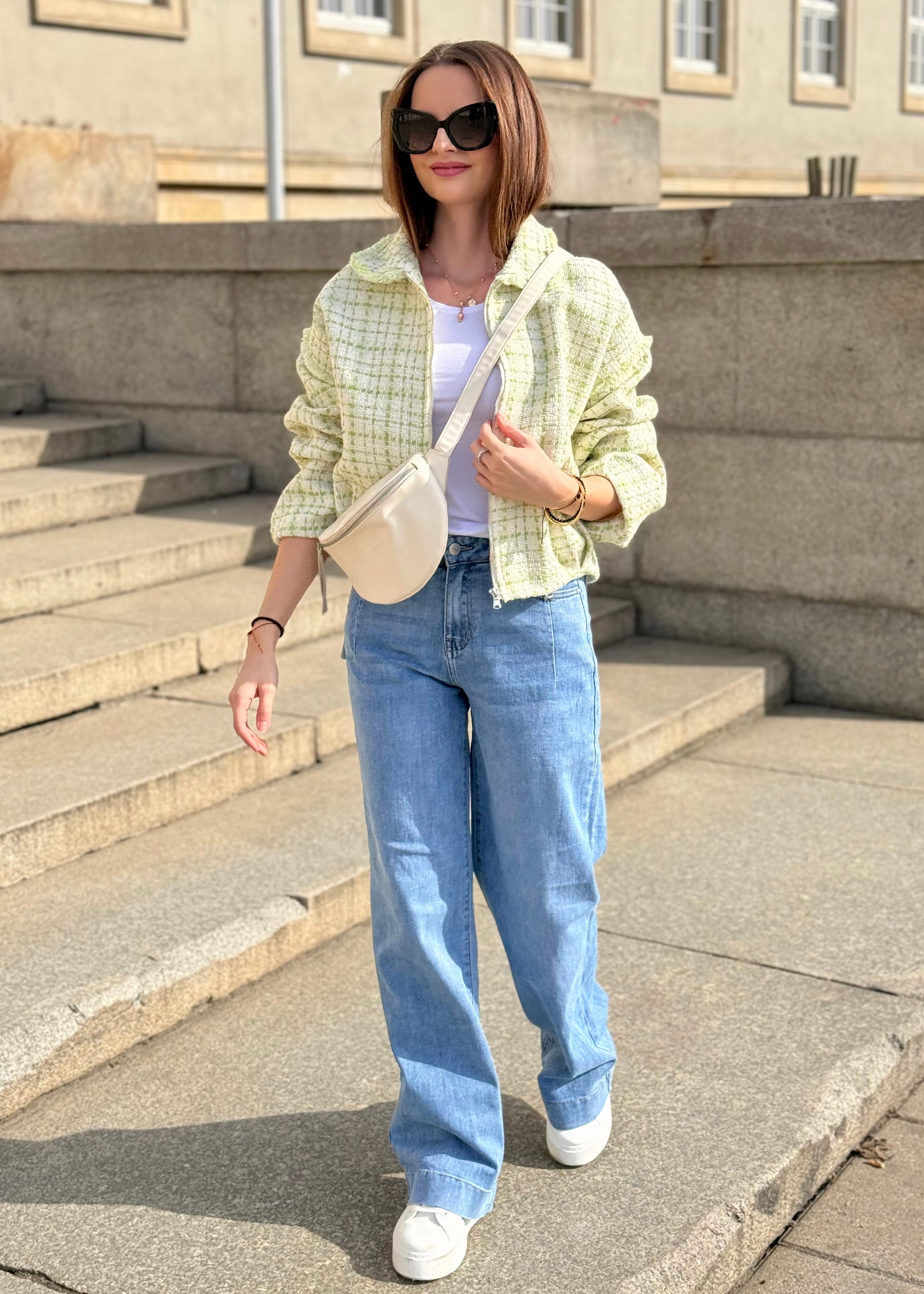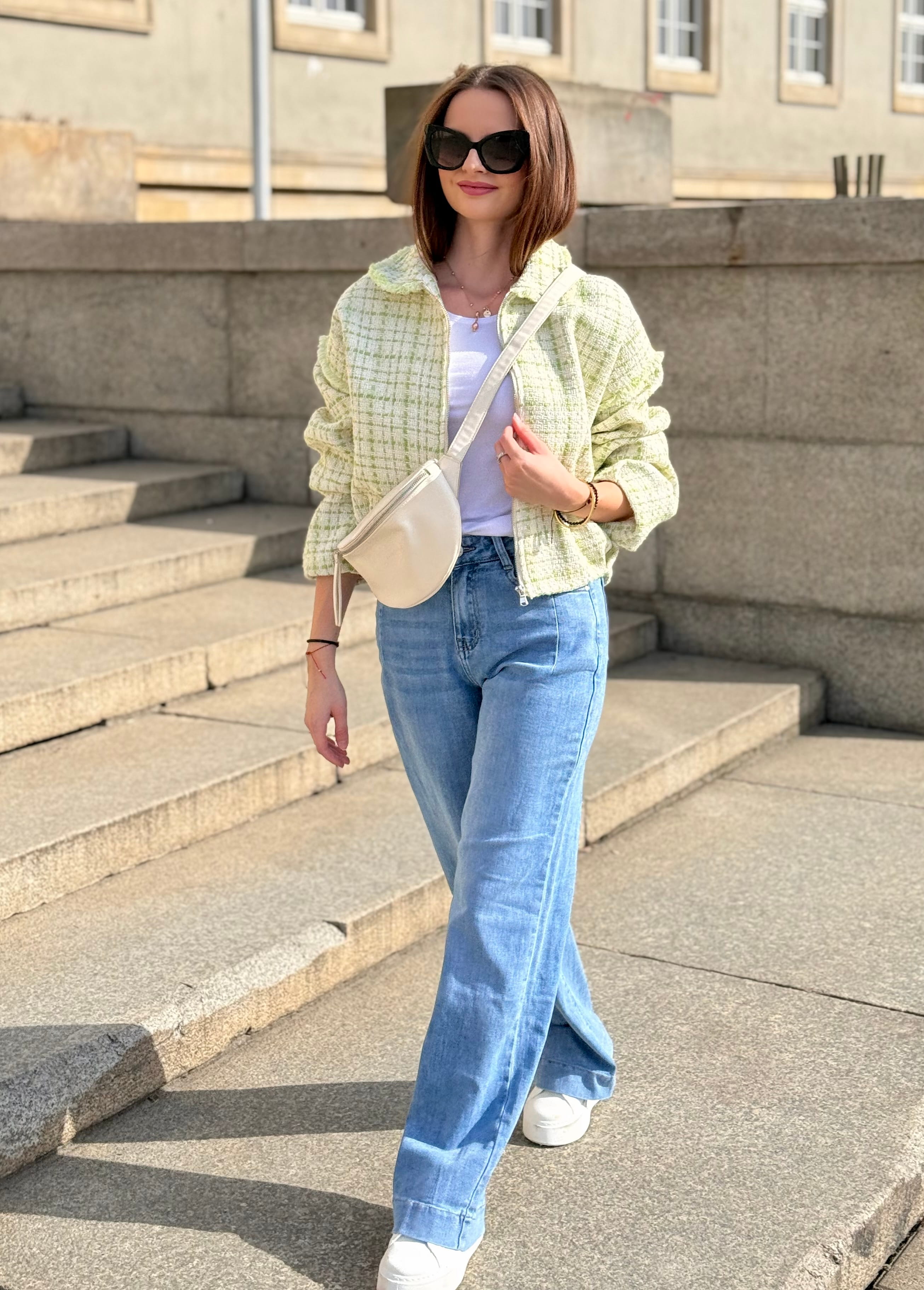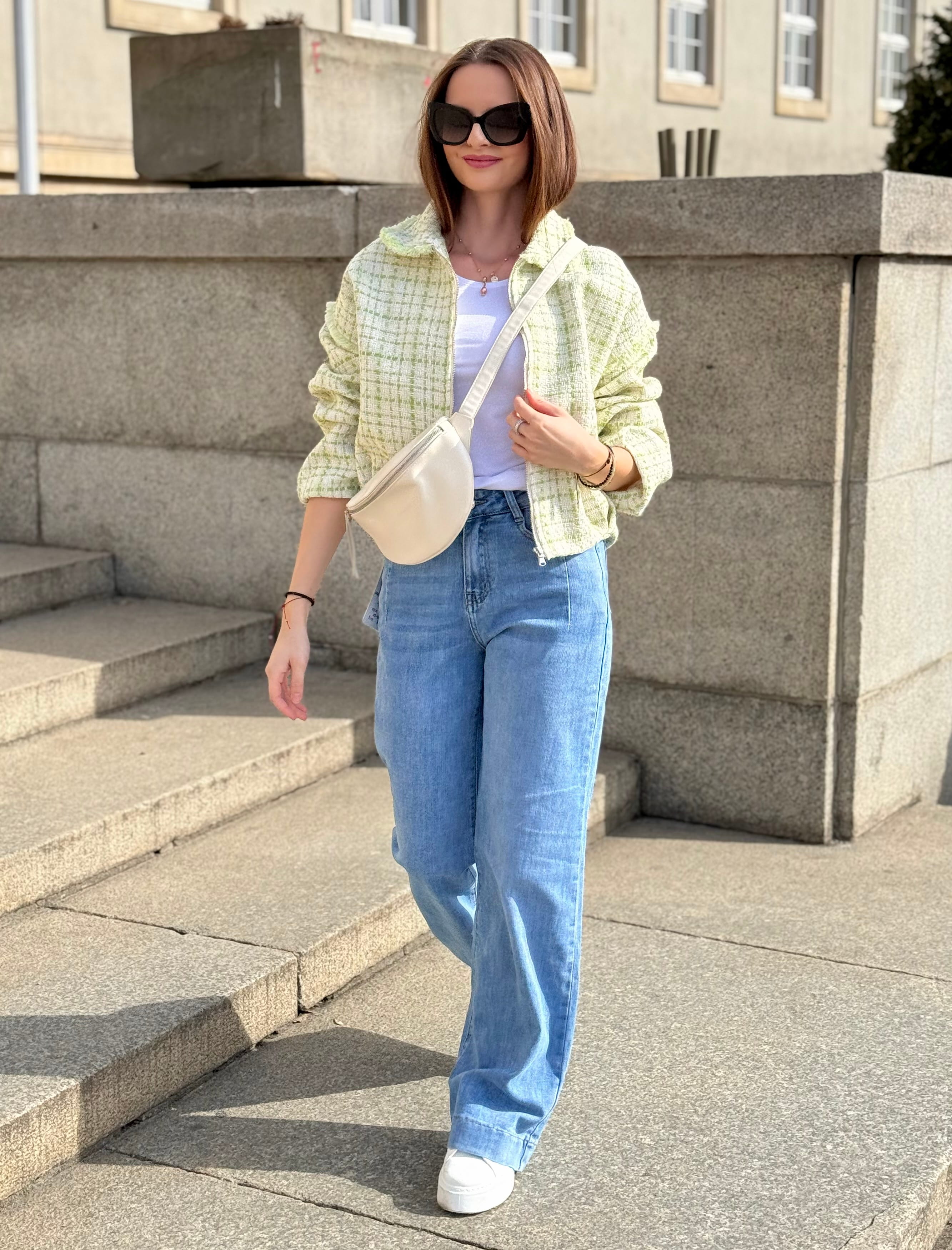 Kurtka Marinella a la bomberka szykowna, z zakładkami tweedowa biało-zielona, na zamek,