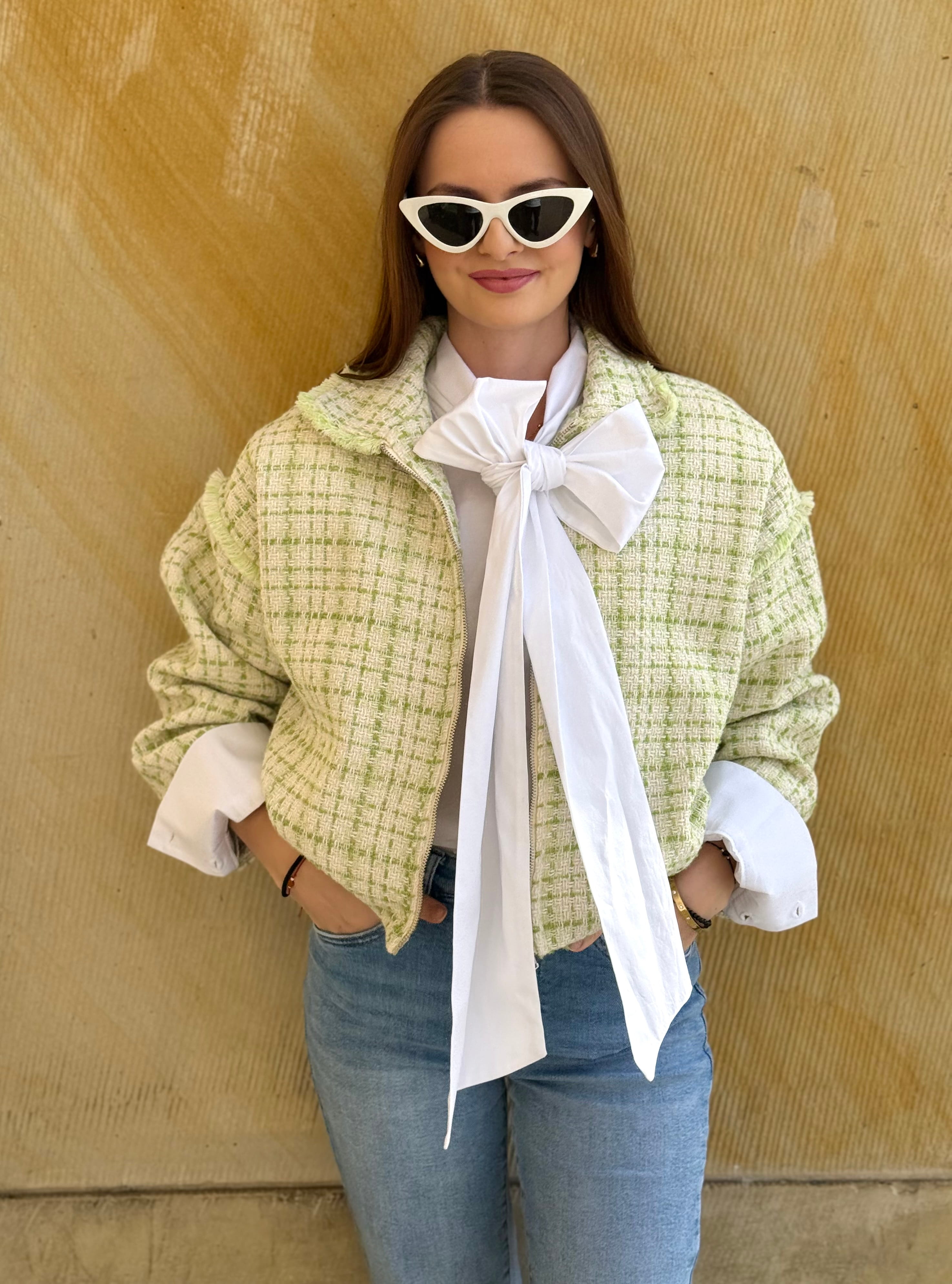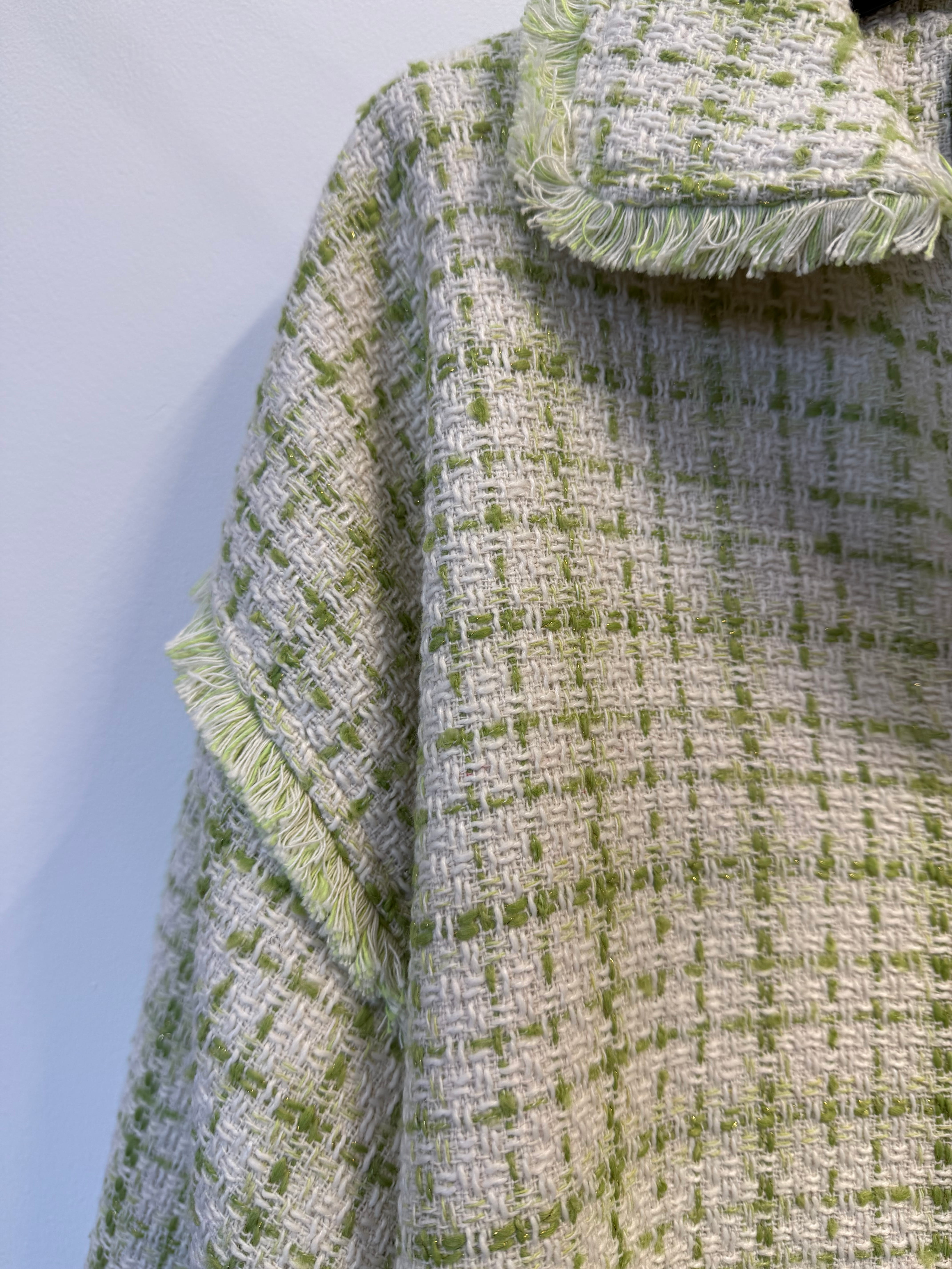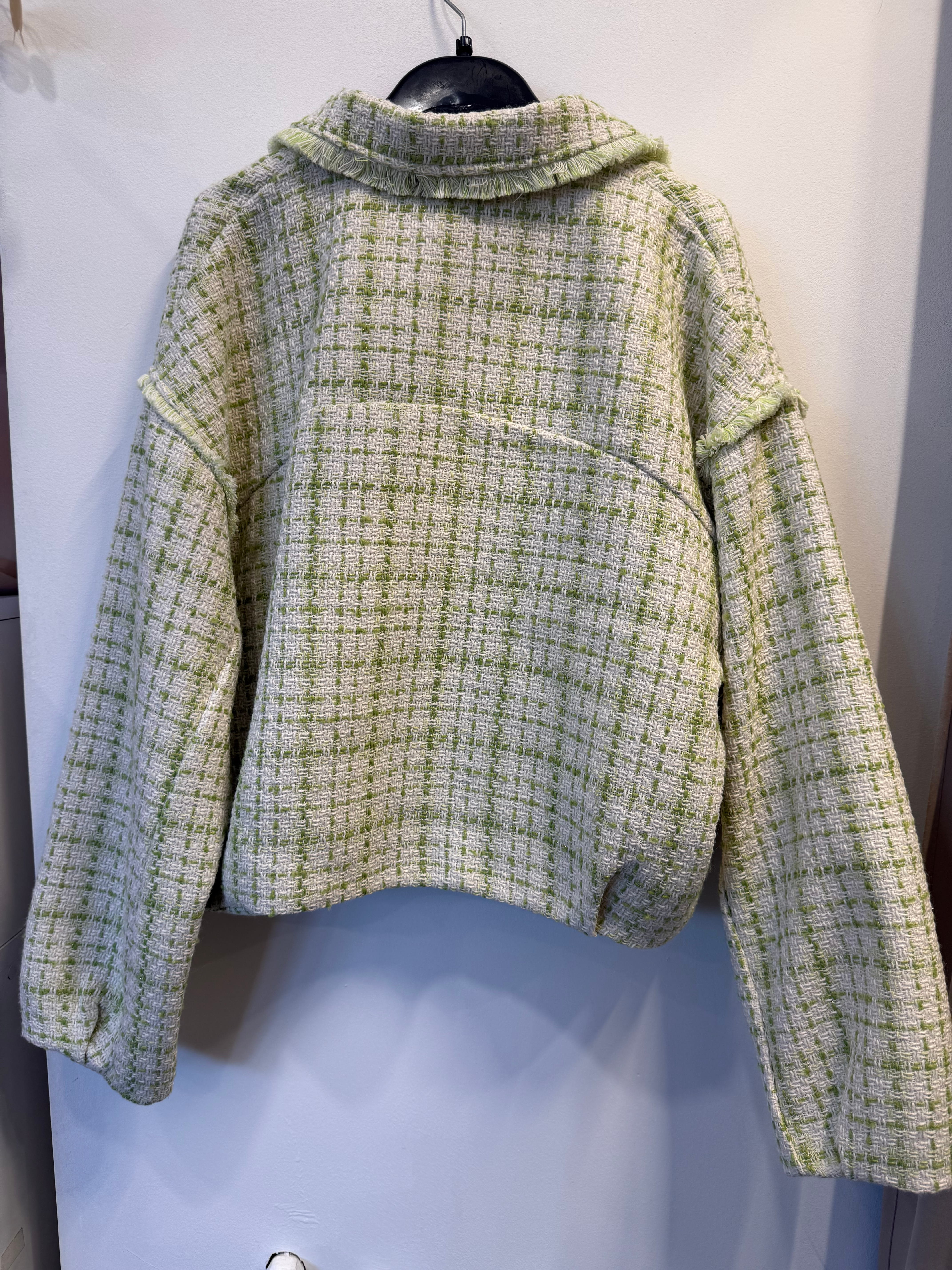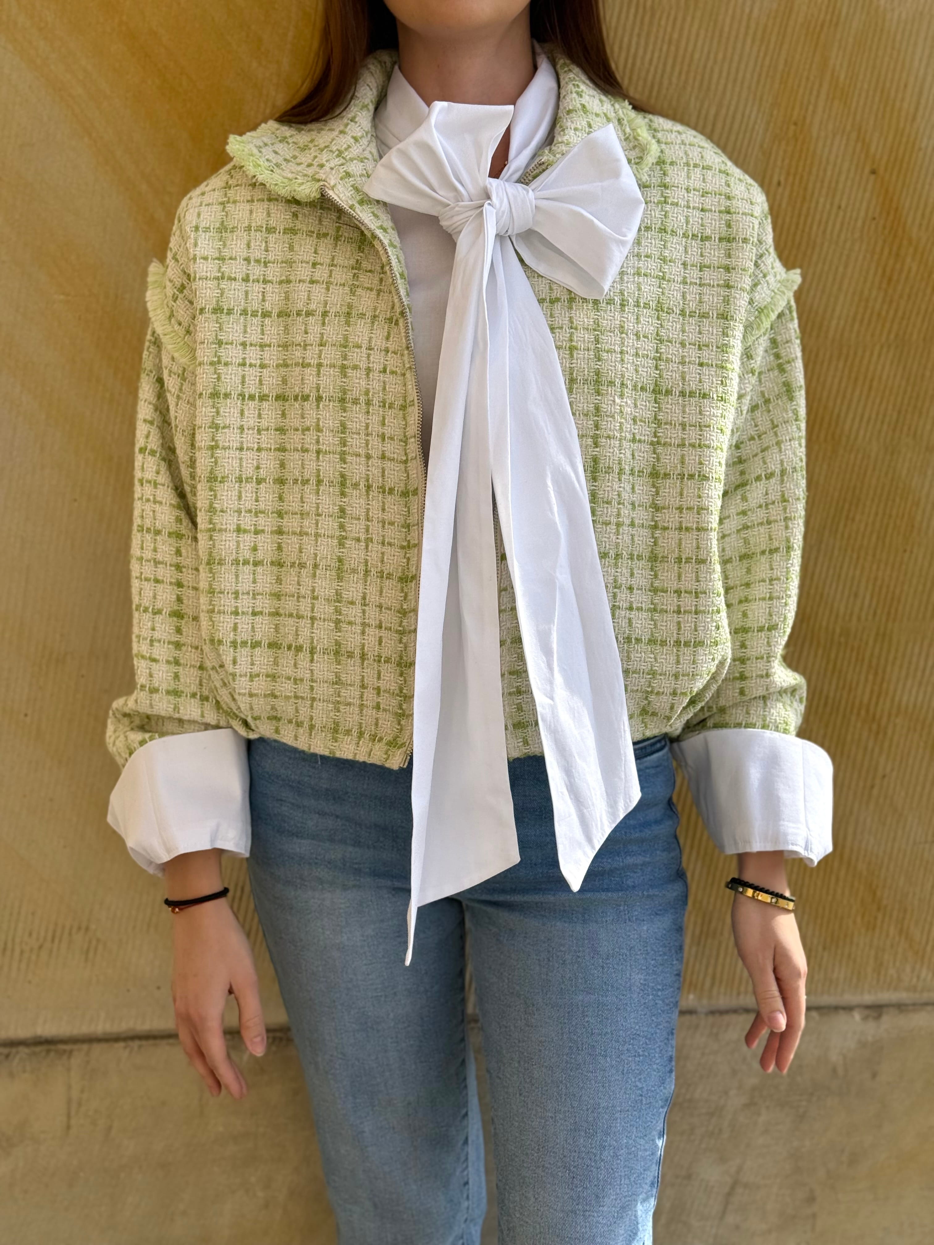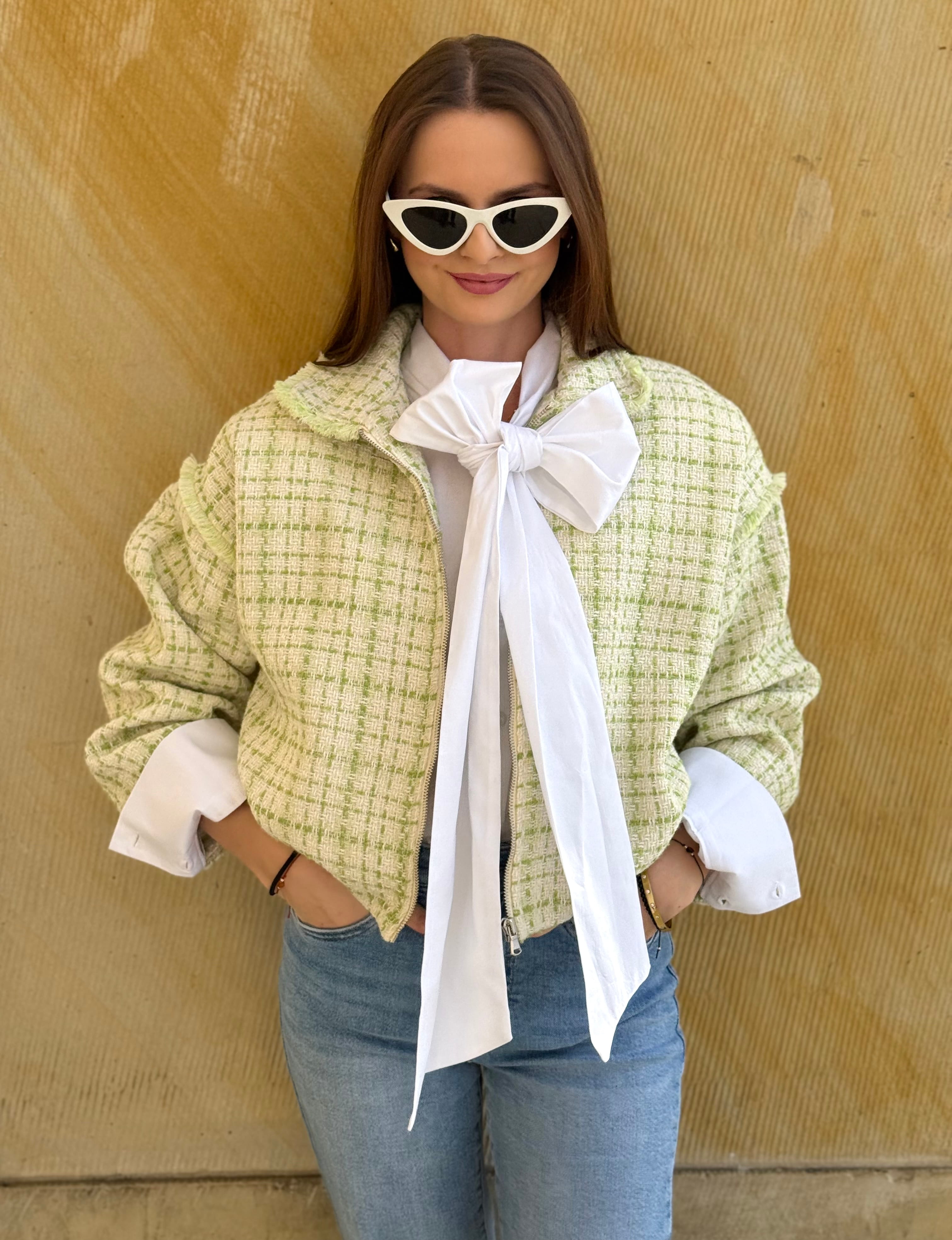 Kurtka Marinella a la bomberka szykowna, z zakładkami tweedowa biało-zielona, na zamek,