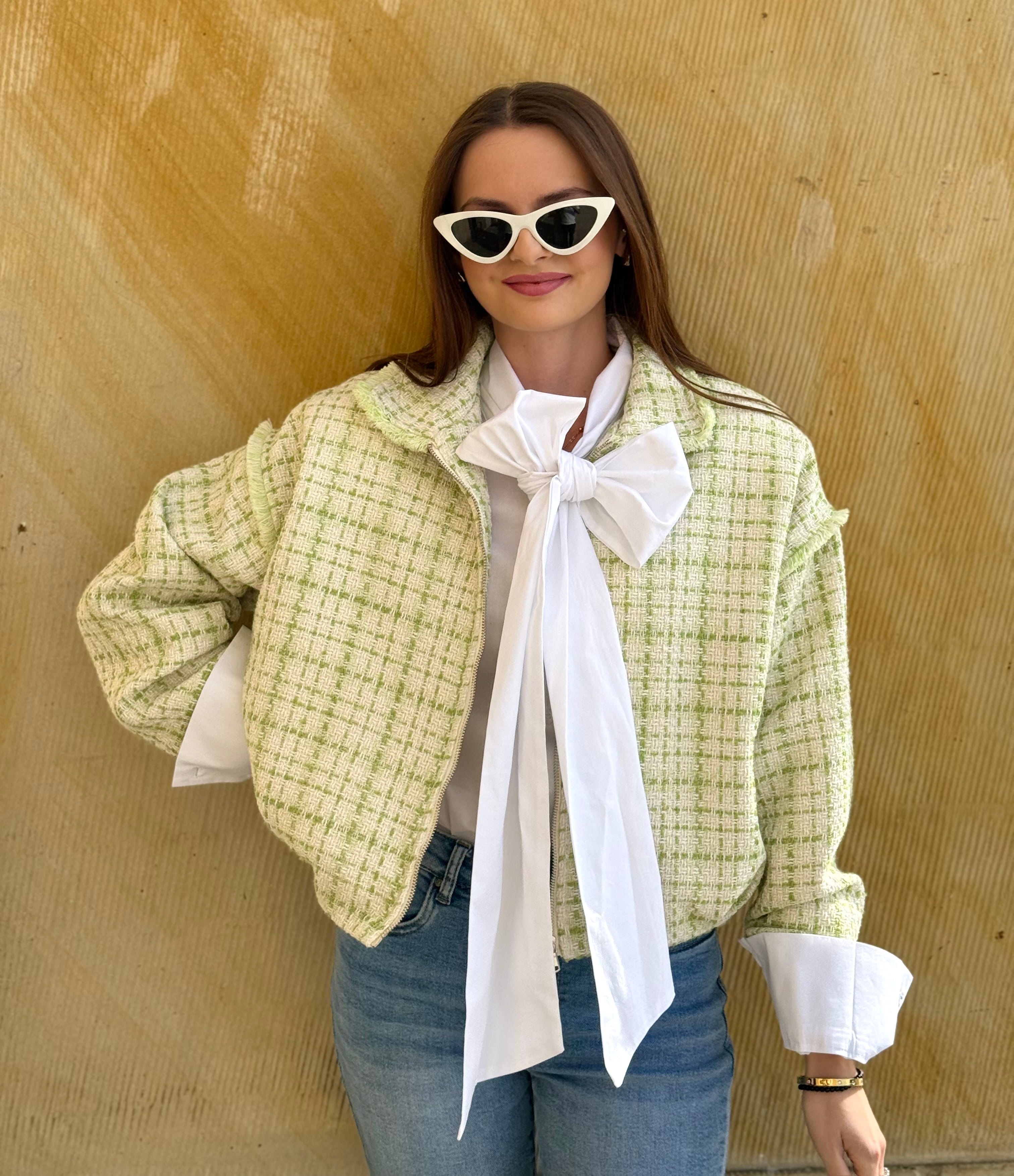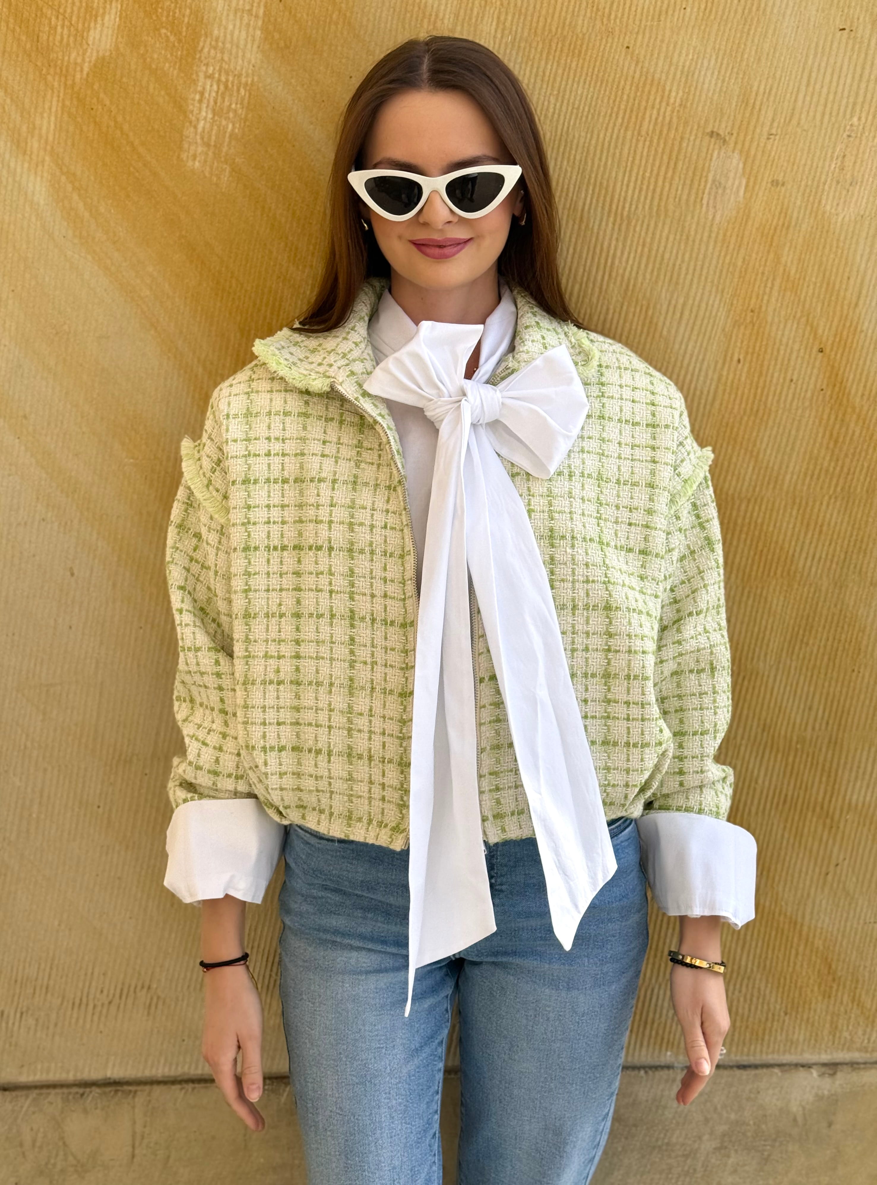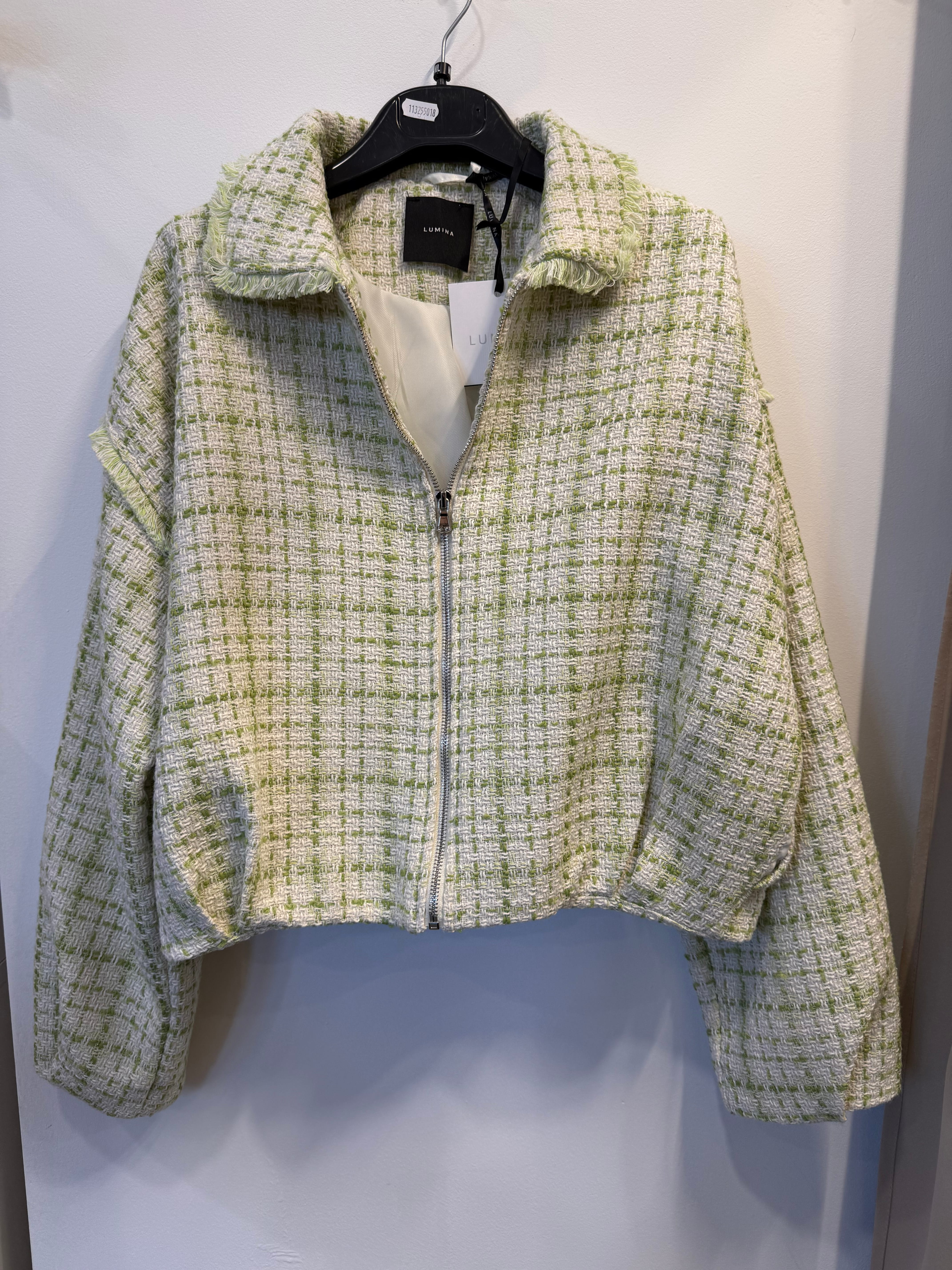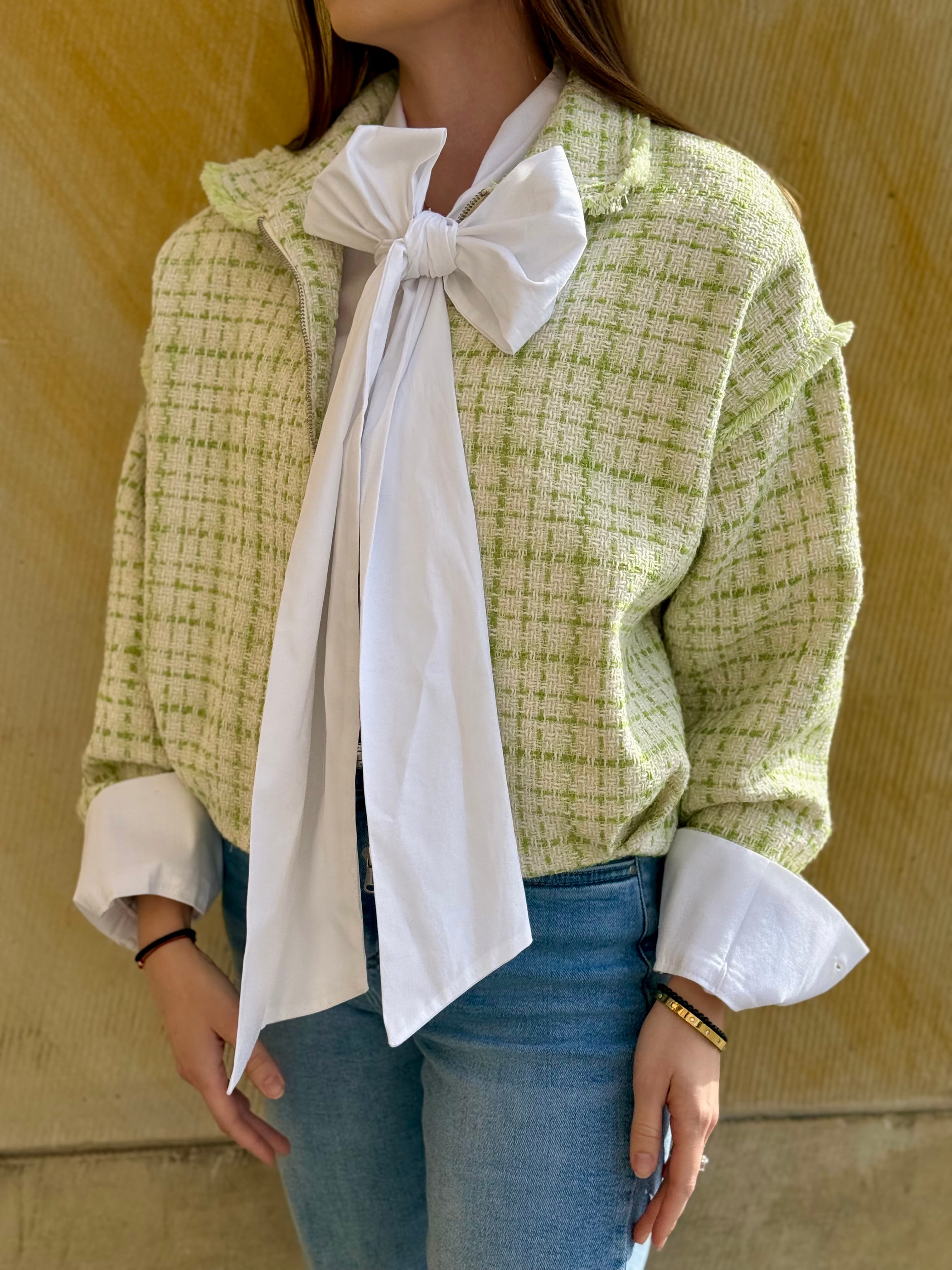 Kurtka Marinella a la bomberka szykowna, z zakładkami tweedowa biało-zielona, na zamek,