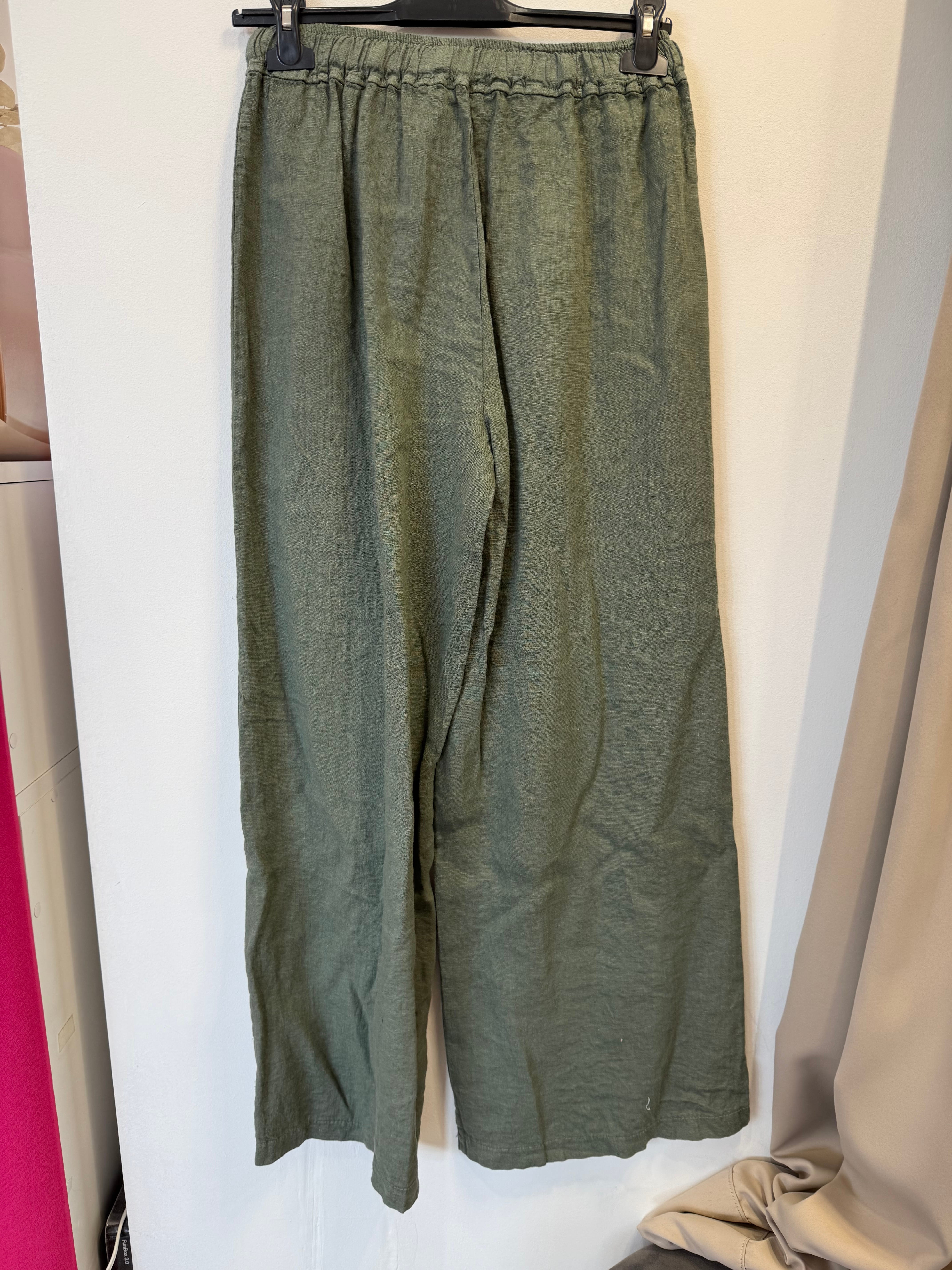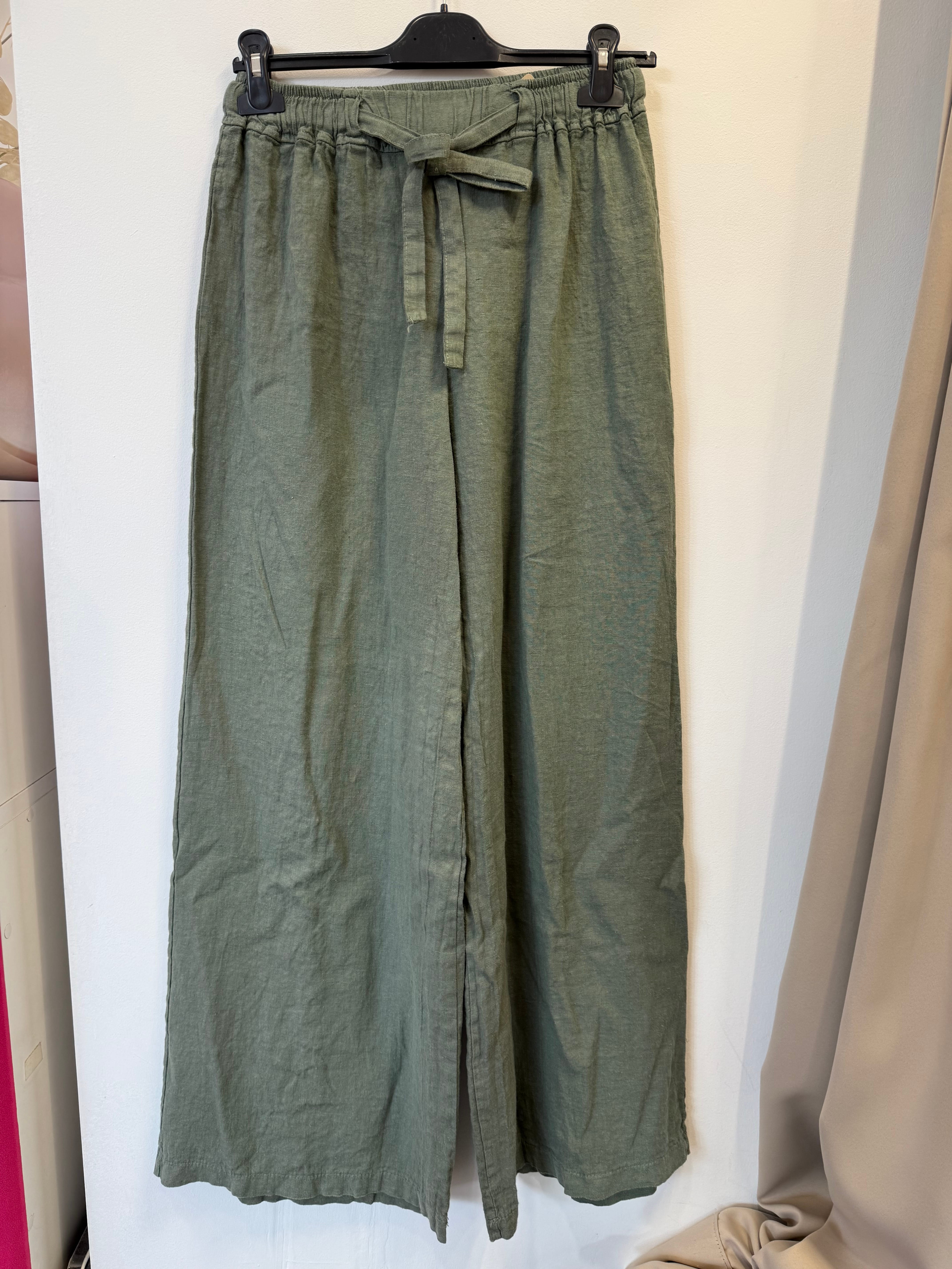 Spodnie Gaetana lniane khaki z wiązaniem paskiem, proste szerokie nogawki