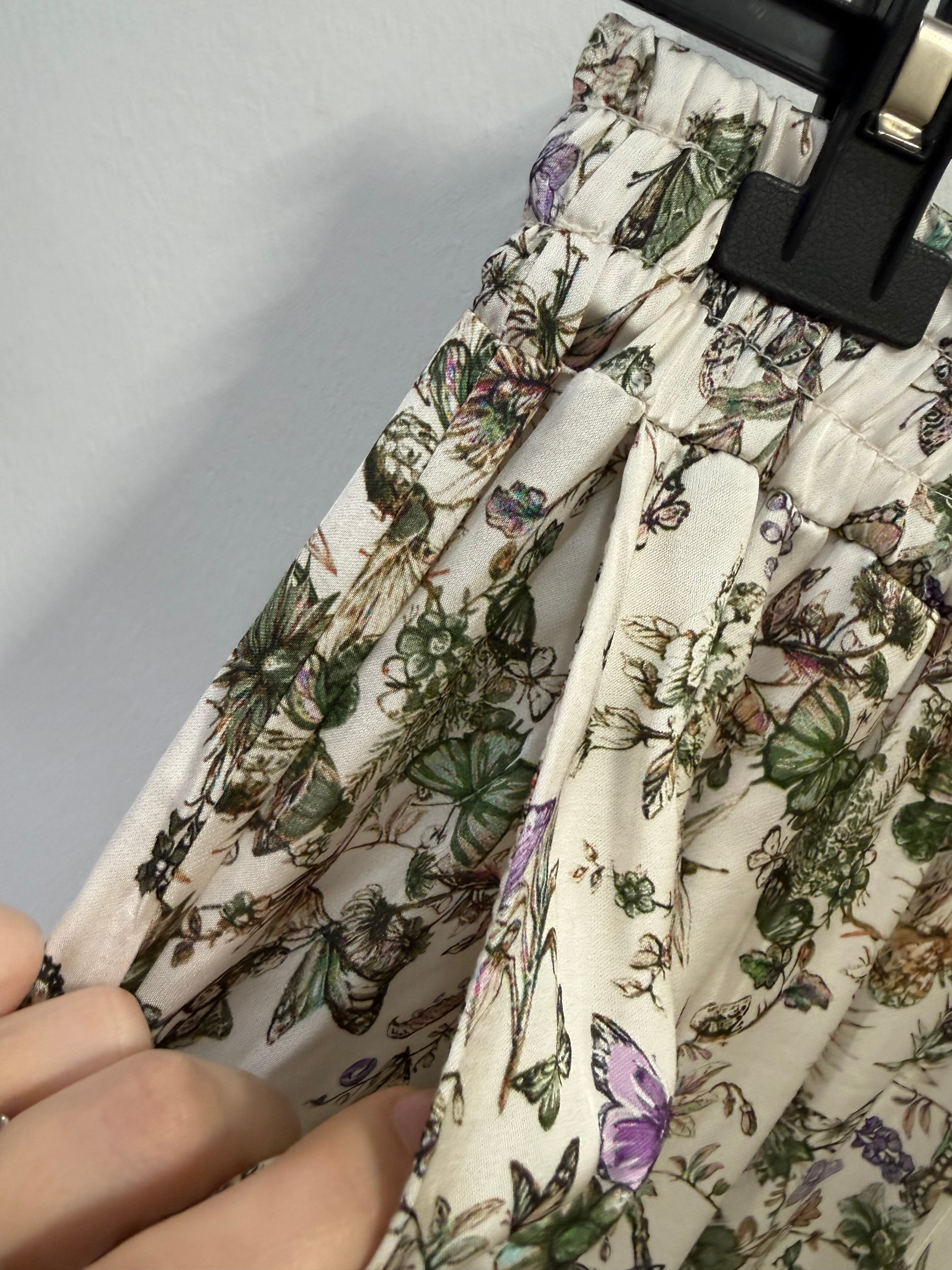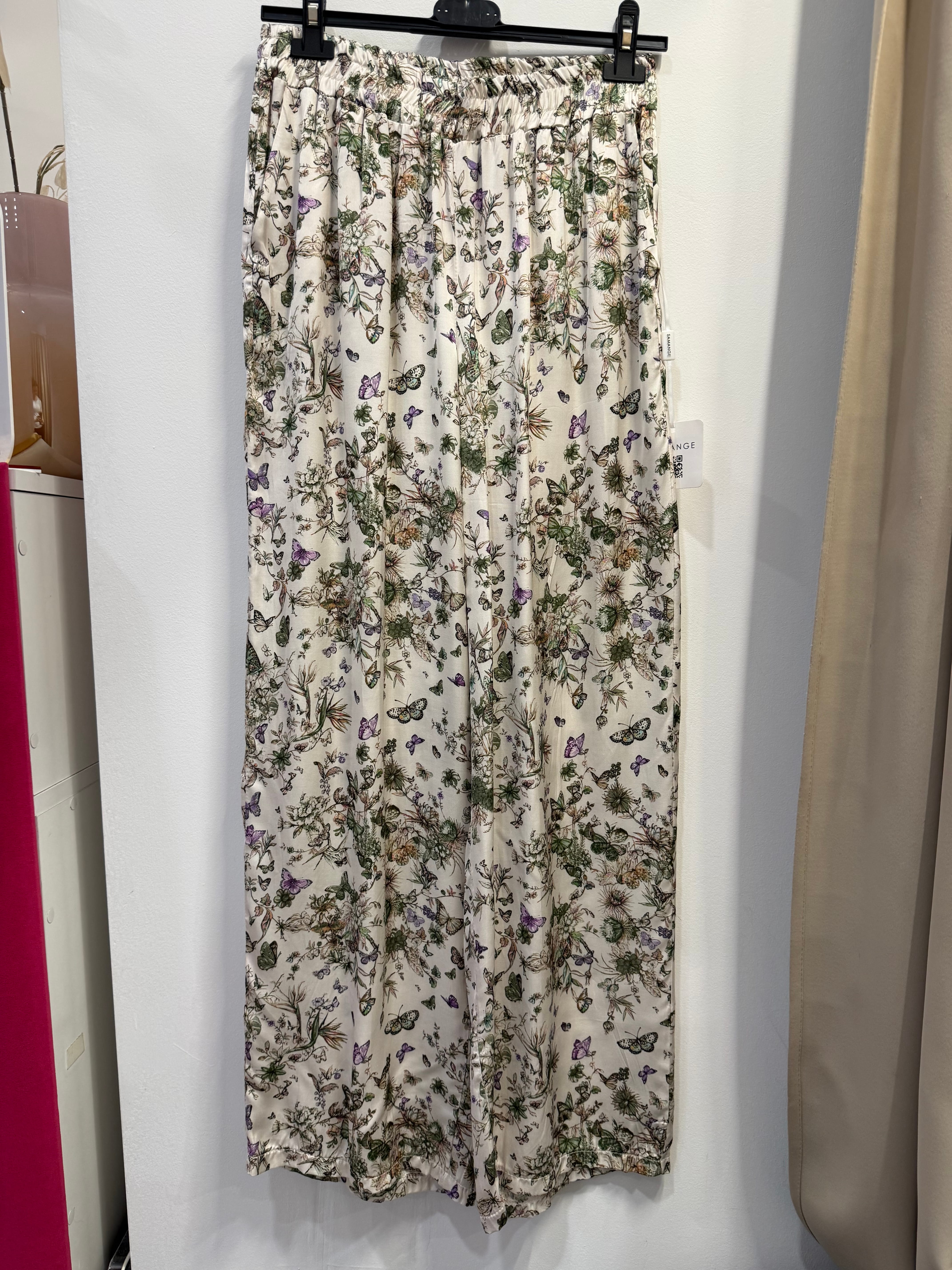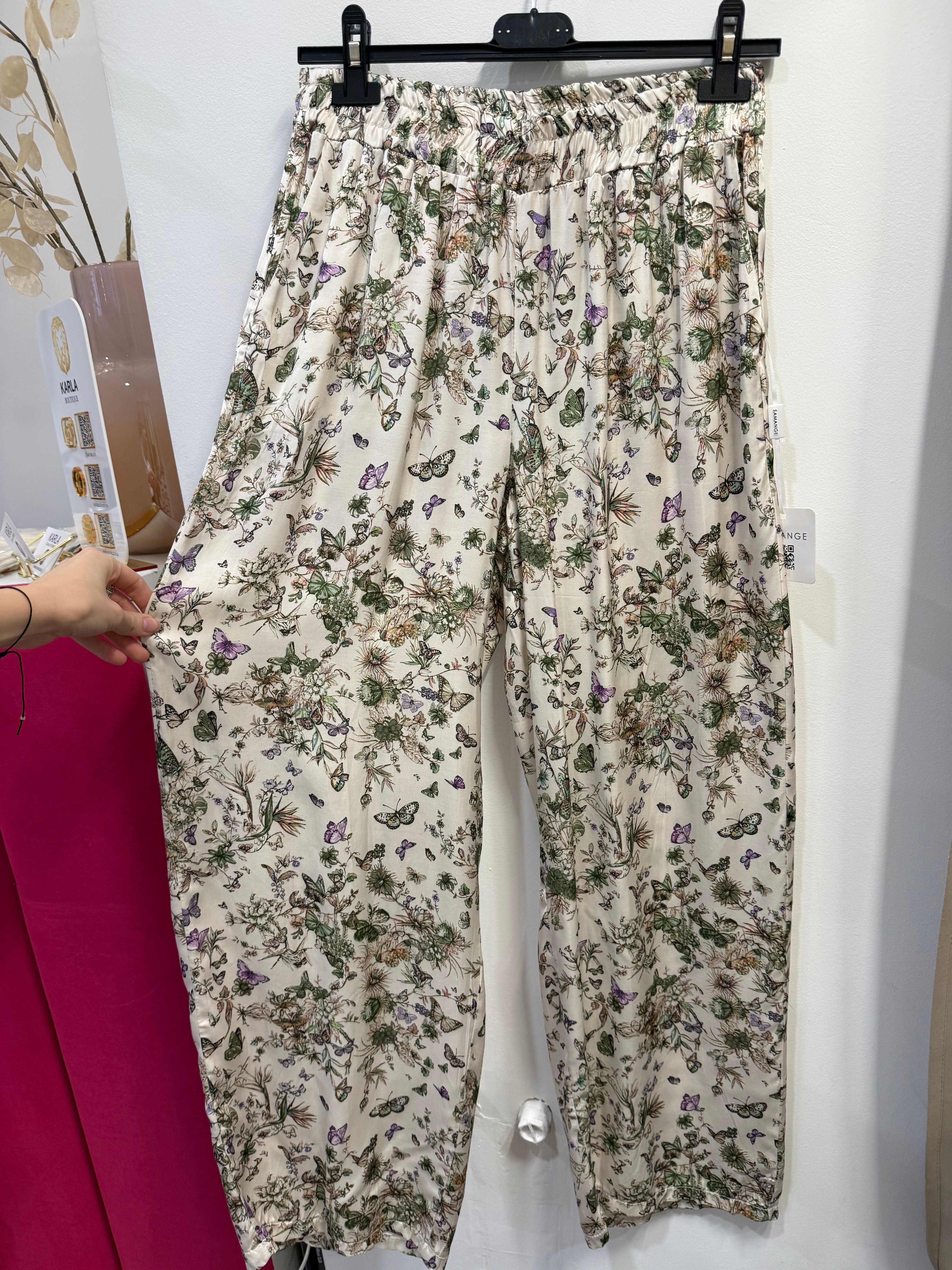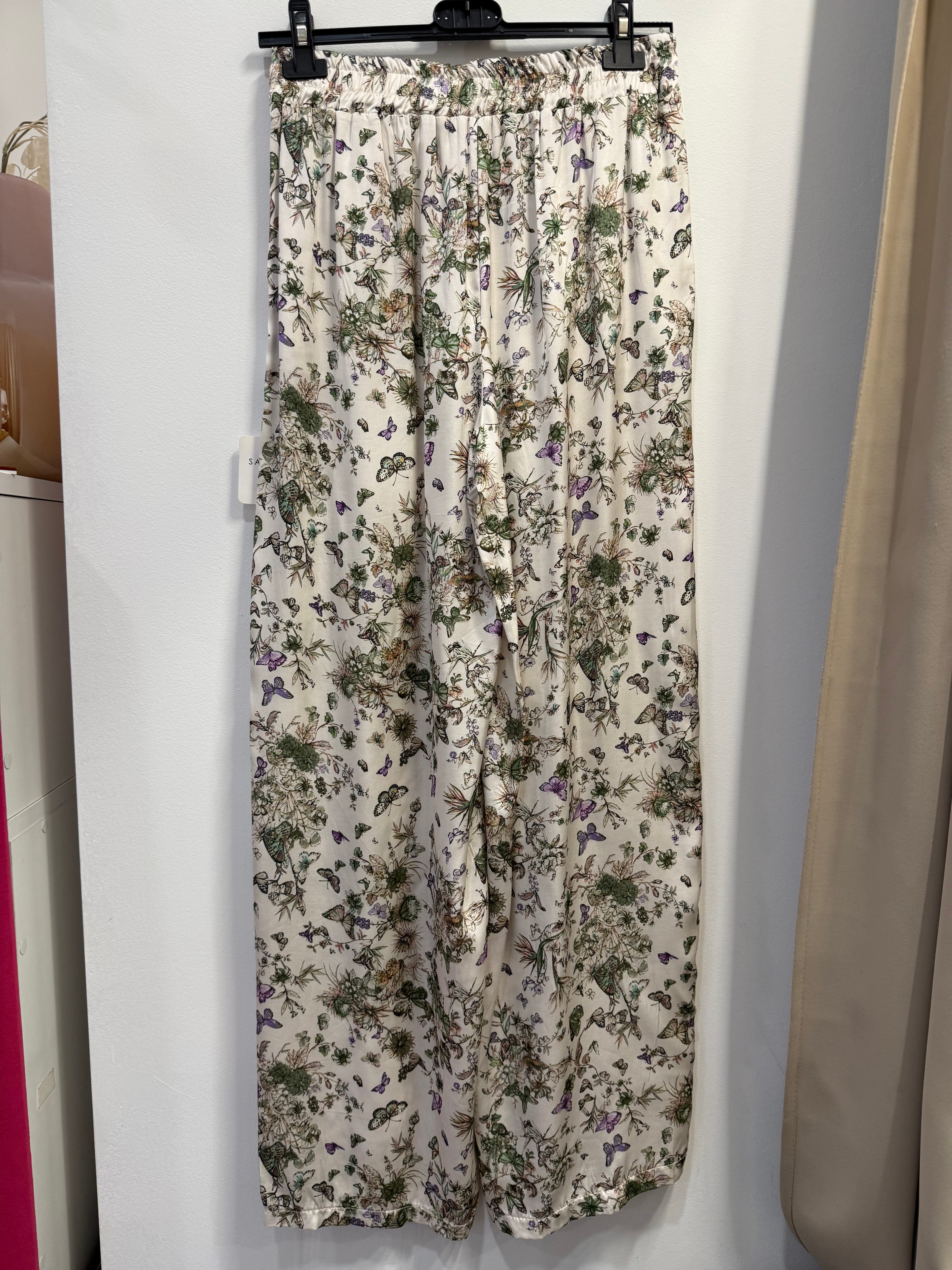Spodnie Pienza w motyle, rośliny, z wiskozy, satynowe, proste, szersze