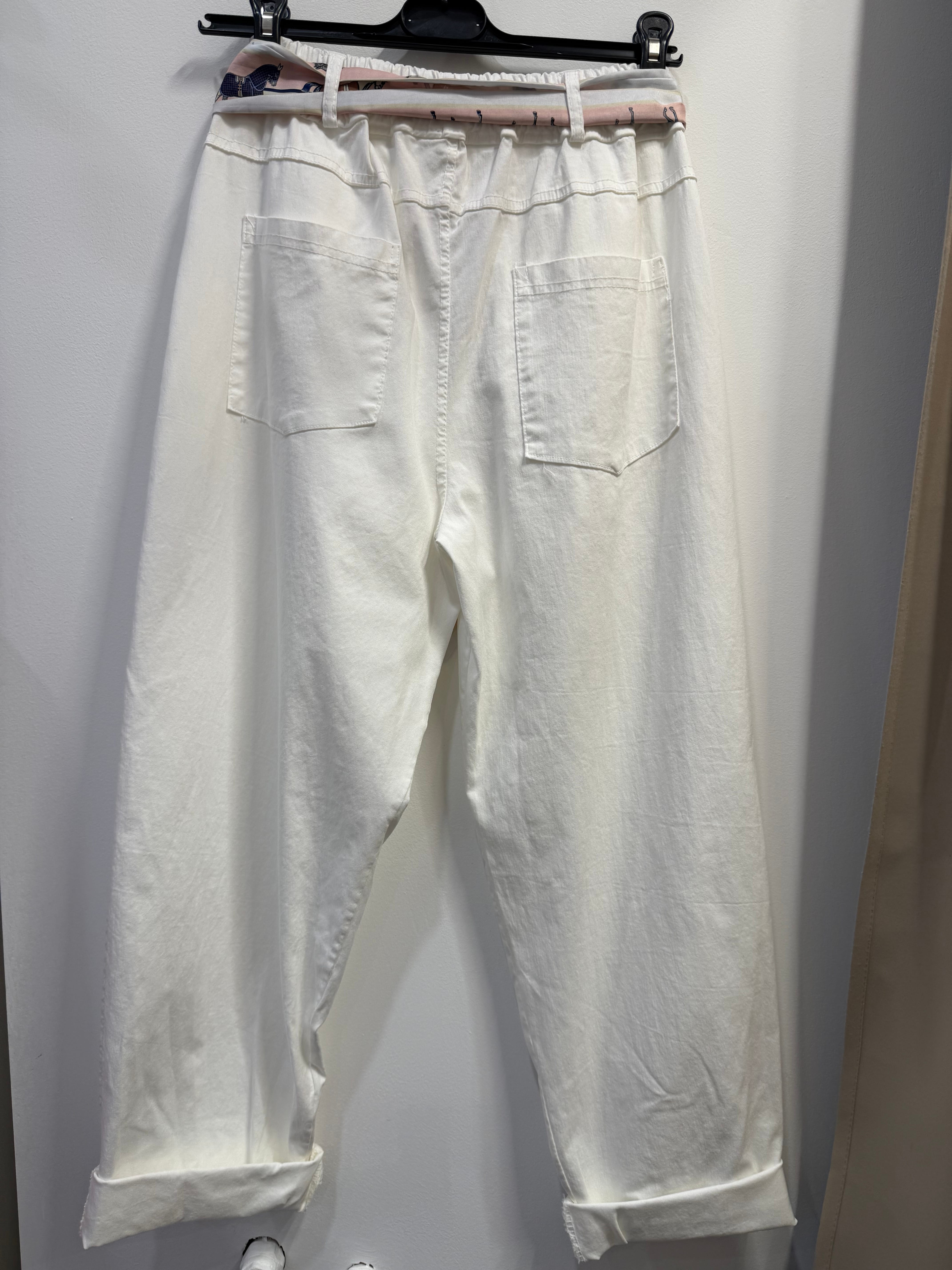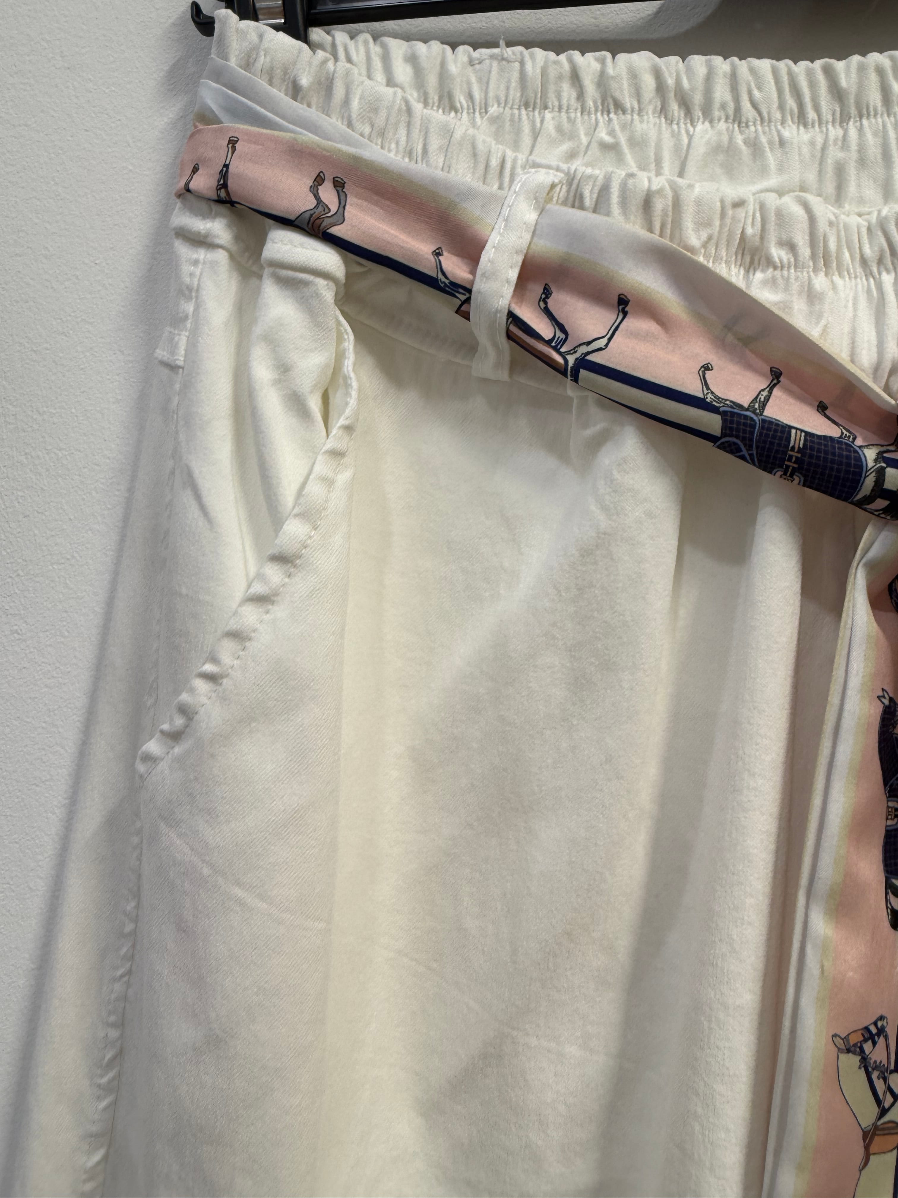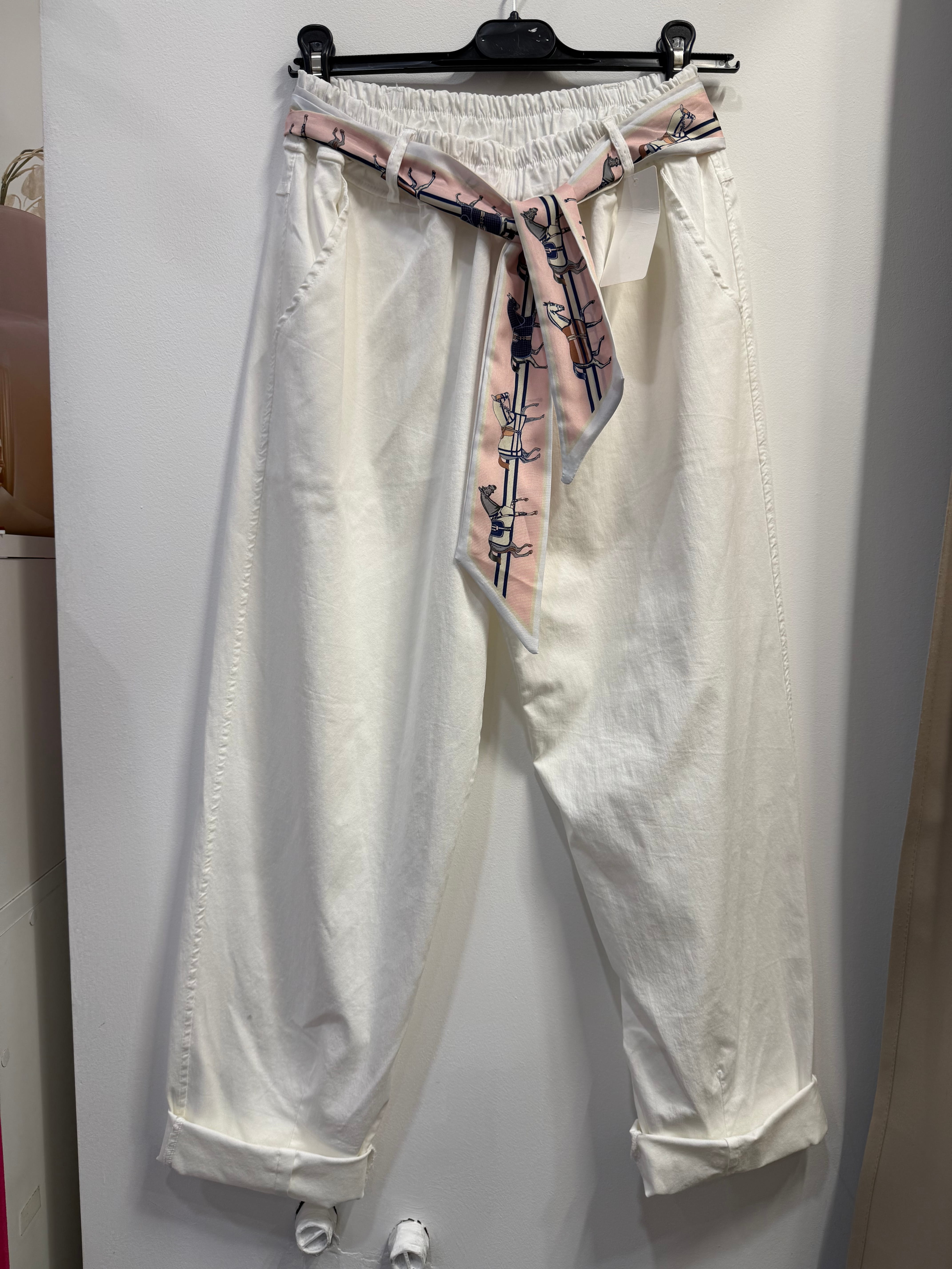 Spodnie Susanna bawełniane, białe z apaszką na wiosnę/lato, zwężane do dołu