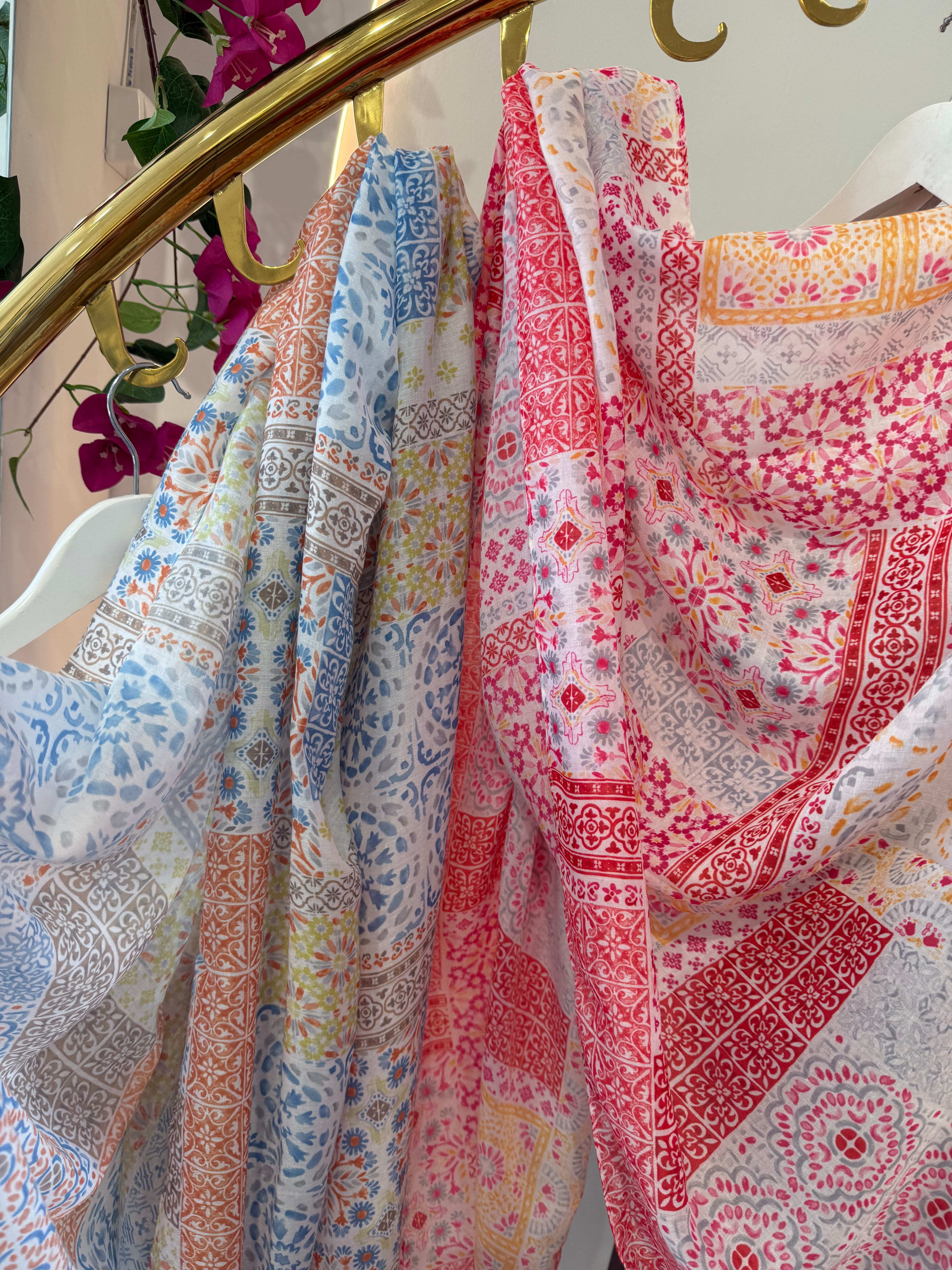 Szal Mediterraneo w mozaikę/mozaikowy niebieski i różowy z wiskozy, duży